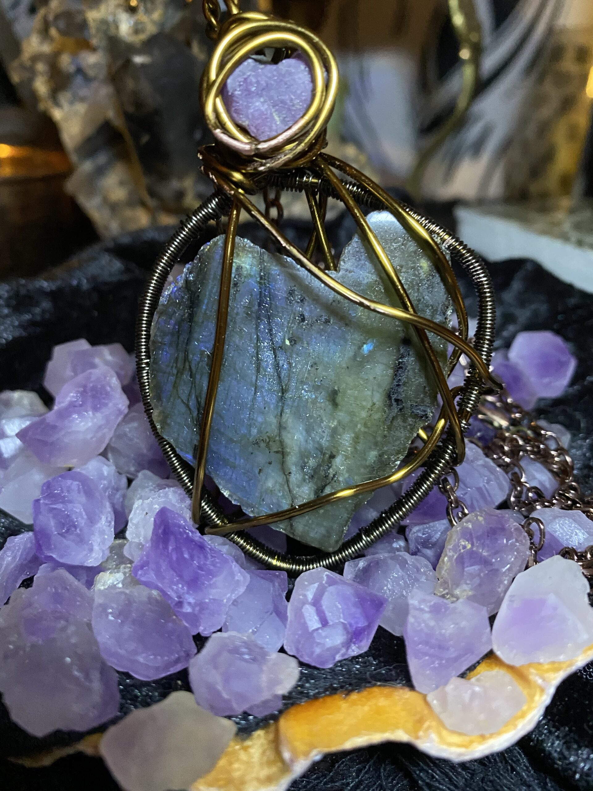 Heart shaped labradorite and heart shaped purple garnet wrapped in antique and dark blue colored copper wire, comes hung on a chocolate colored metal chain. This piece is named for the Celtic goddess of love.