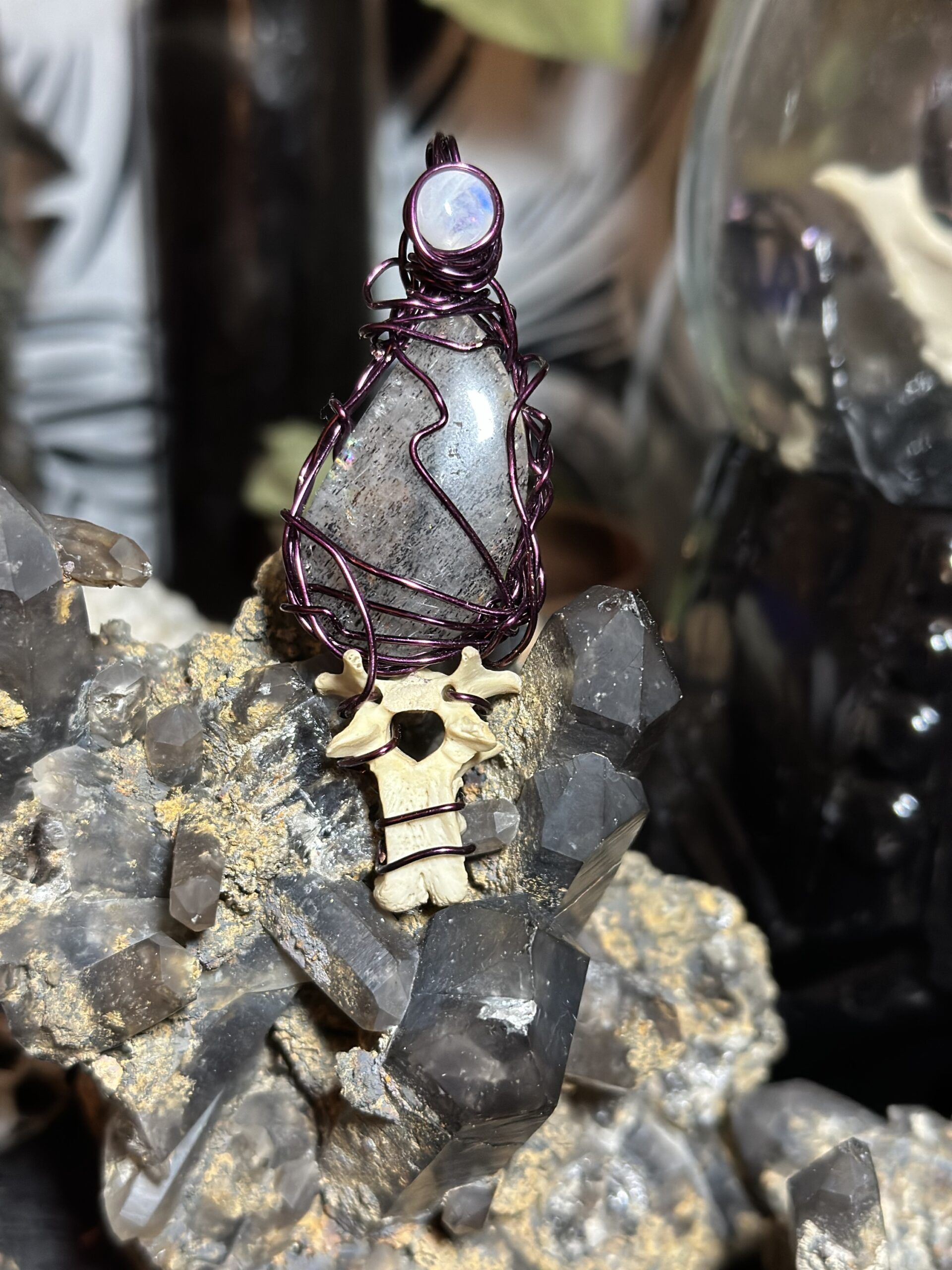 Rainbow moonstone and black quartz paired with an ethically sourced vertebrae wrapped in purple colored copper wire and hung on a copper chain