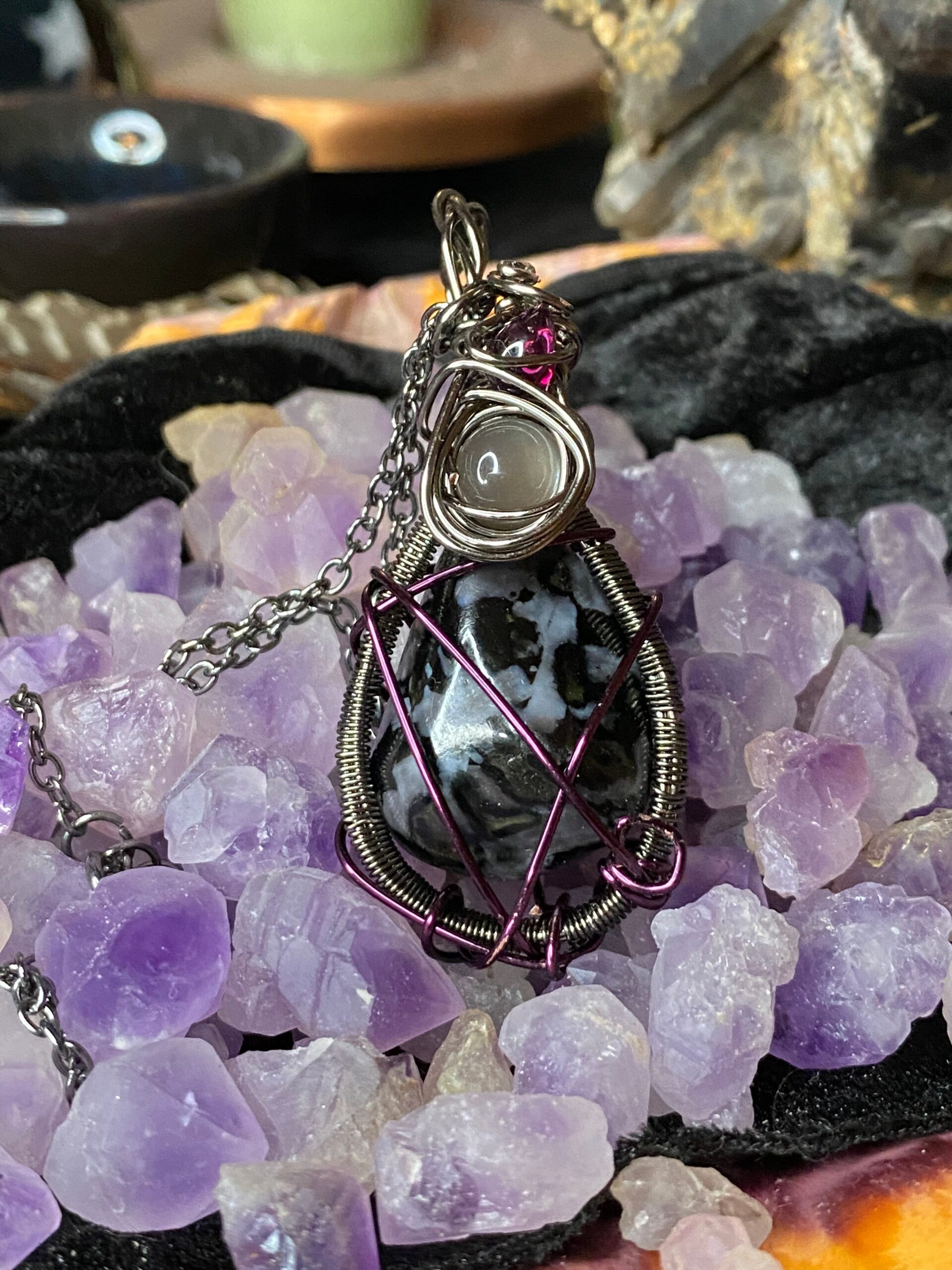 Indigo gabbro, grey moonstone and garnet wrapped in purple and gunmetal colored wire, hung on a black metal chain