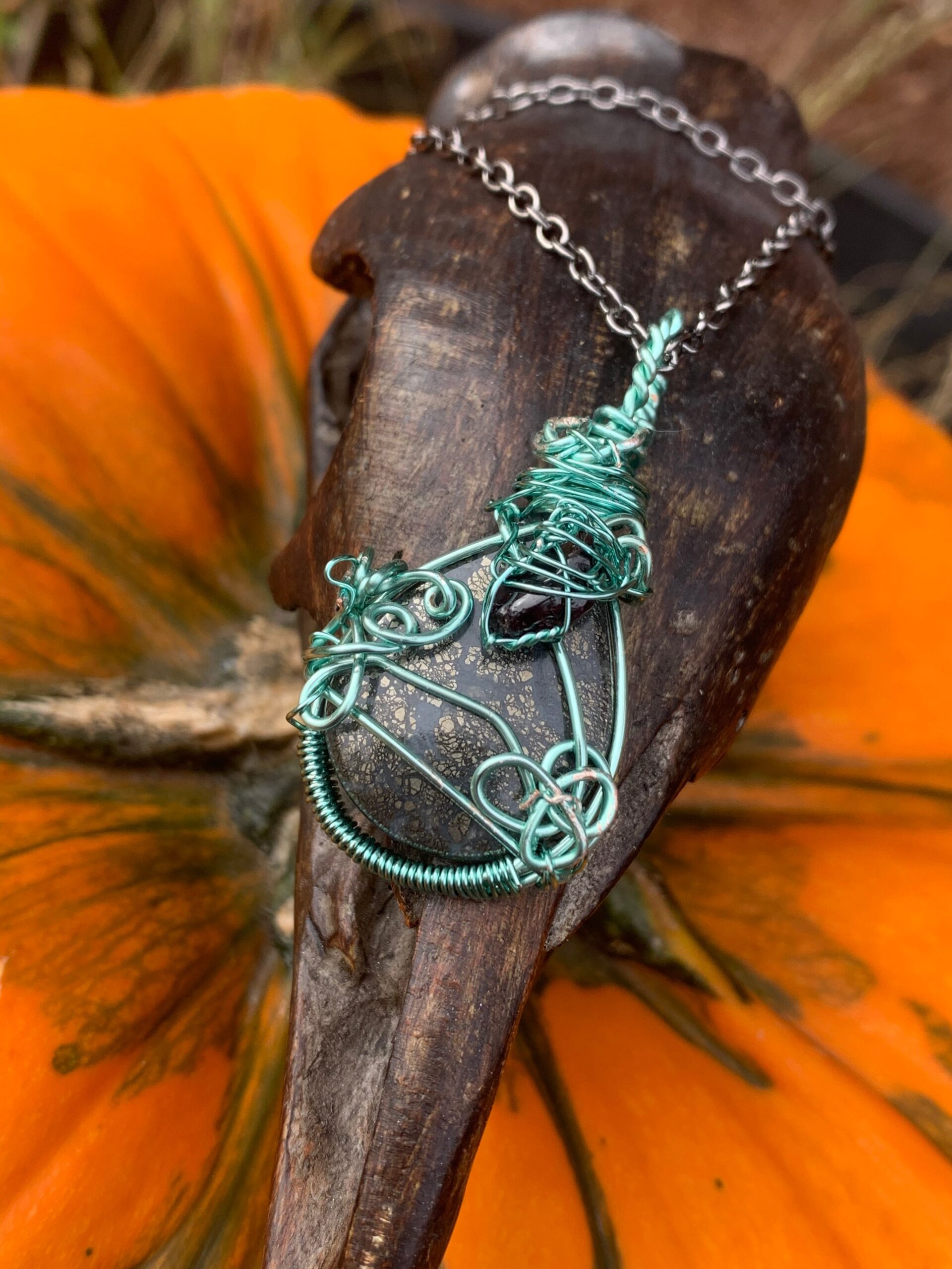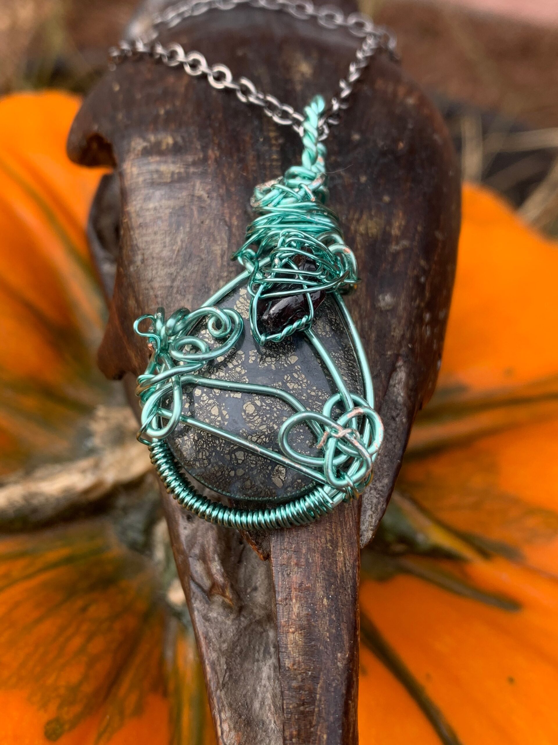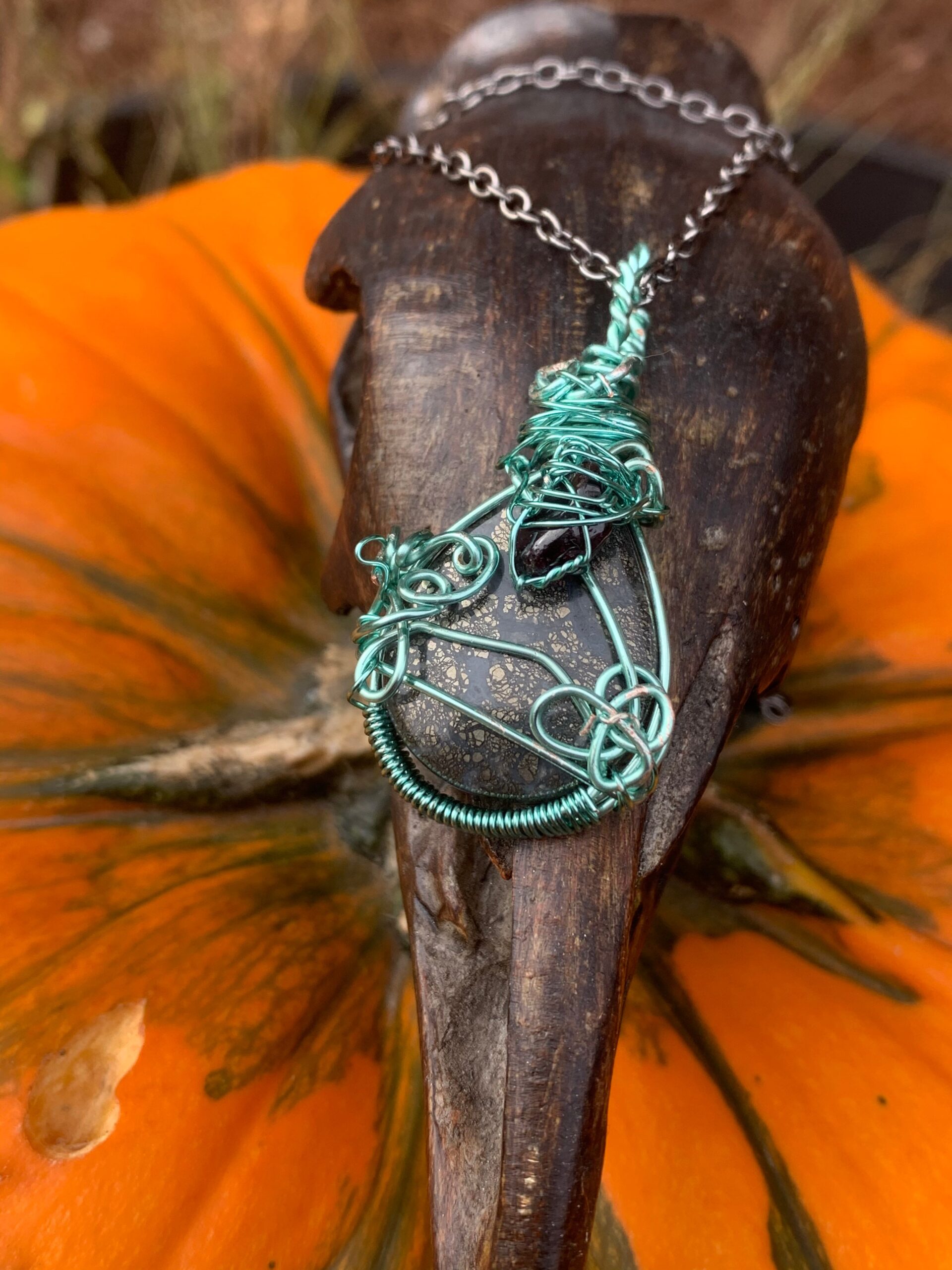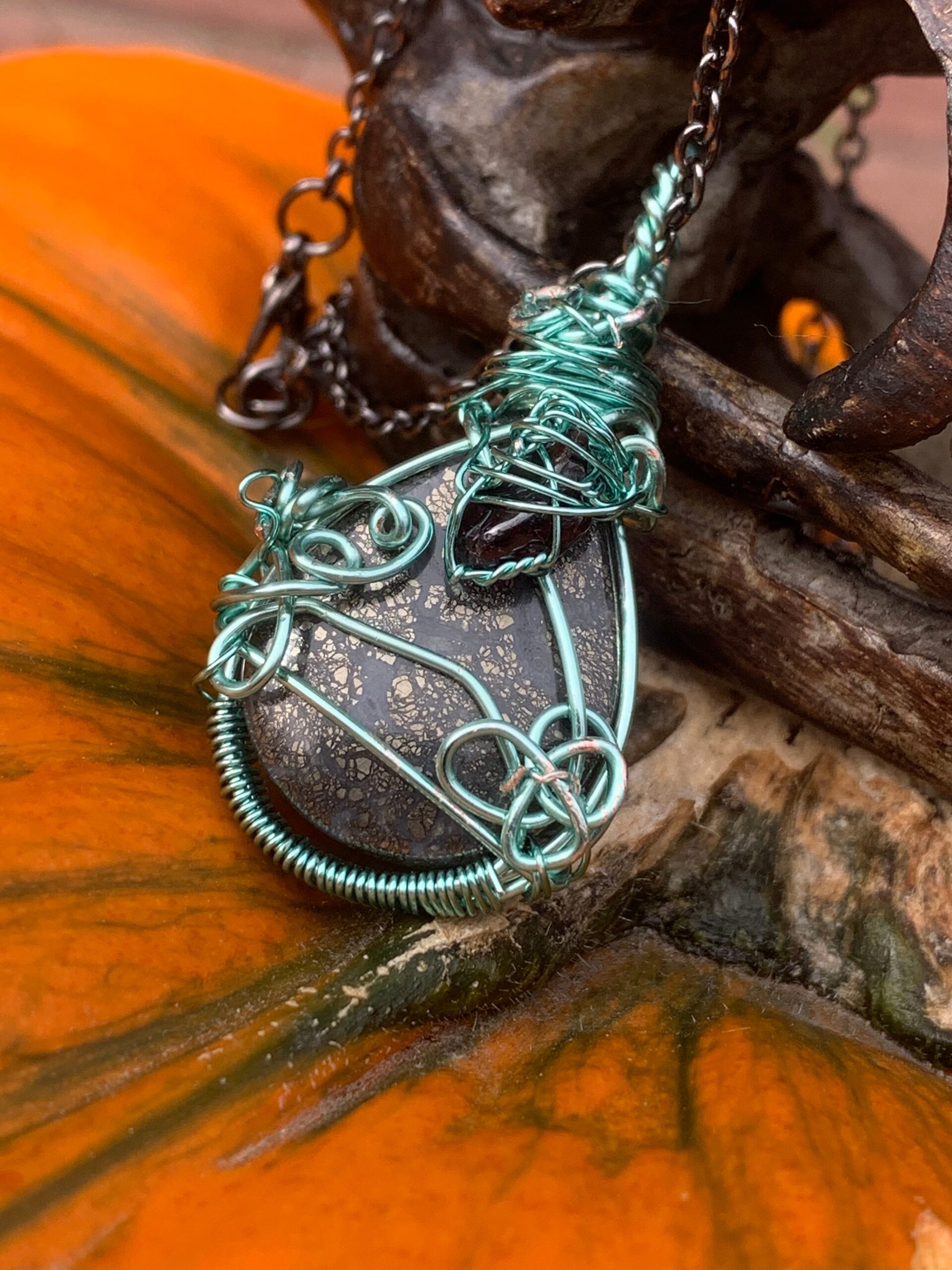 Marcasite and garnet wrapped in mint green coated wire. Comes on a black metal chain.