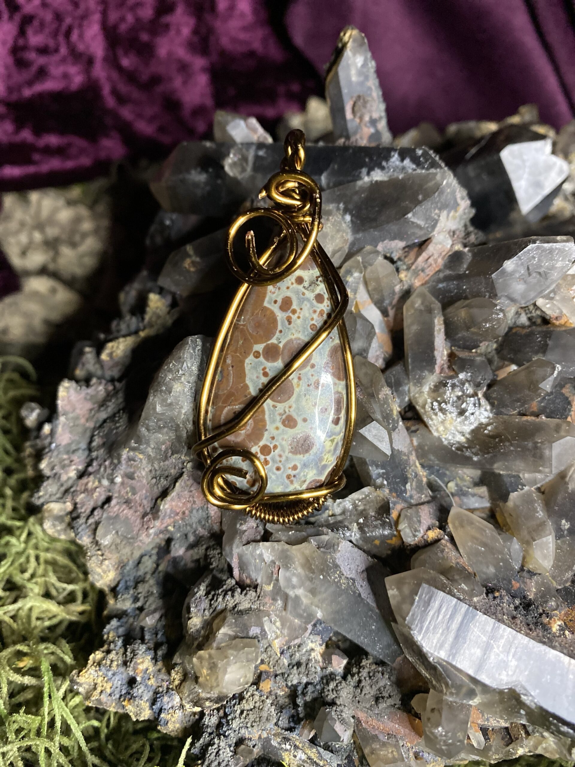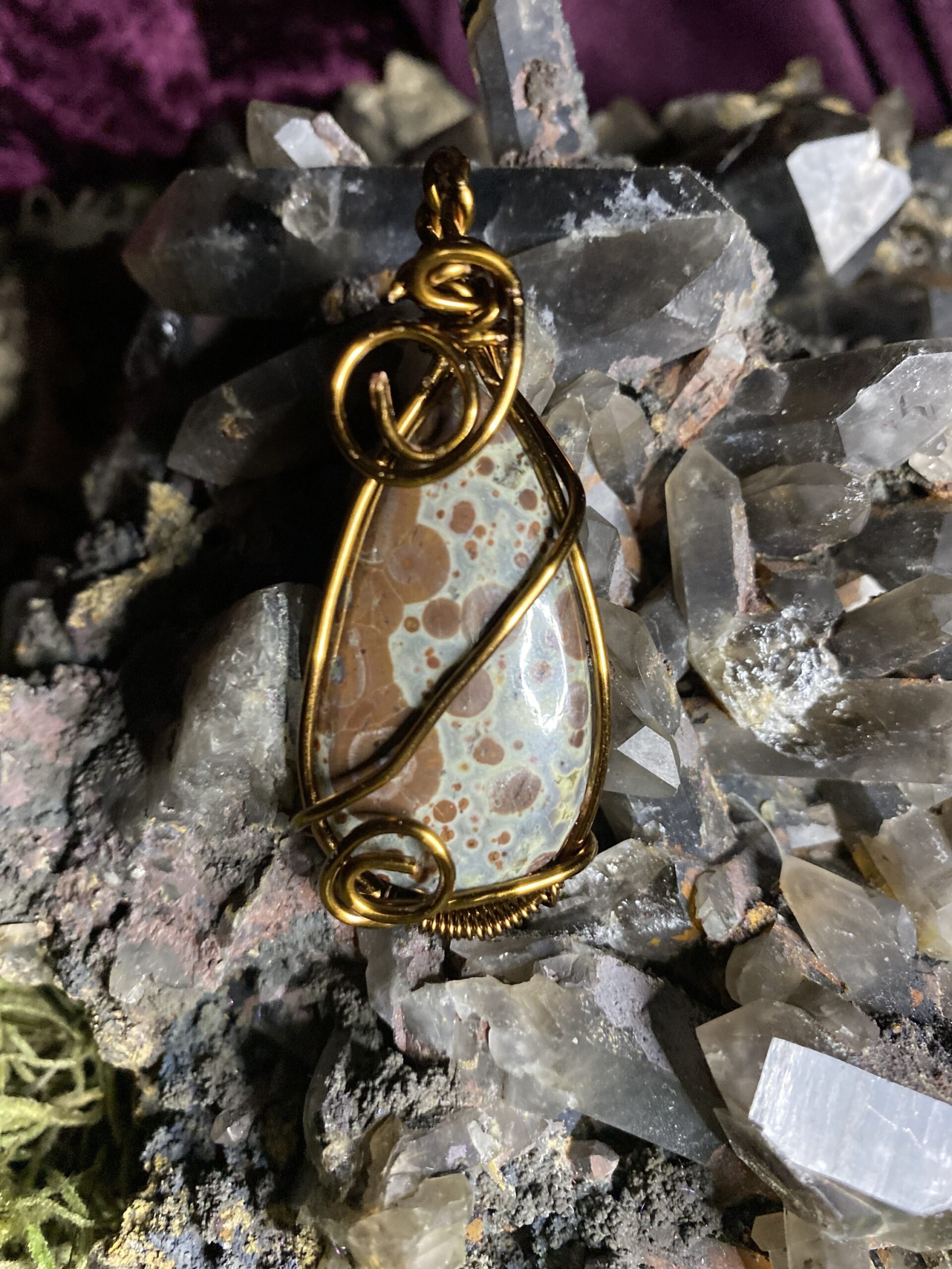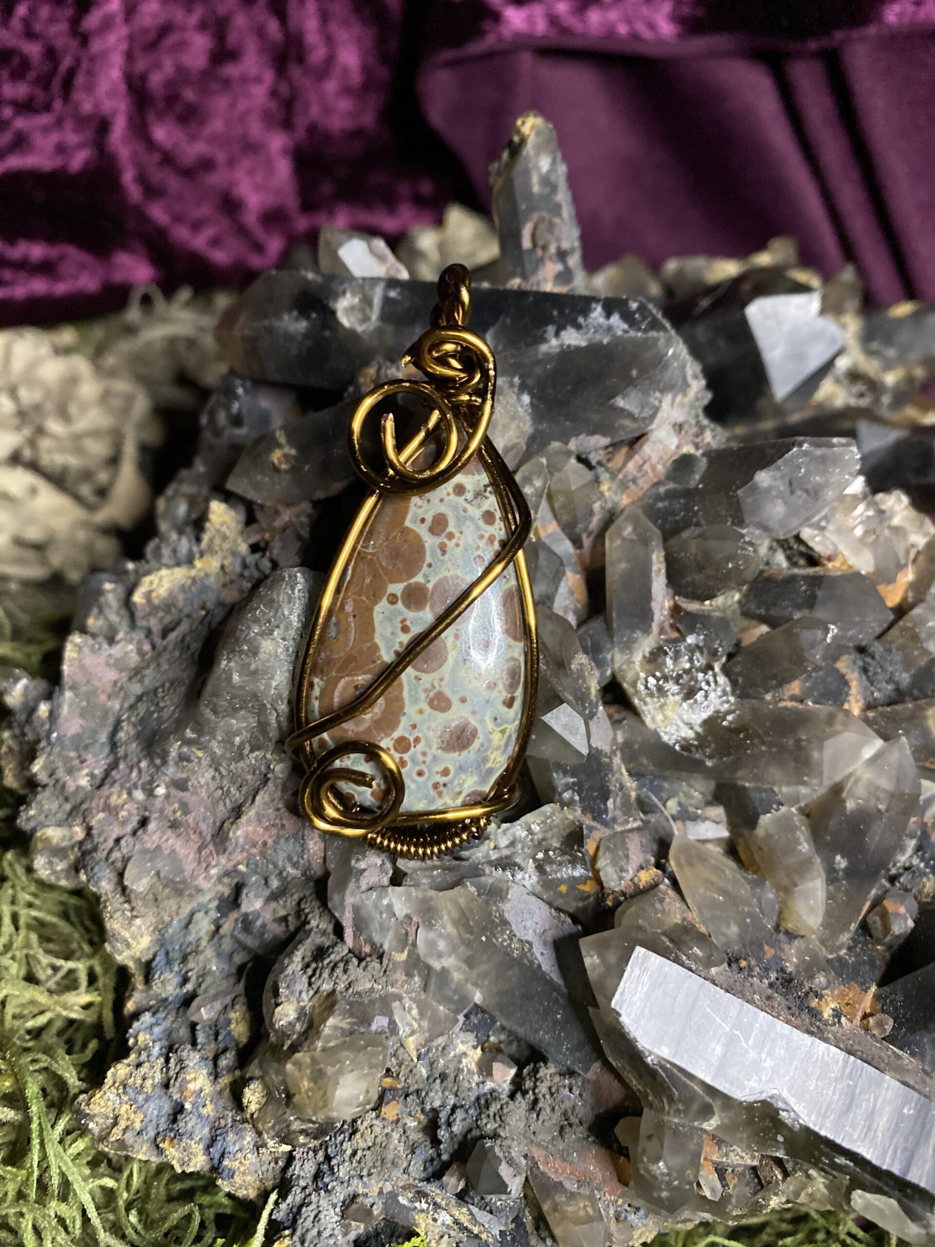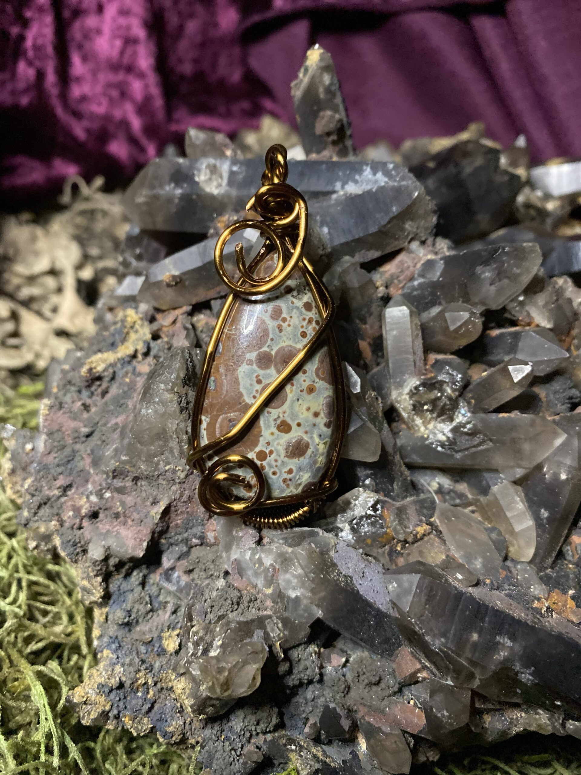 Asteroid Jasper wrapped in antique colored copper, comes with a raw copper chain and a brown silken cord choker