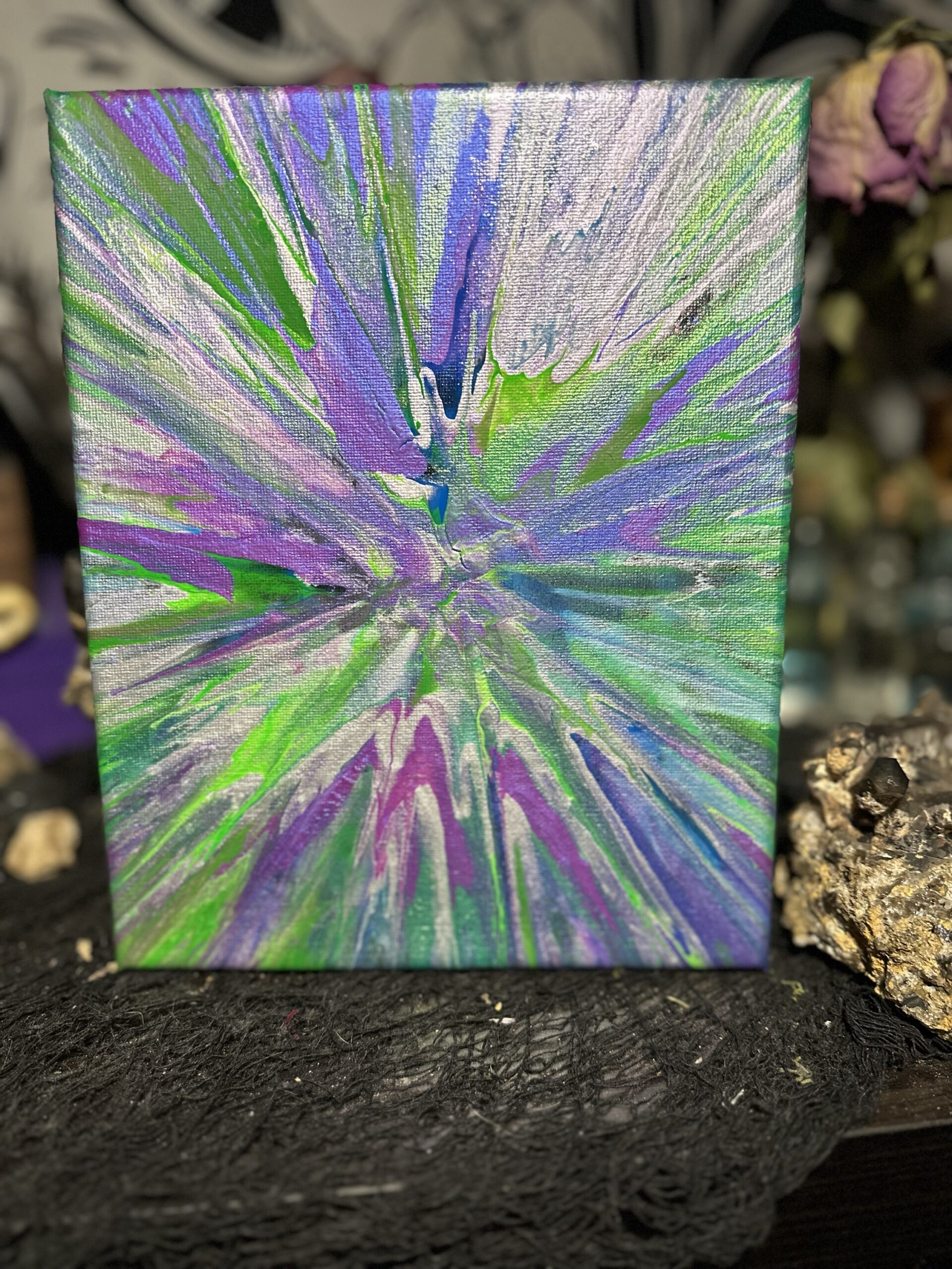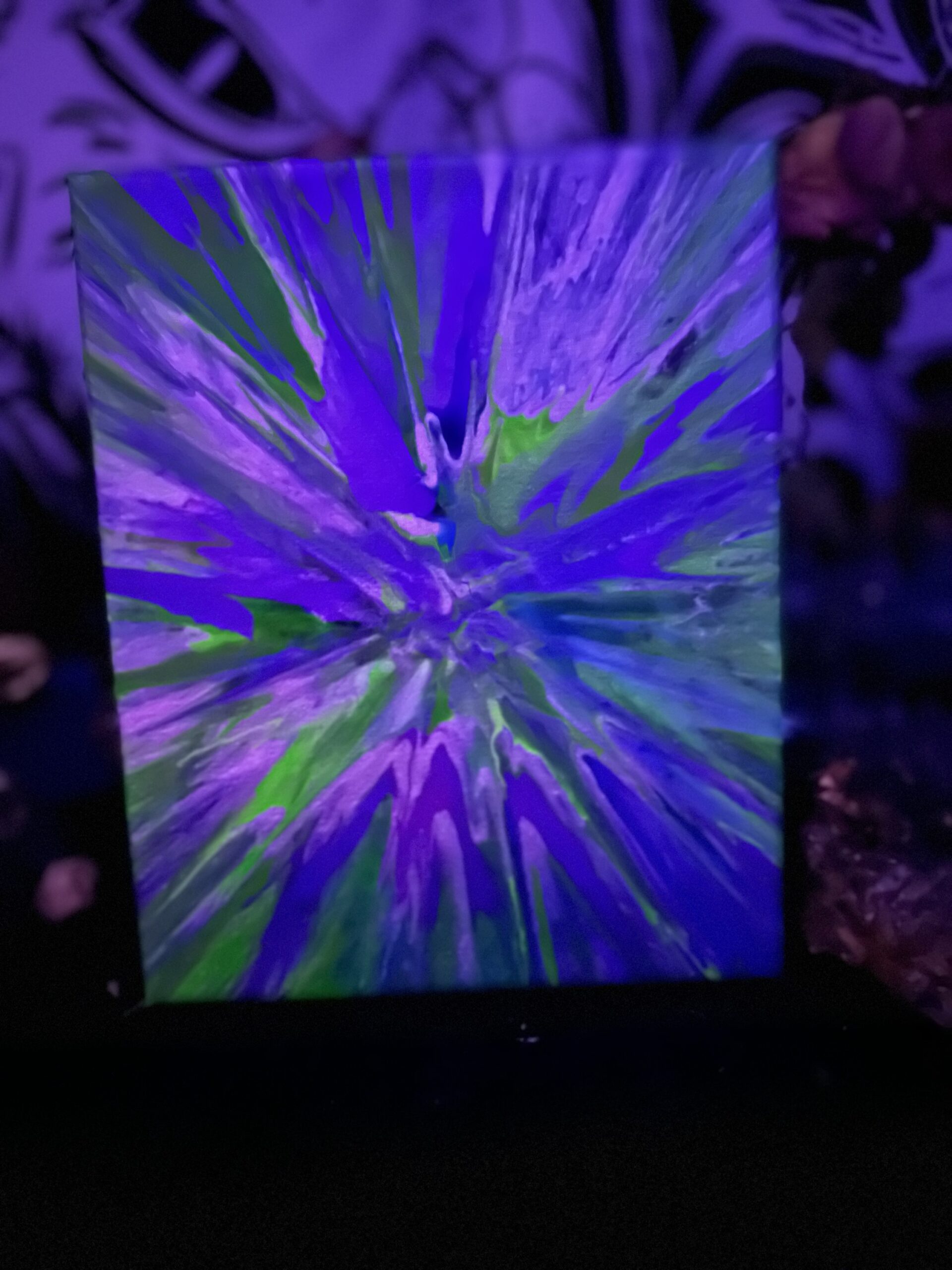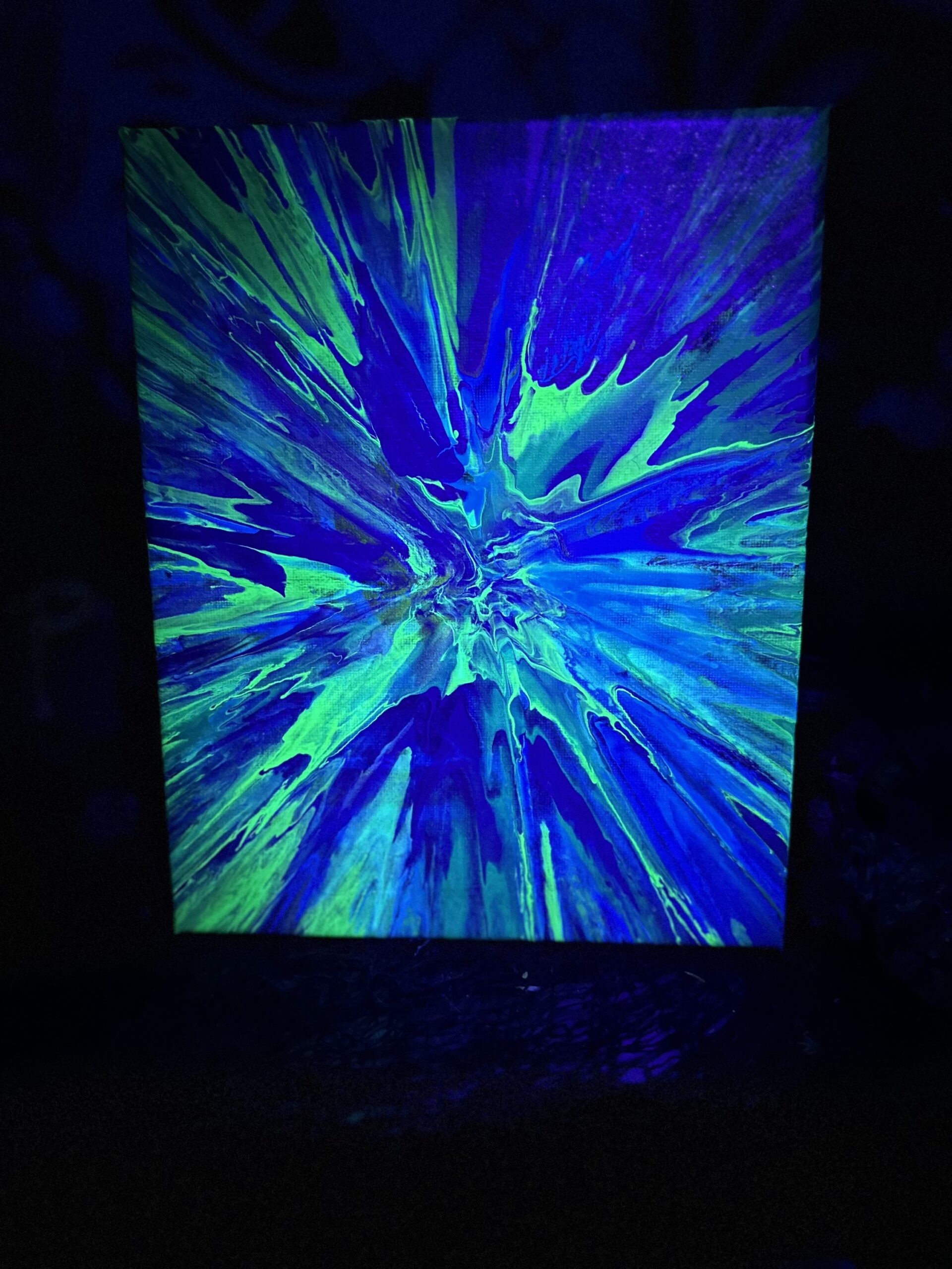 Spin art featuring glow in the dark and black light reactive paint on 8×10 canvas