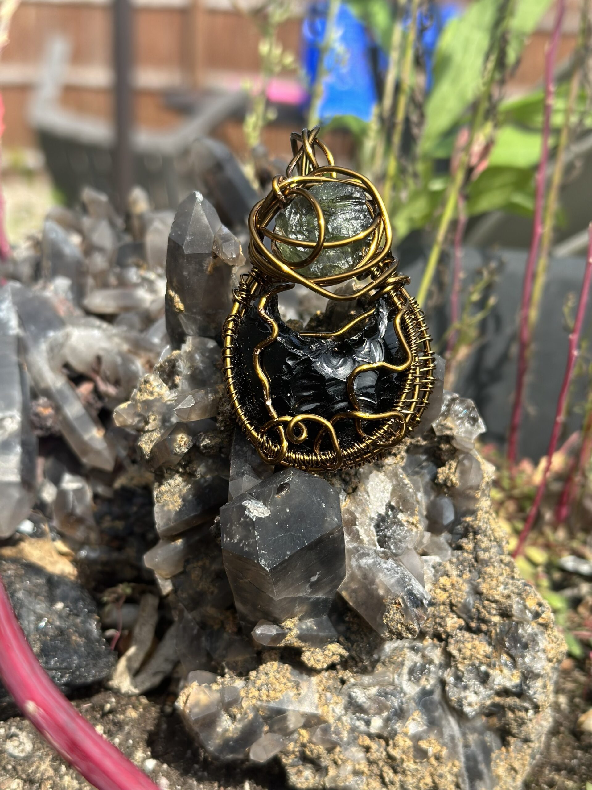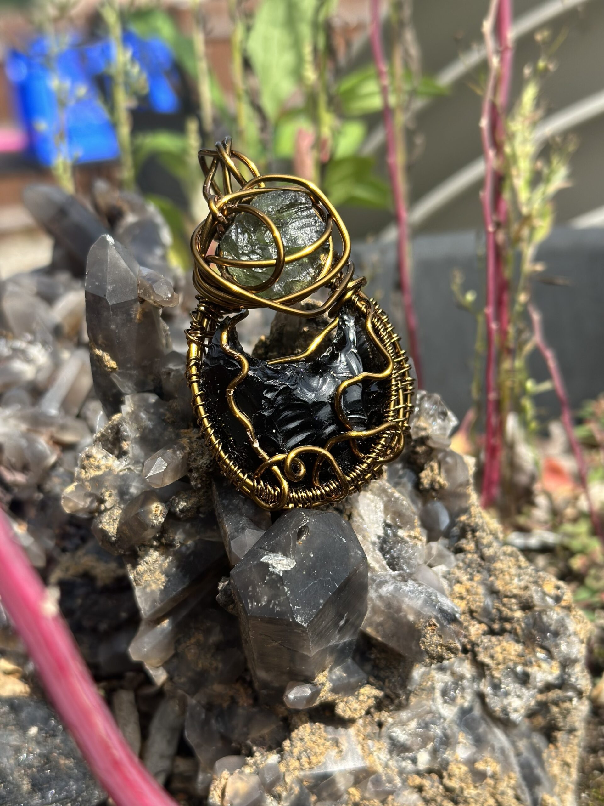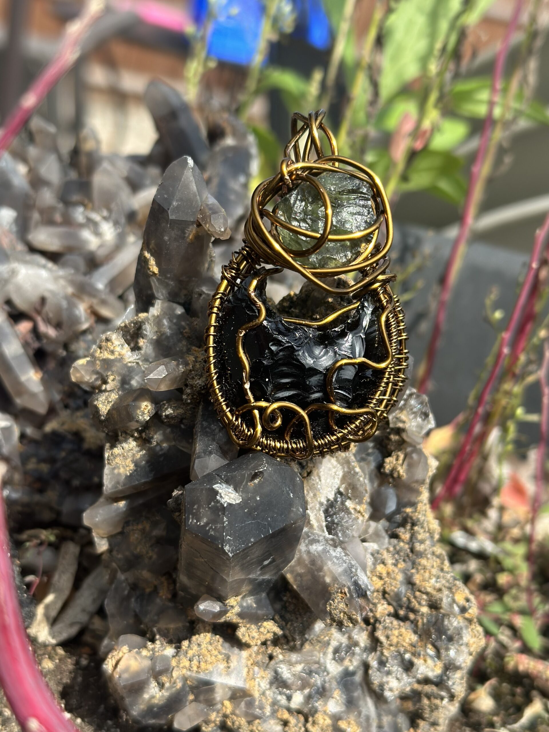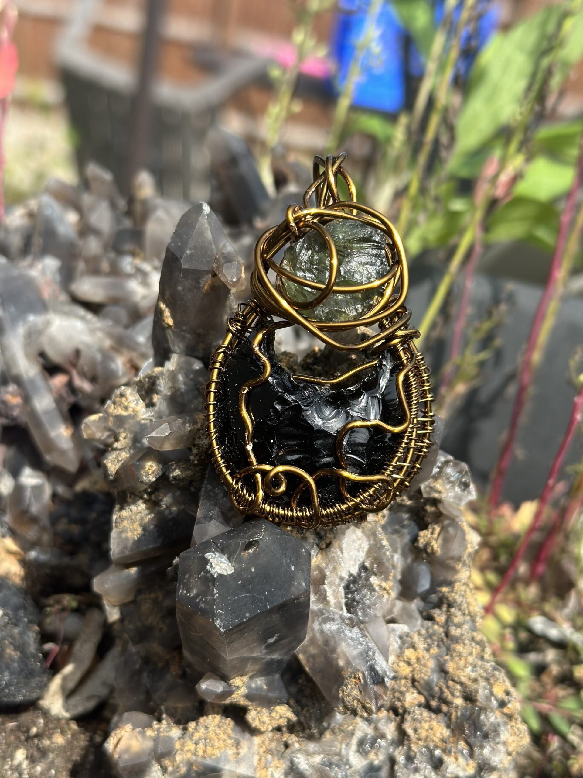 Obsidian carved kitty head and 1.9 ct moldavite wrapped in chocolate colored copper wire and hung on a copper chain