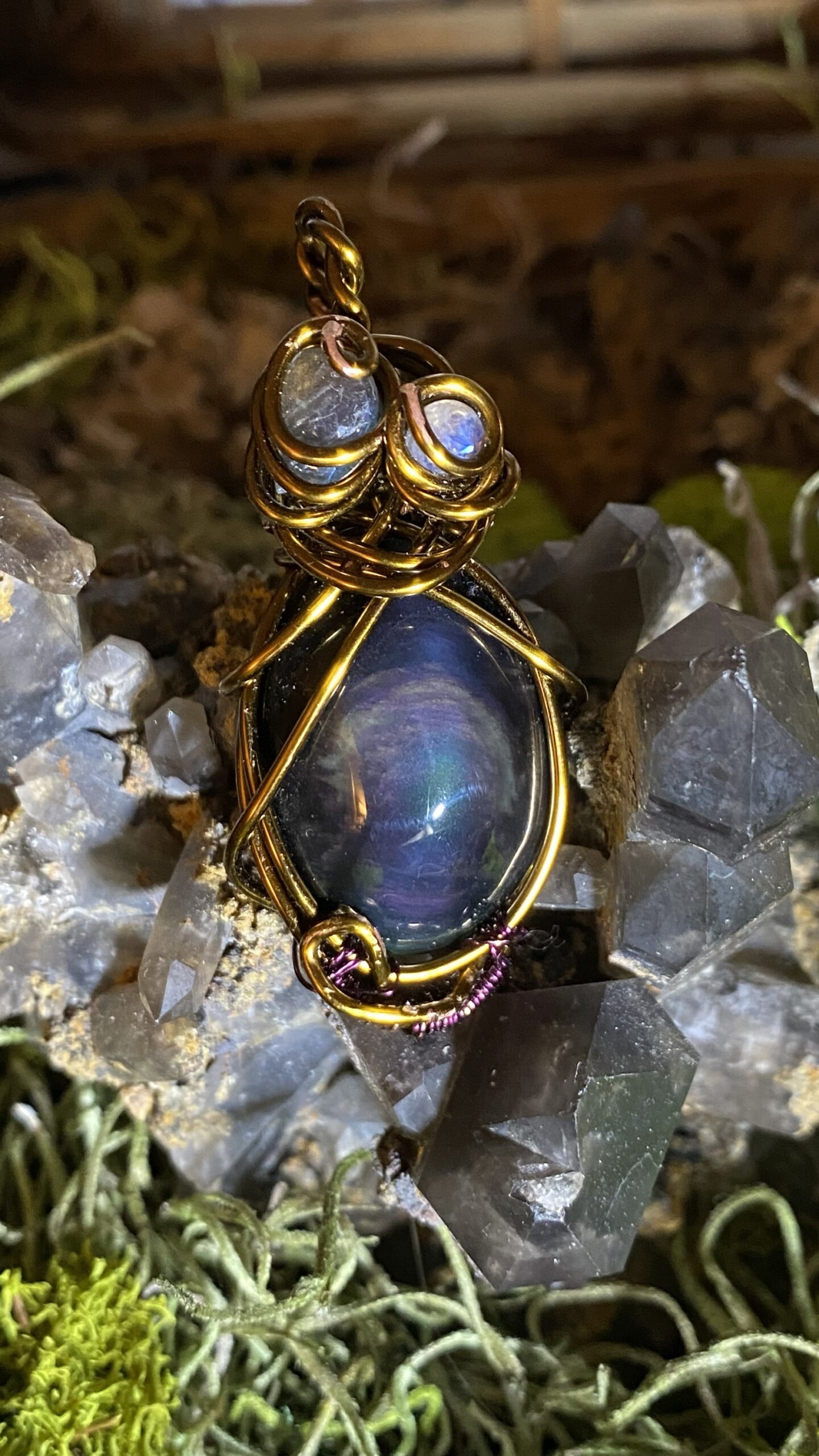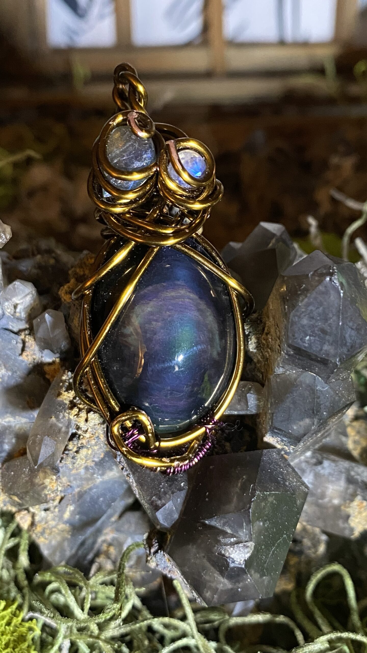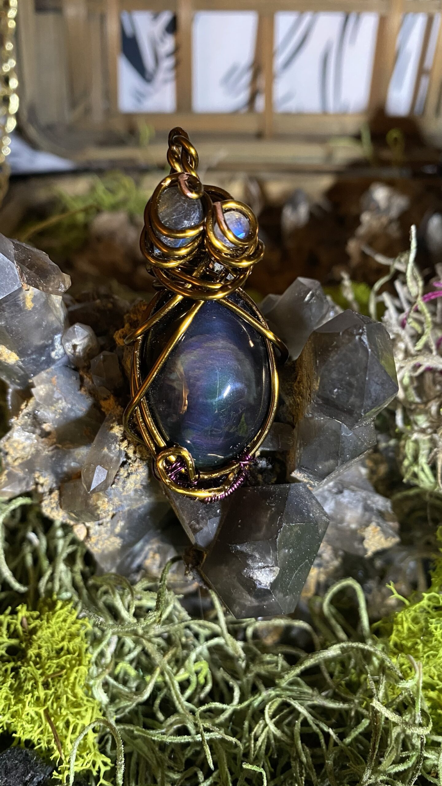 Obsidian and small faceted labradorite and small faceted moonstone wrapped in antique and purple colored copper wire, comes hung on a raw copper chain
