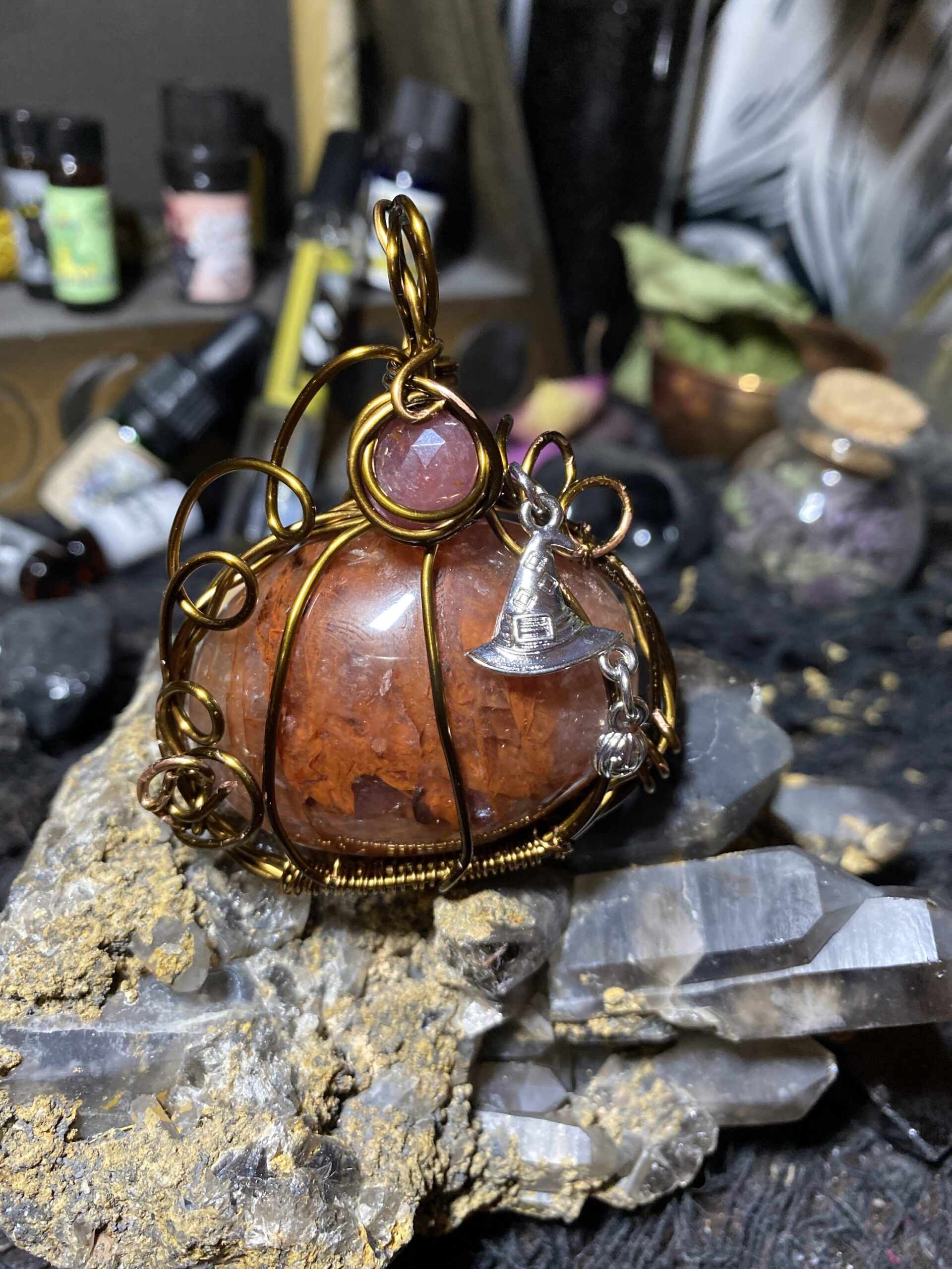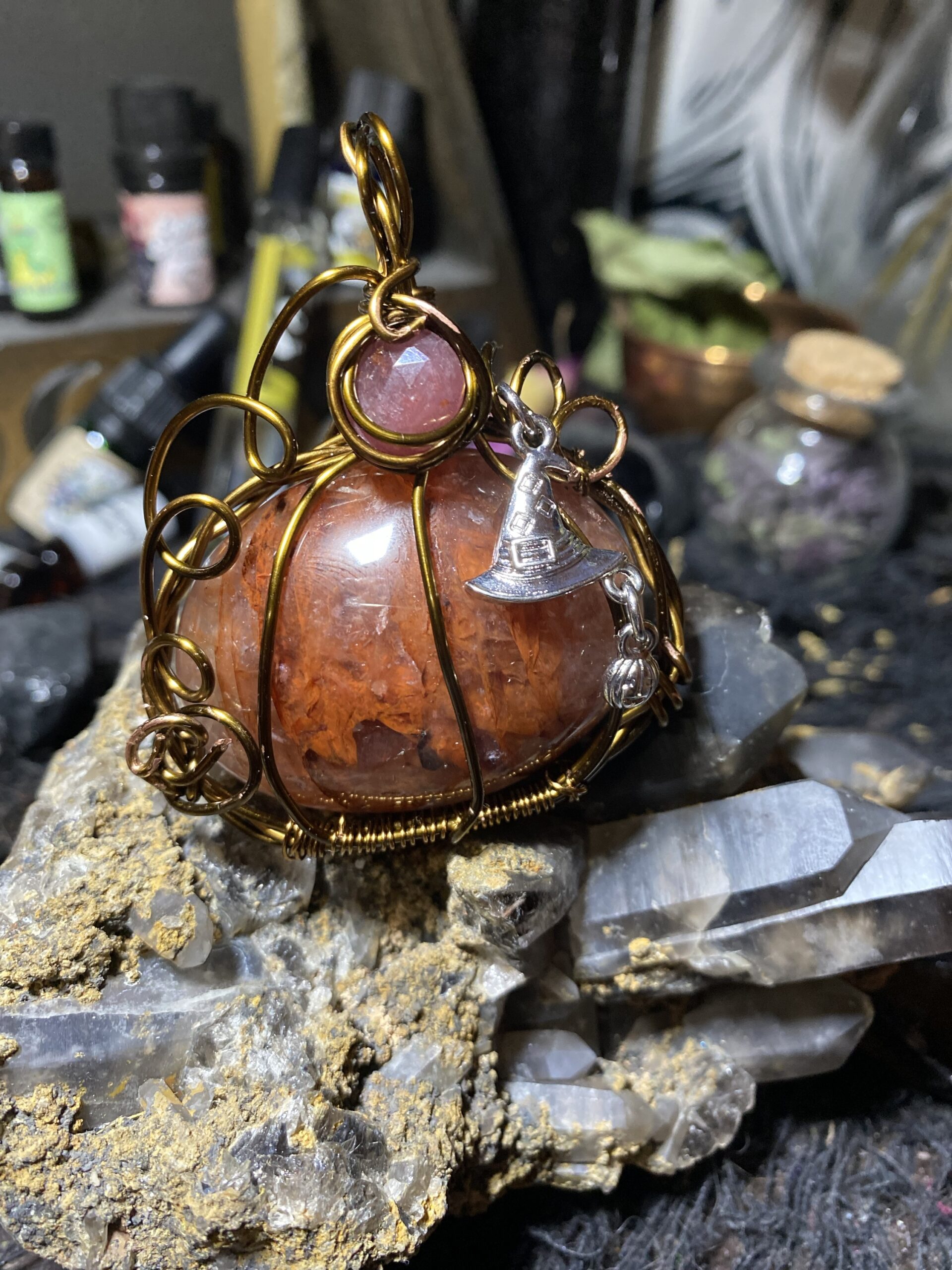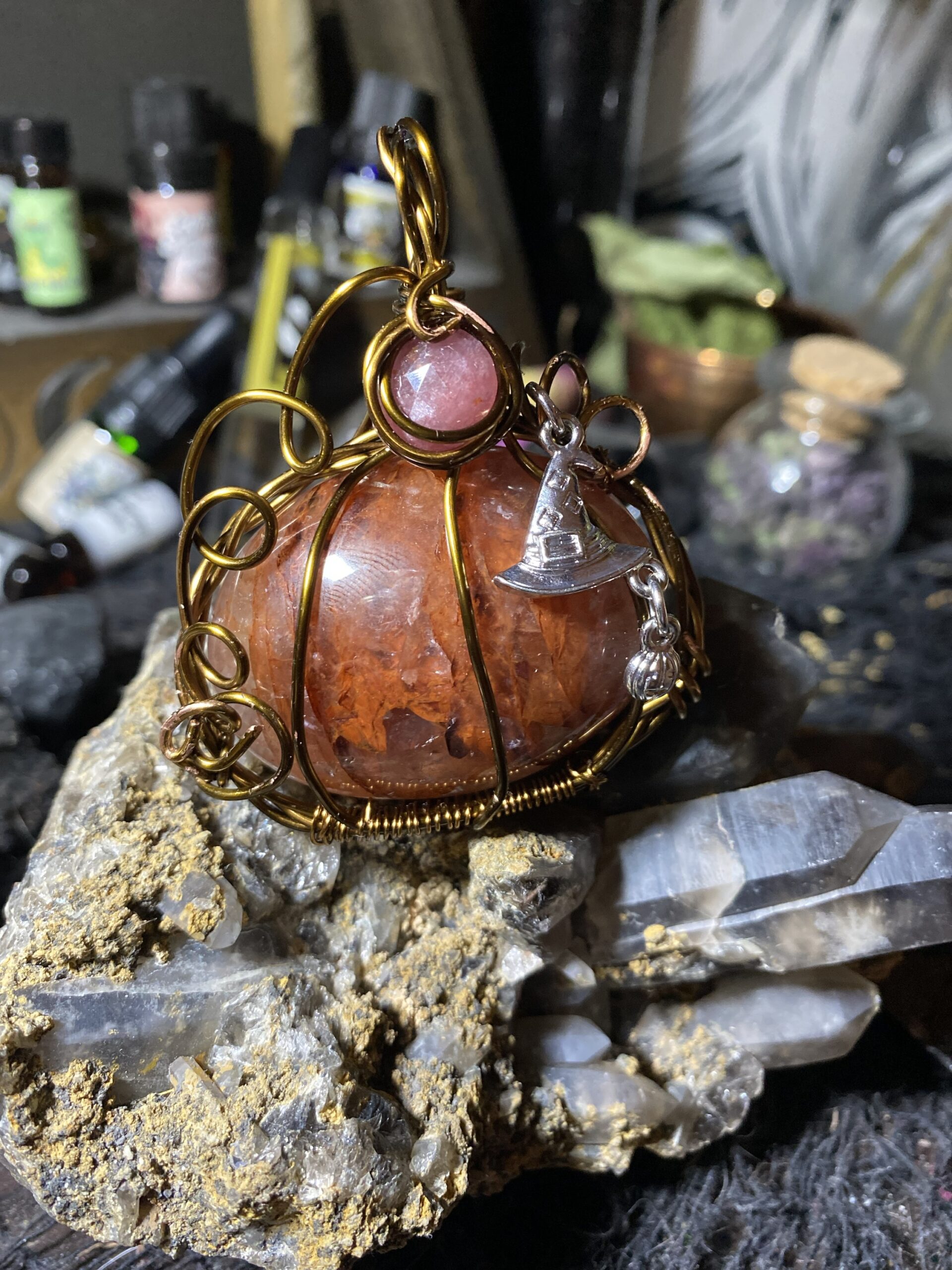 Fire quartz and pink sapphire wrapped in antique colored copper wire with a silver toned metal witch hat charm. Comes hung on a raw copper chain