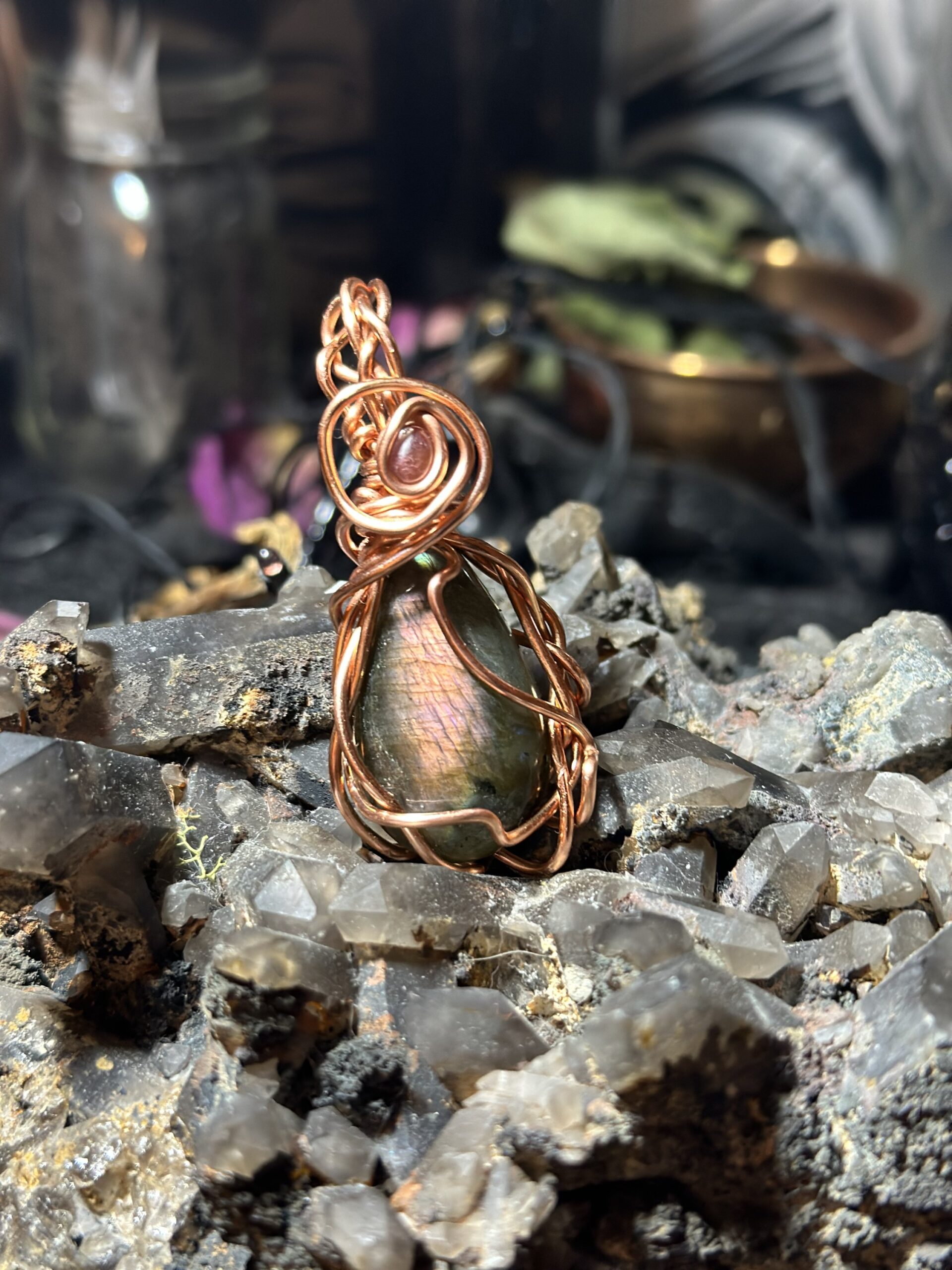 Gorgeous sunset flash labradorite and pink tourmaline wrapped in rose gold colored copper wire and hung on a delicate rose gold colored metal chain