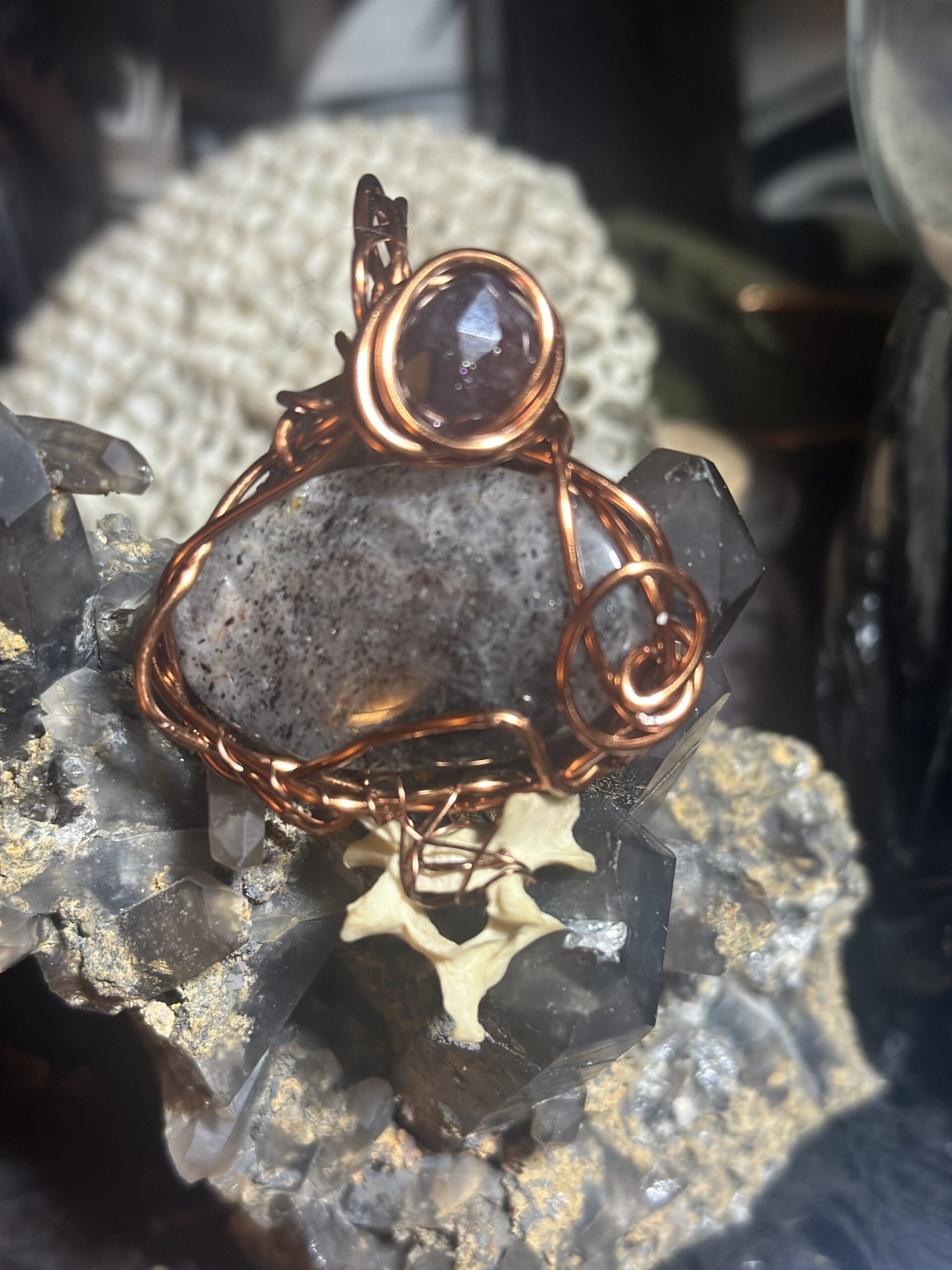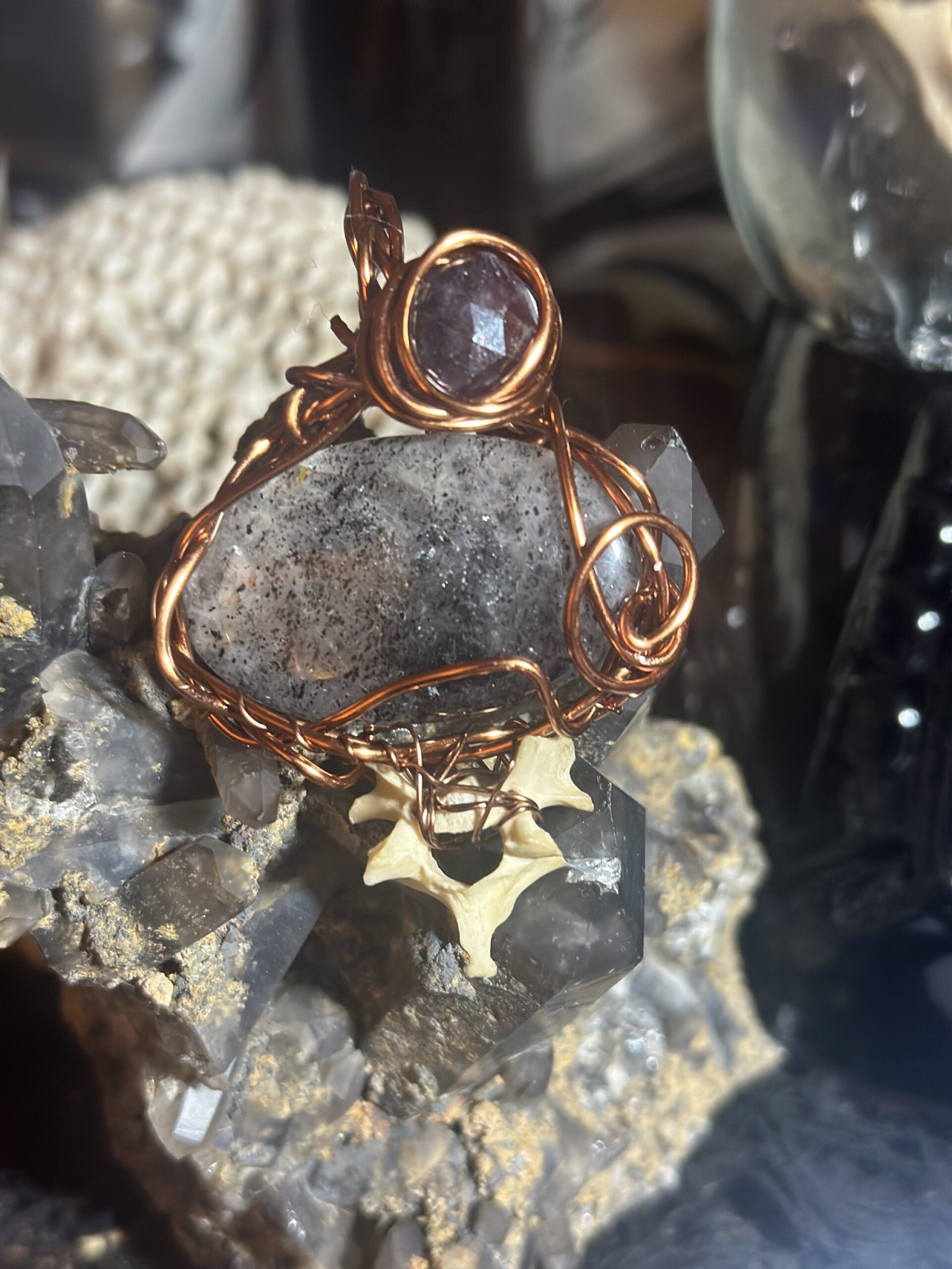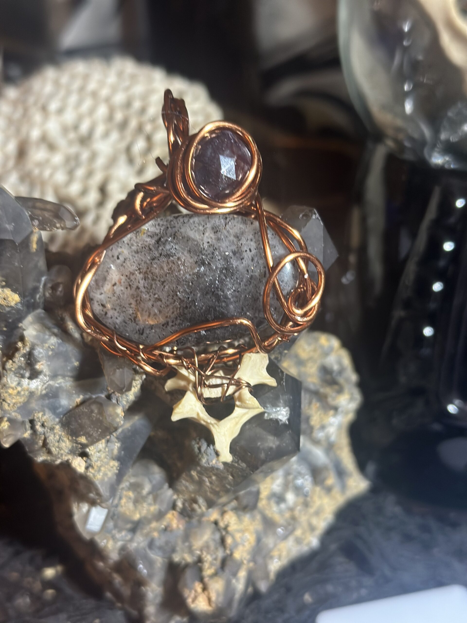 Black quartz and dark purple sapphire wrapped in chocolate colored copper wire, paired with an ethically sourced vertebrae bone, hung on a copper chain