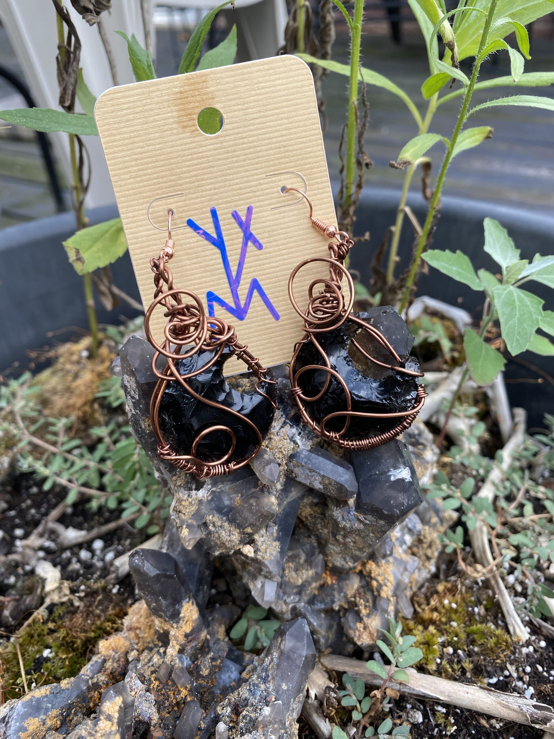 Black obsidian crescent moons wrapped in chocolate colored copper wire