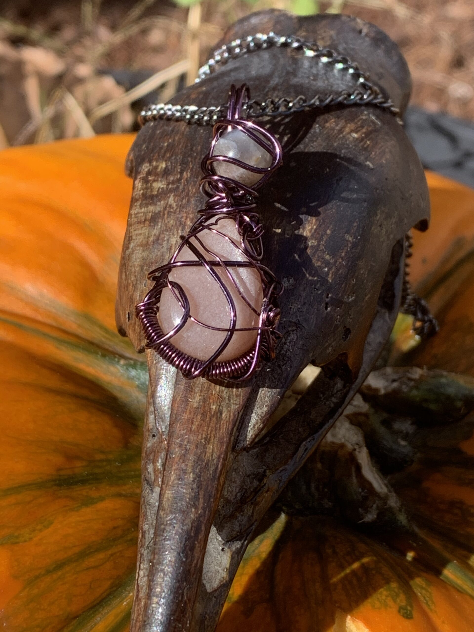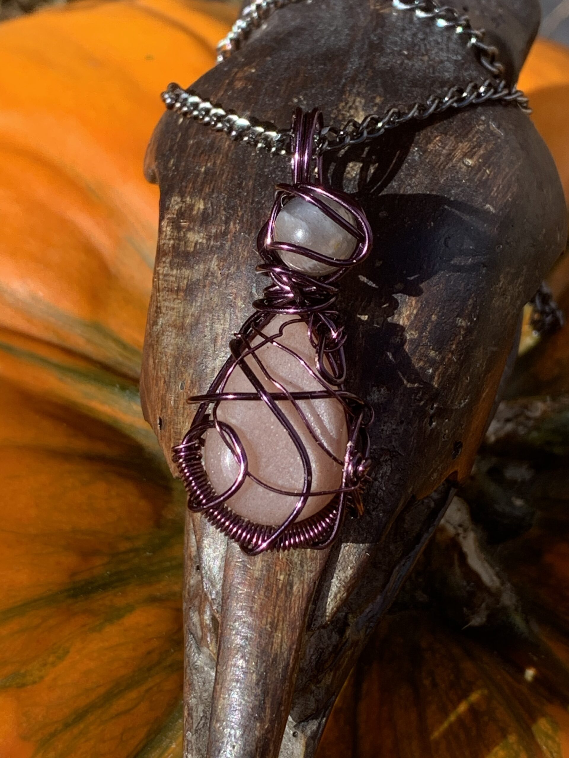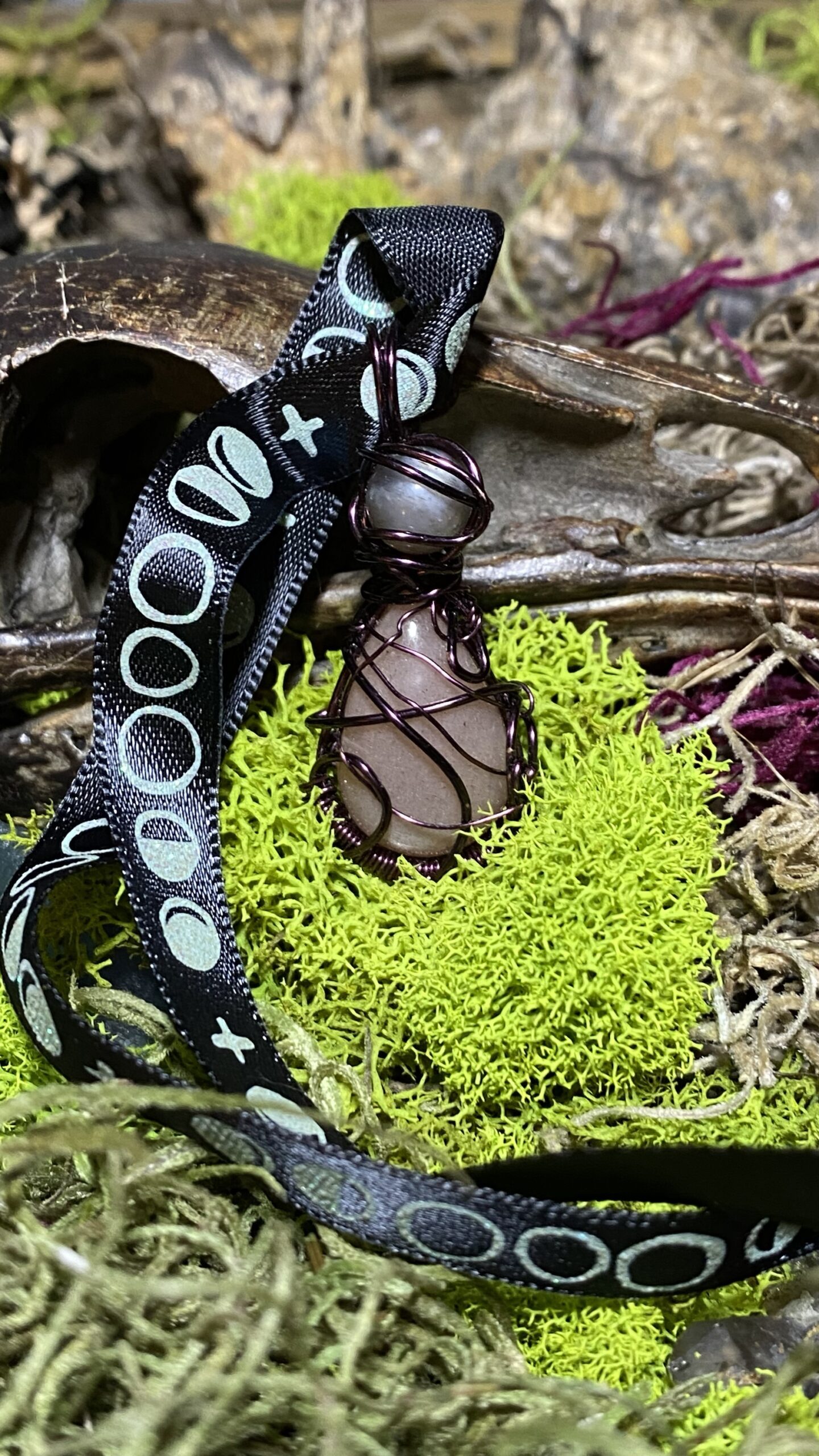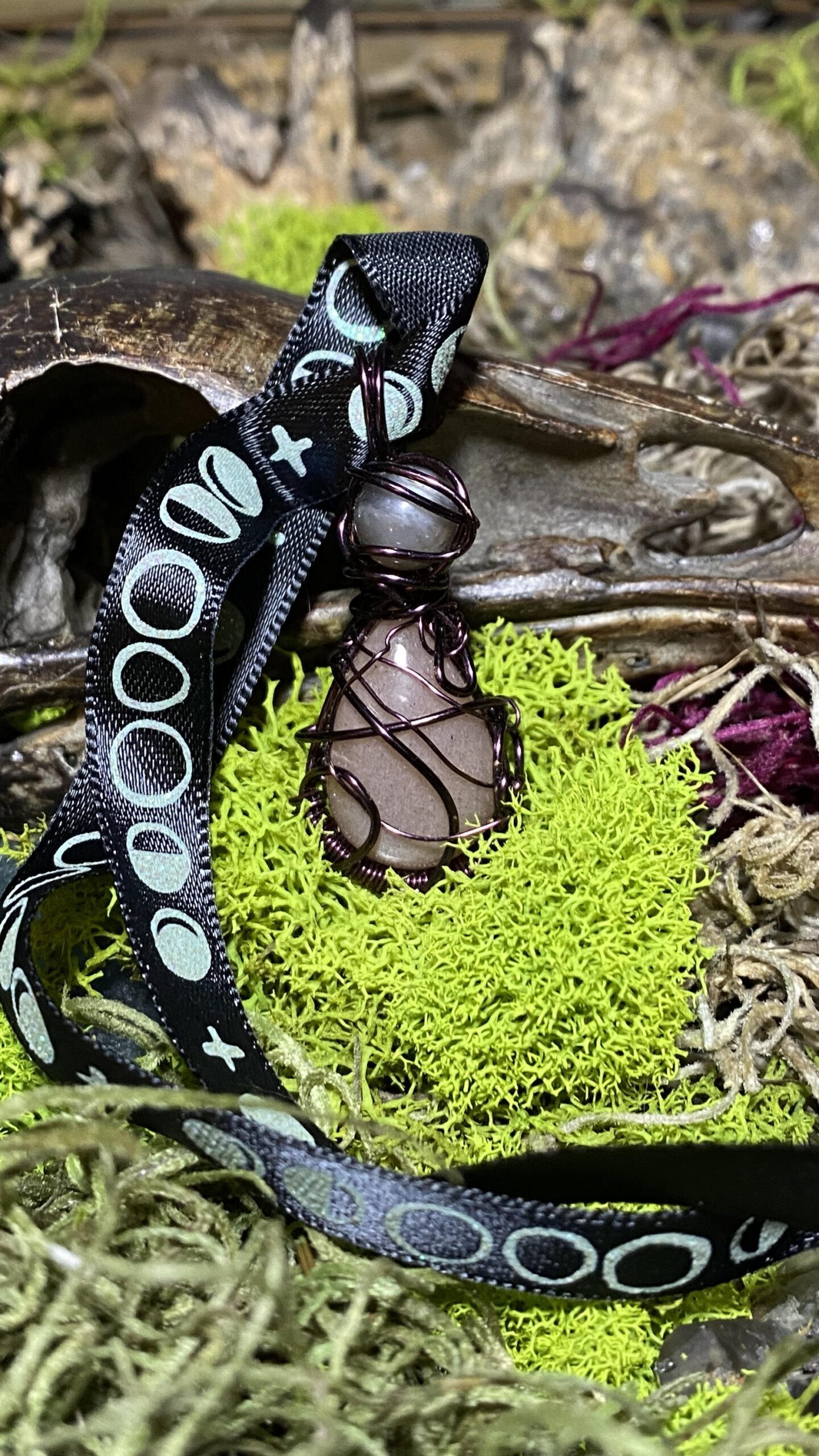 Peach moonstone teardrop topped with a sunstone sphere wrapped in dark purple wire, comes with a black metal chain and black ribbon with moon phases as a choker