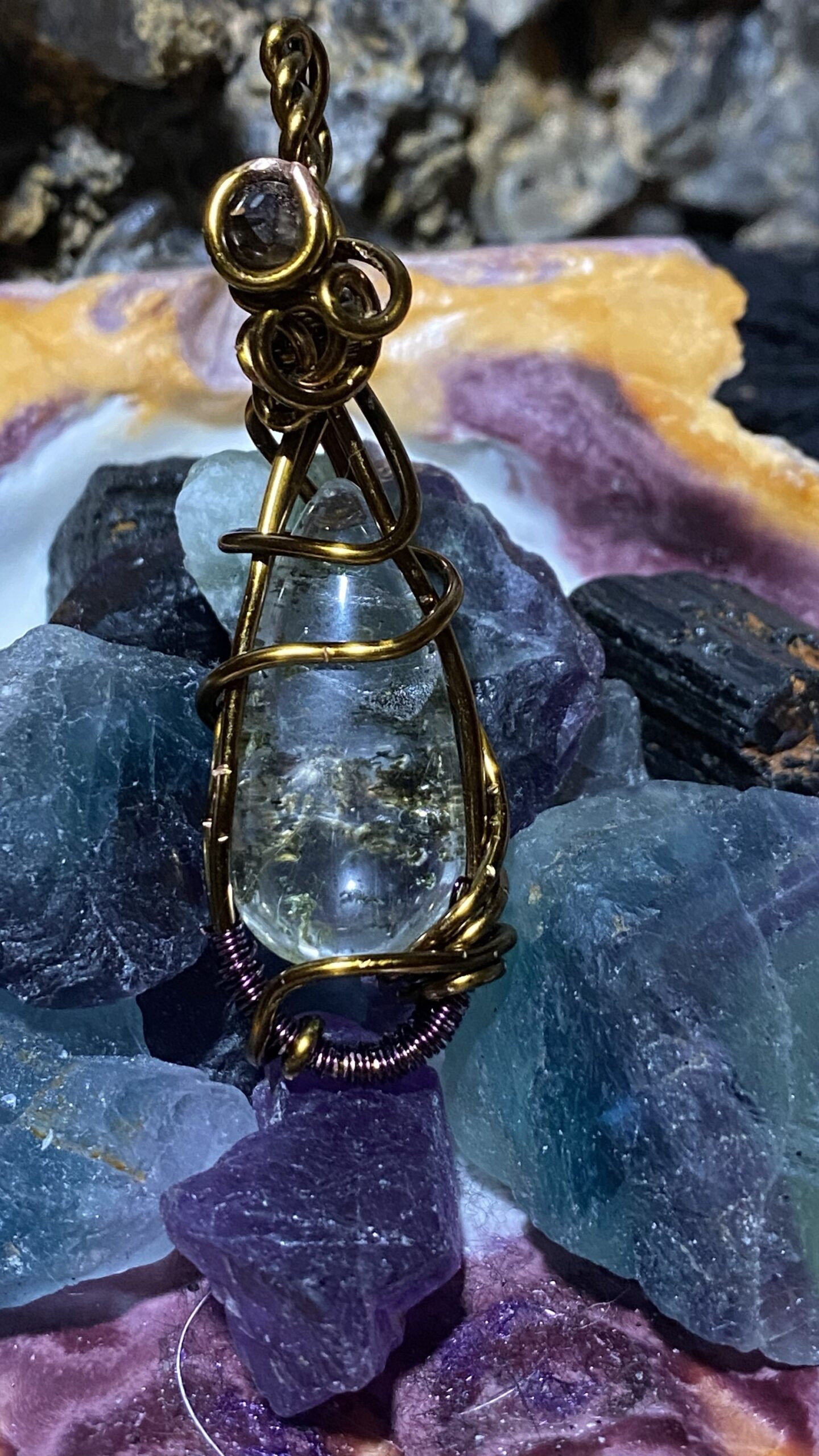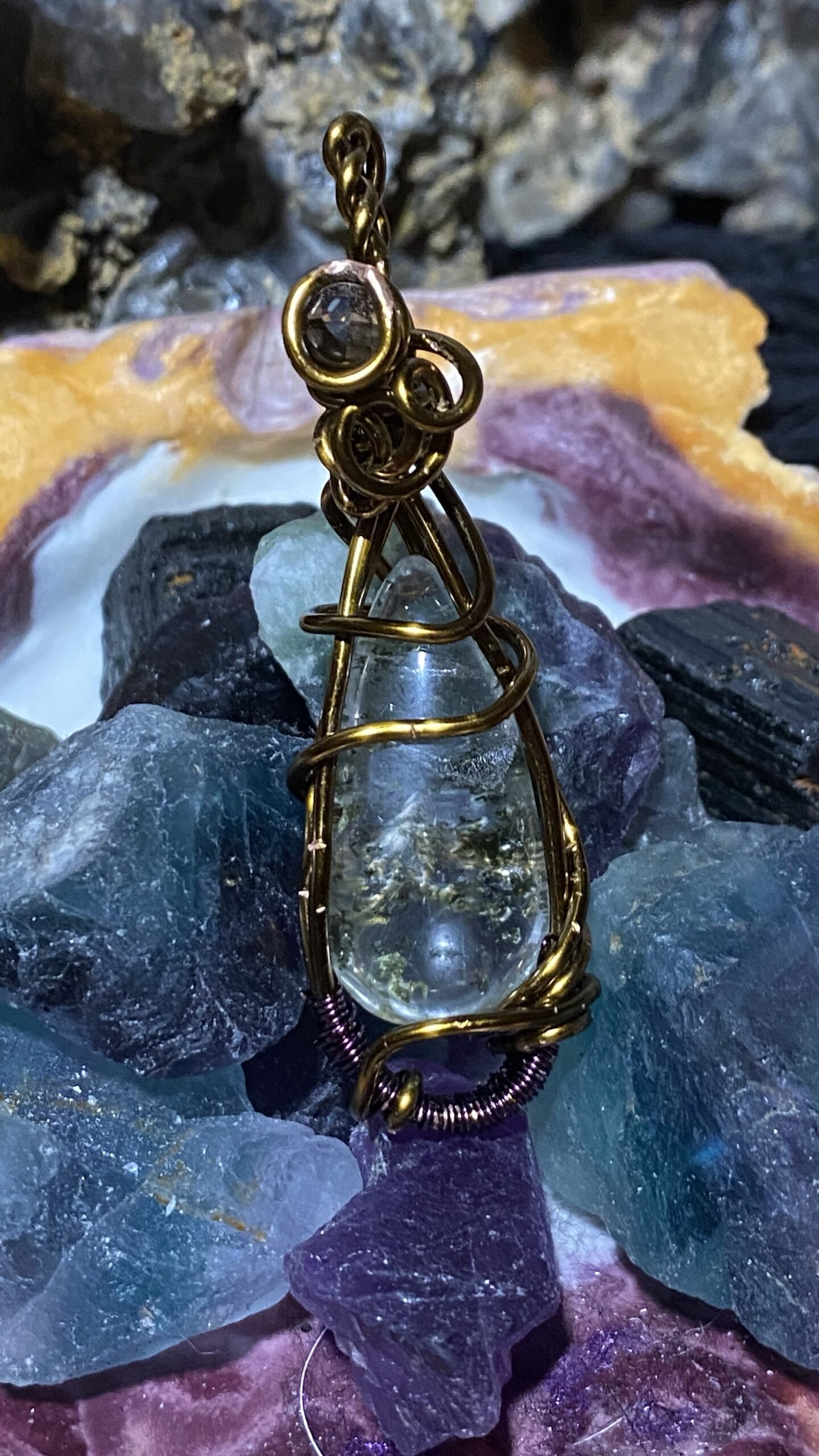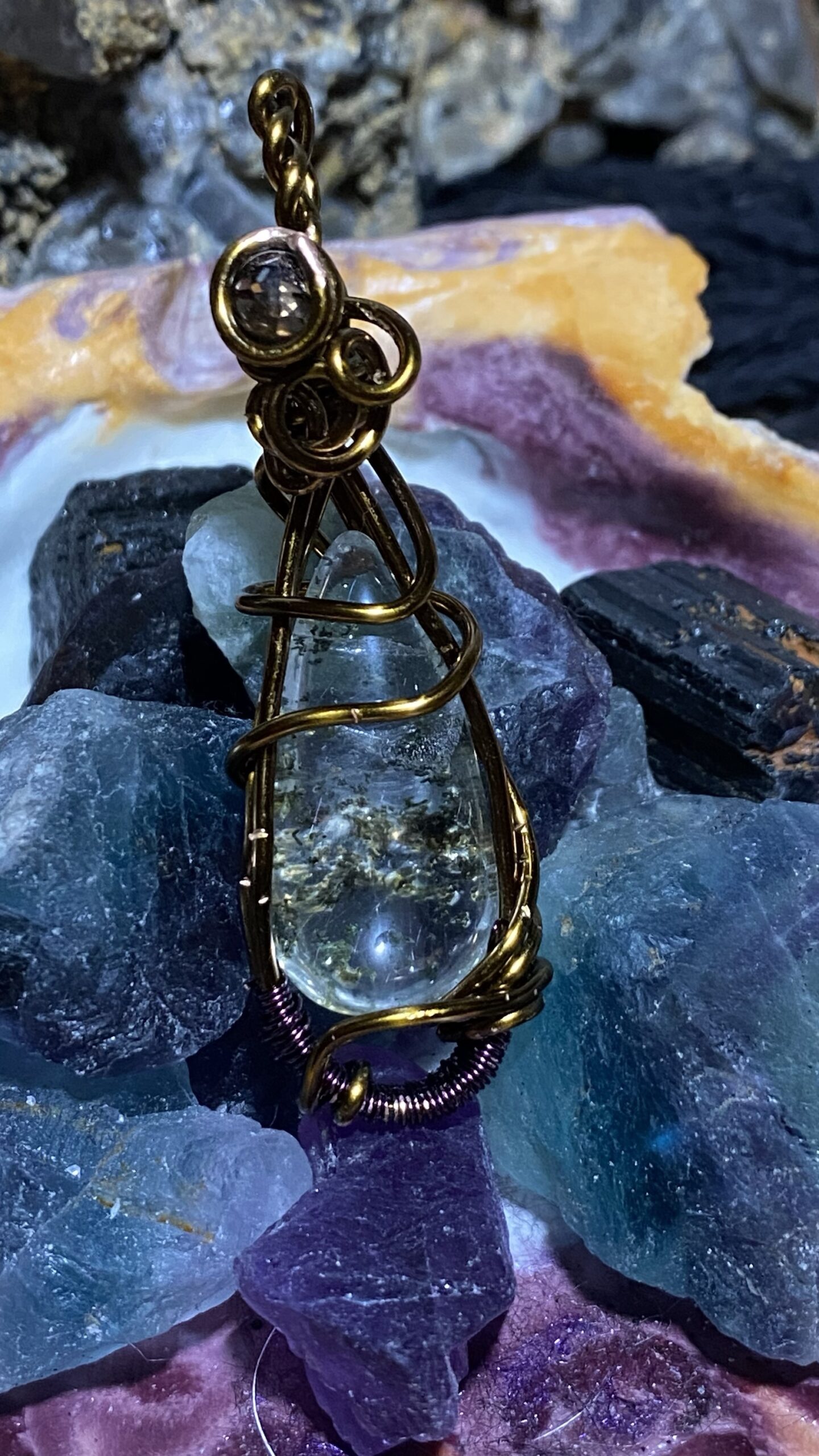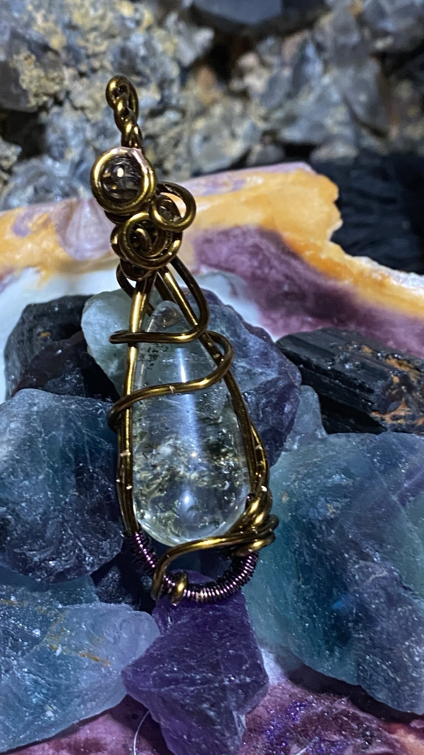 Garden quartz and smoky quartz wrapped in antique colored copper and hung on a copper chain.