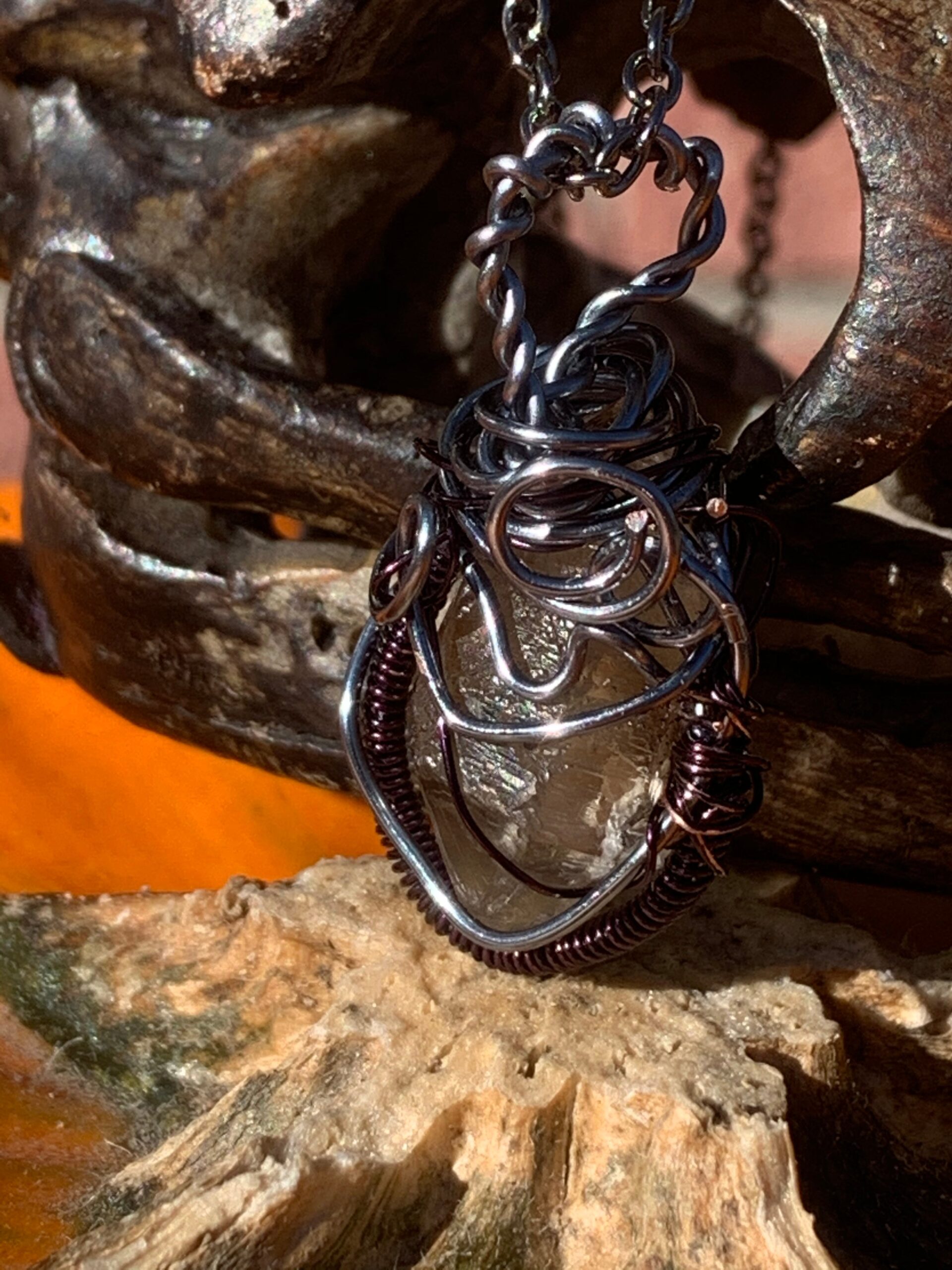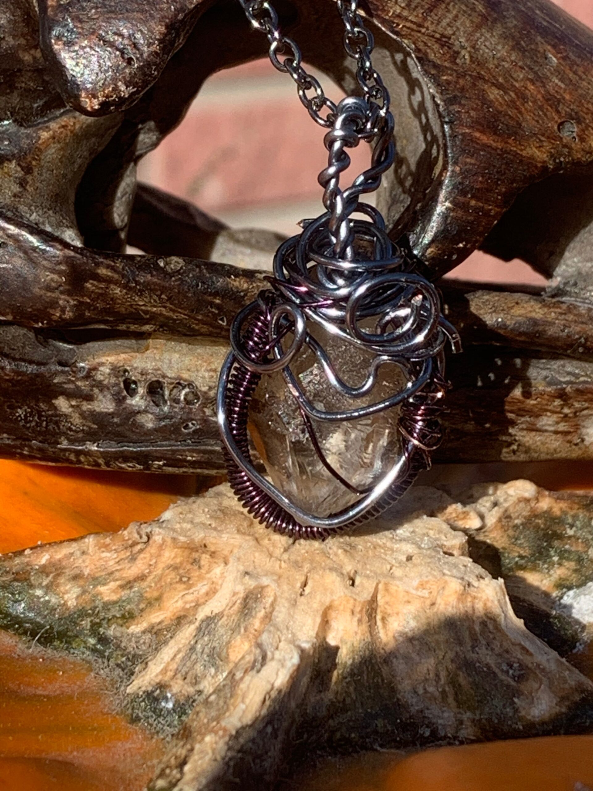 Elestial quartz wrapped in gunmetal and purple colored wire, inspired by Medusa. Comes hung on a black metal chain