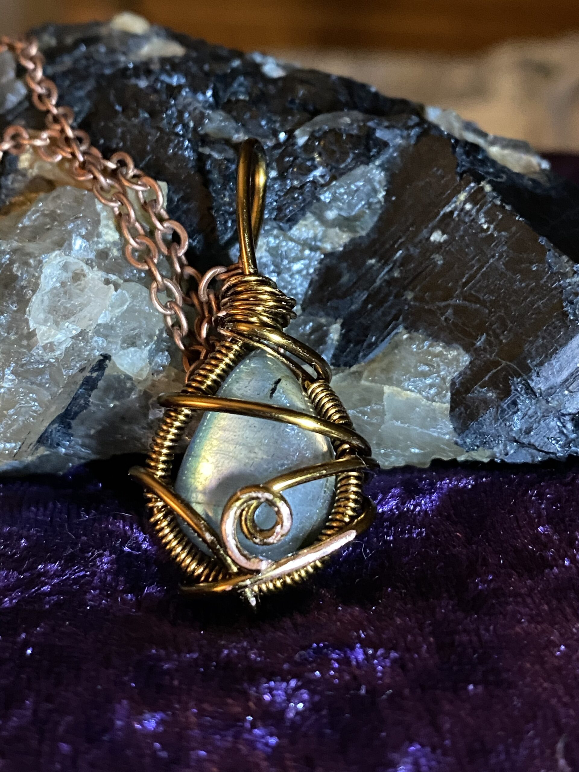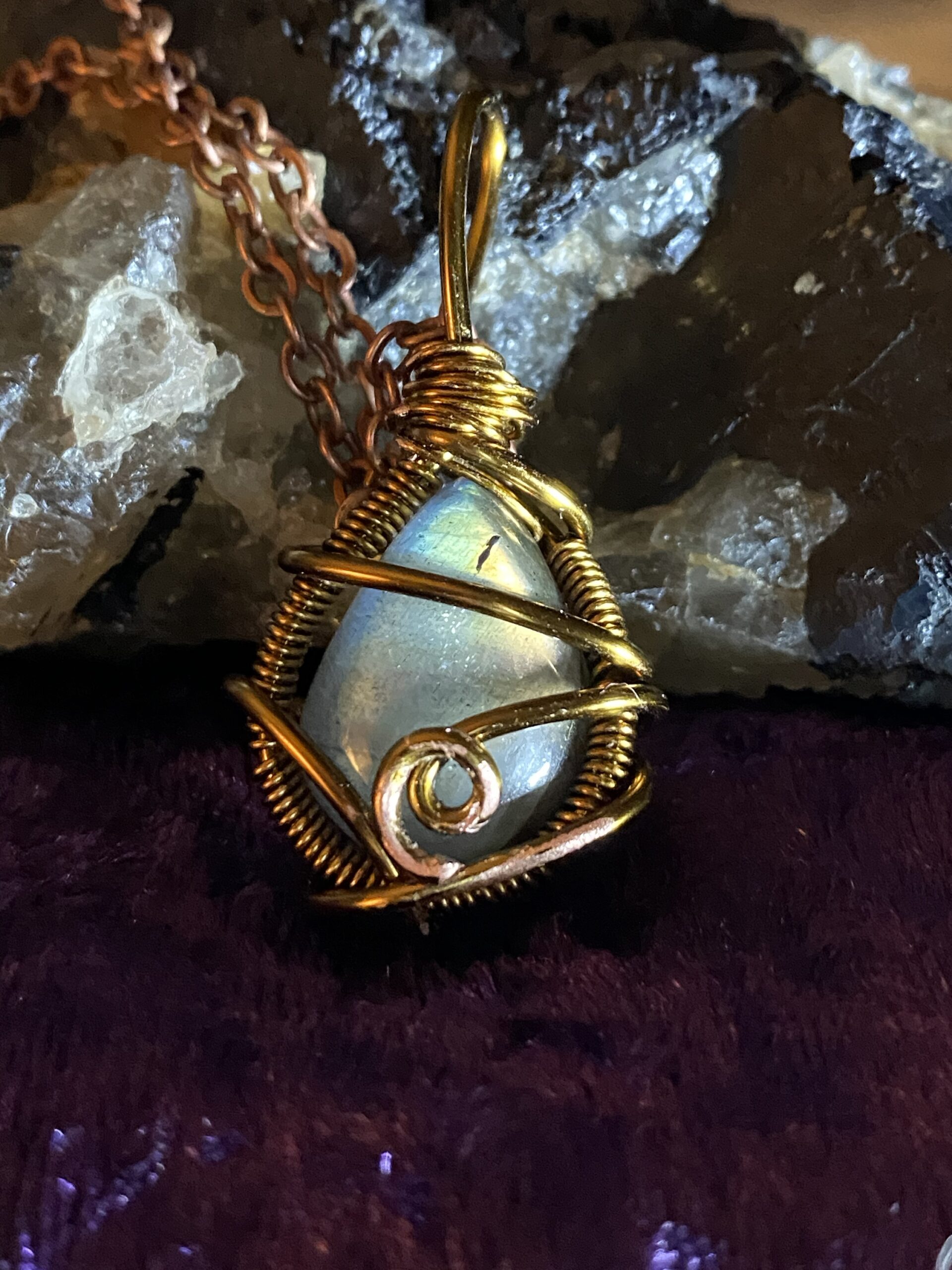 Labradorite wrapped in antique colored copper and hung on a raw copper chain