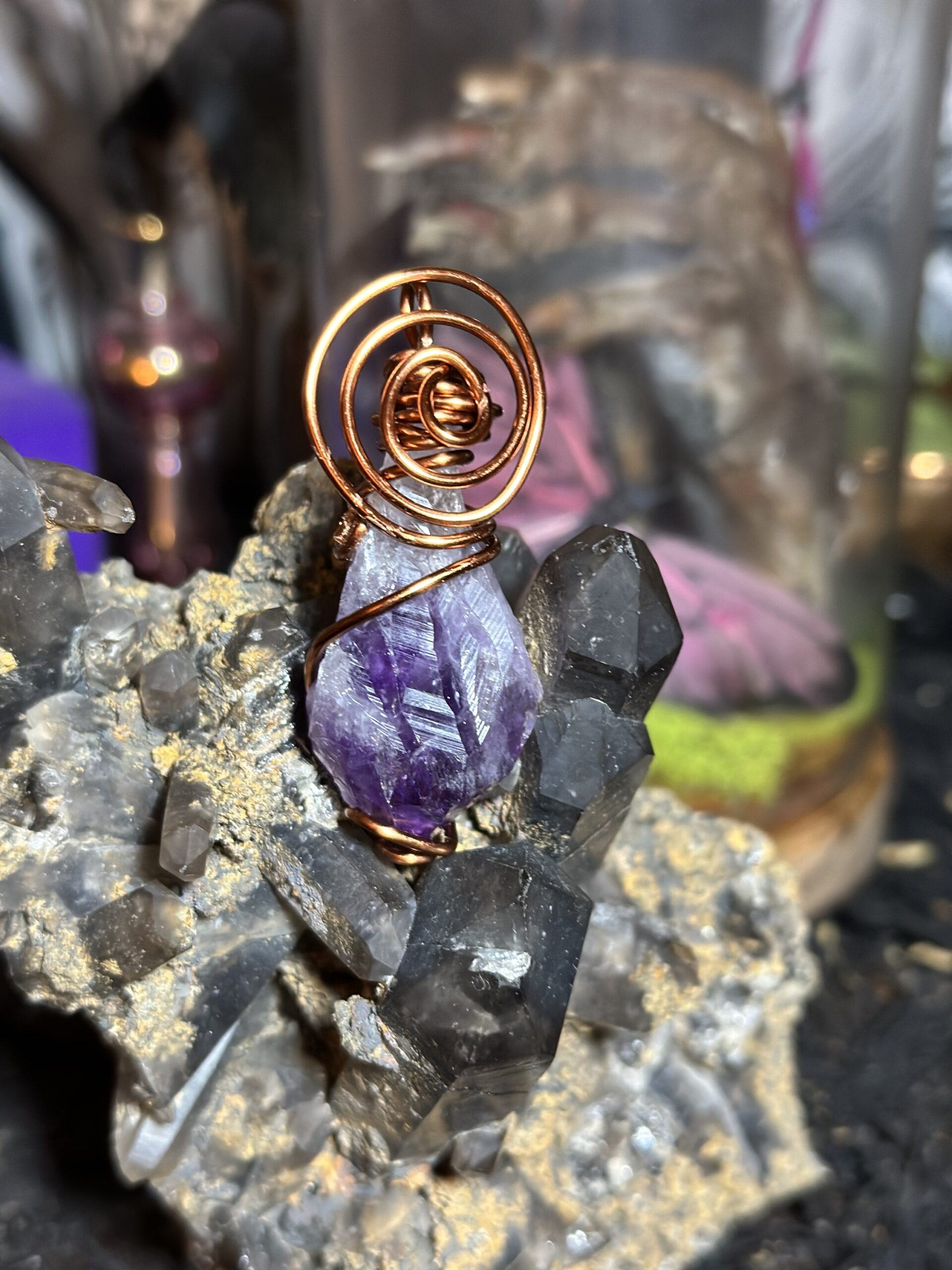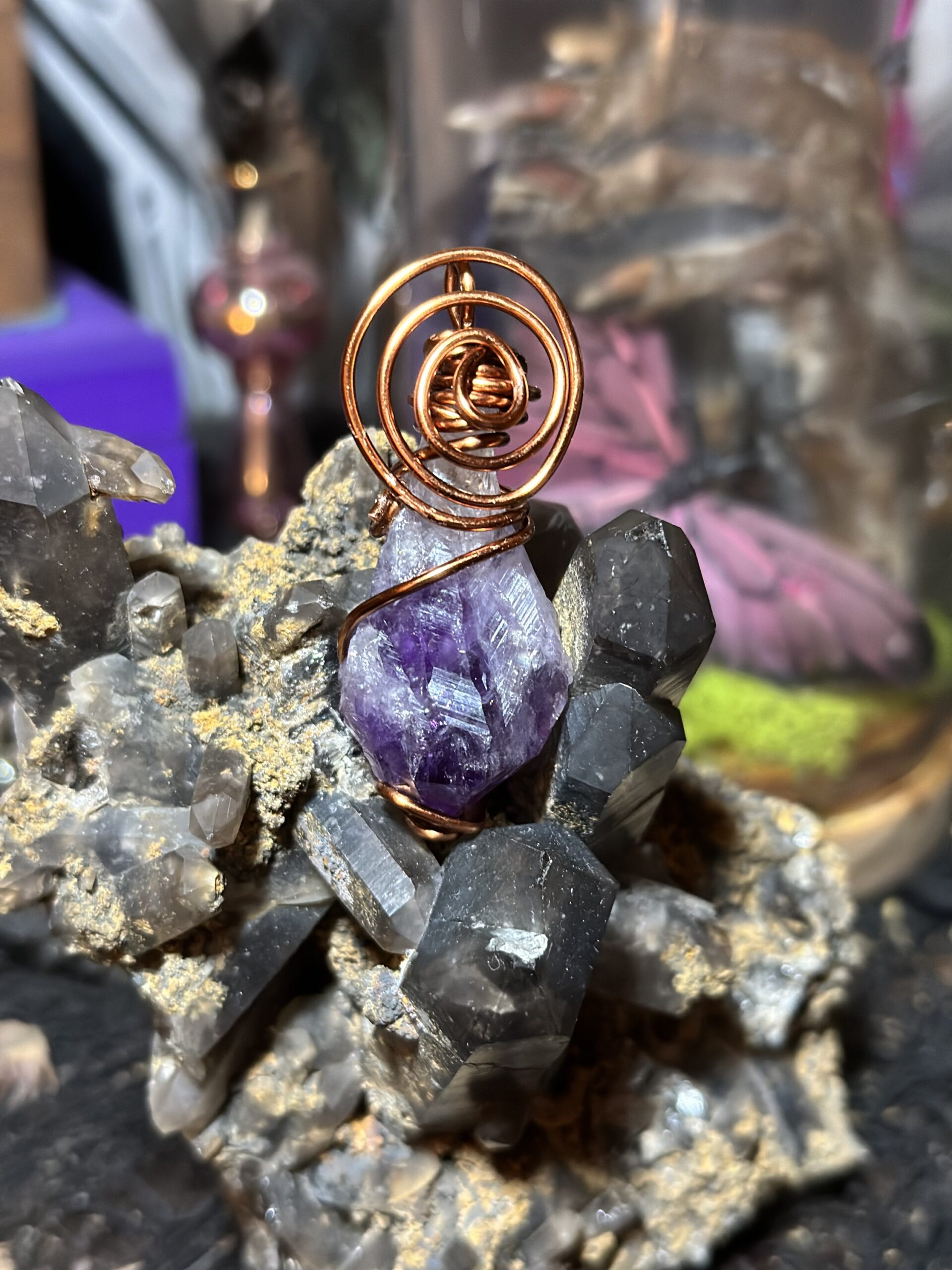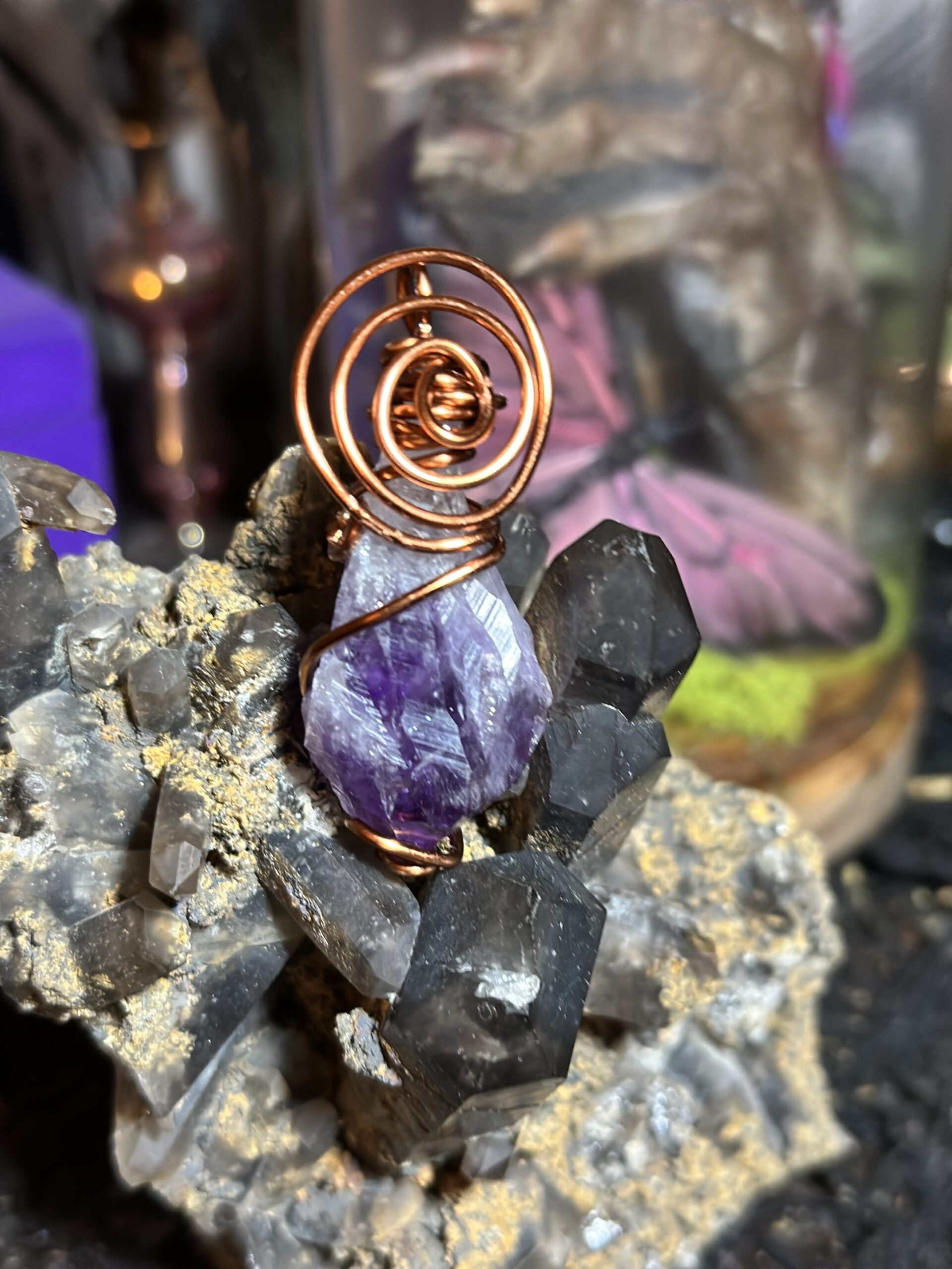 Amethyst point wrapped in chocolate colored copper wire, hung on a copper chain