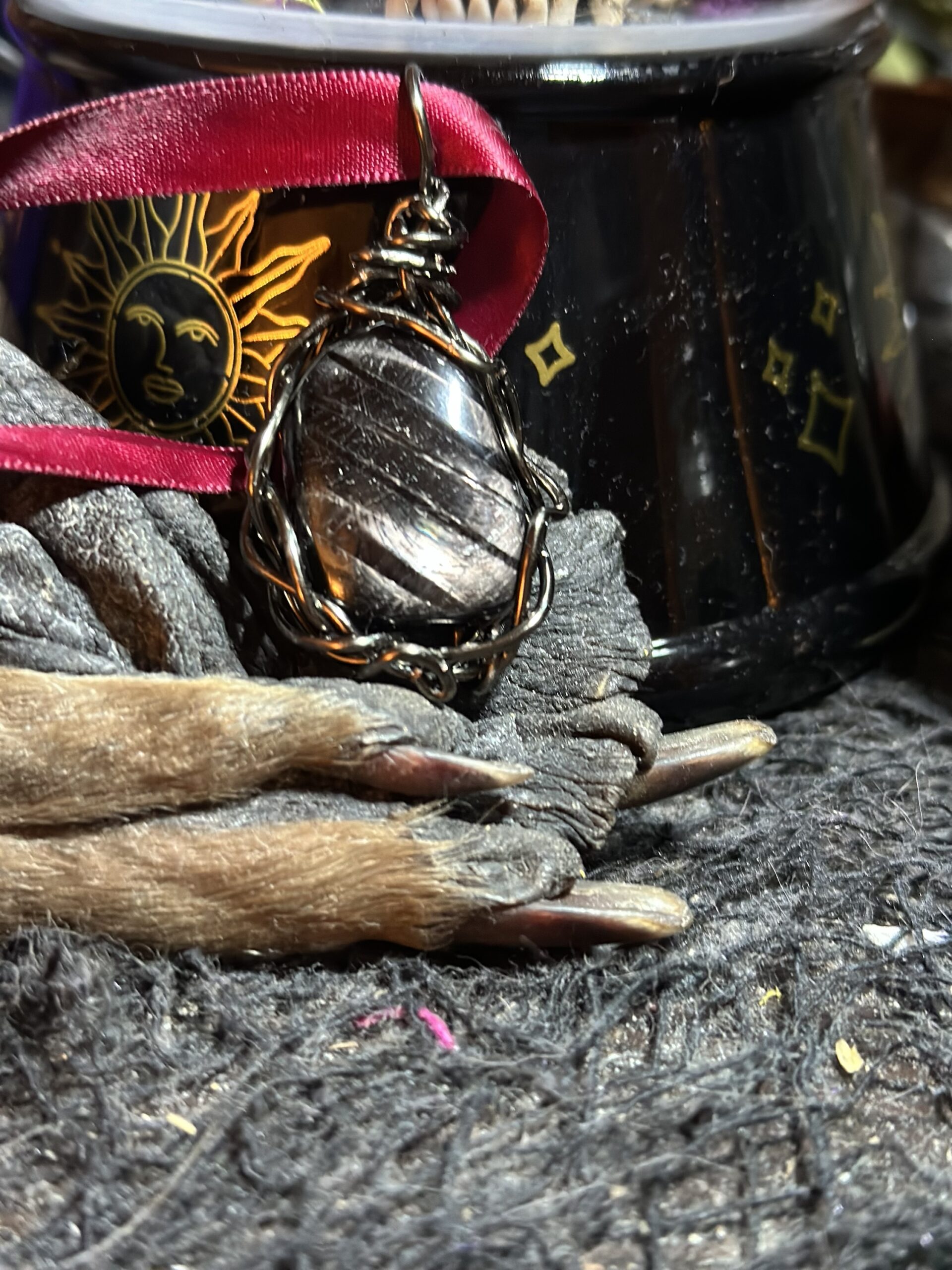 Hypersthene wrapped in gun metal colored copper wire and hung on a burgundy ribbon choker