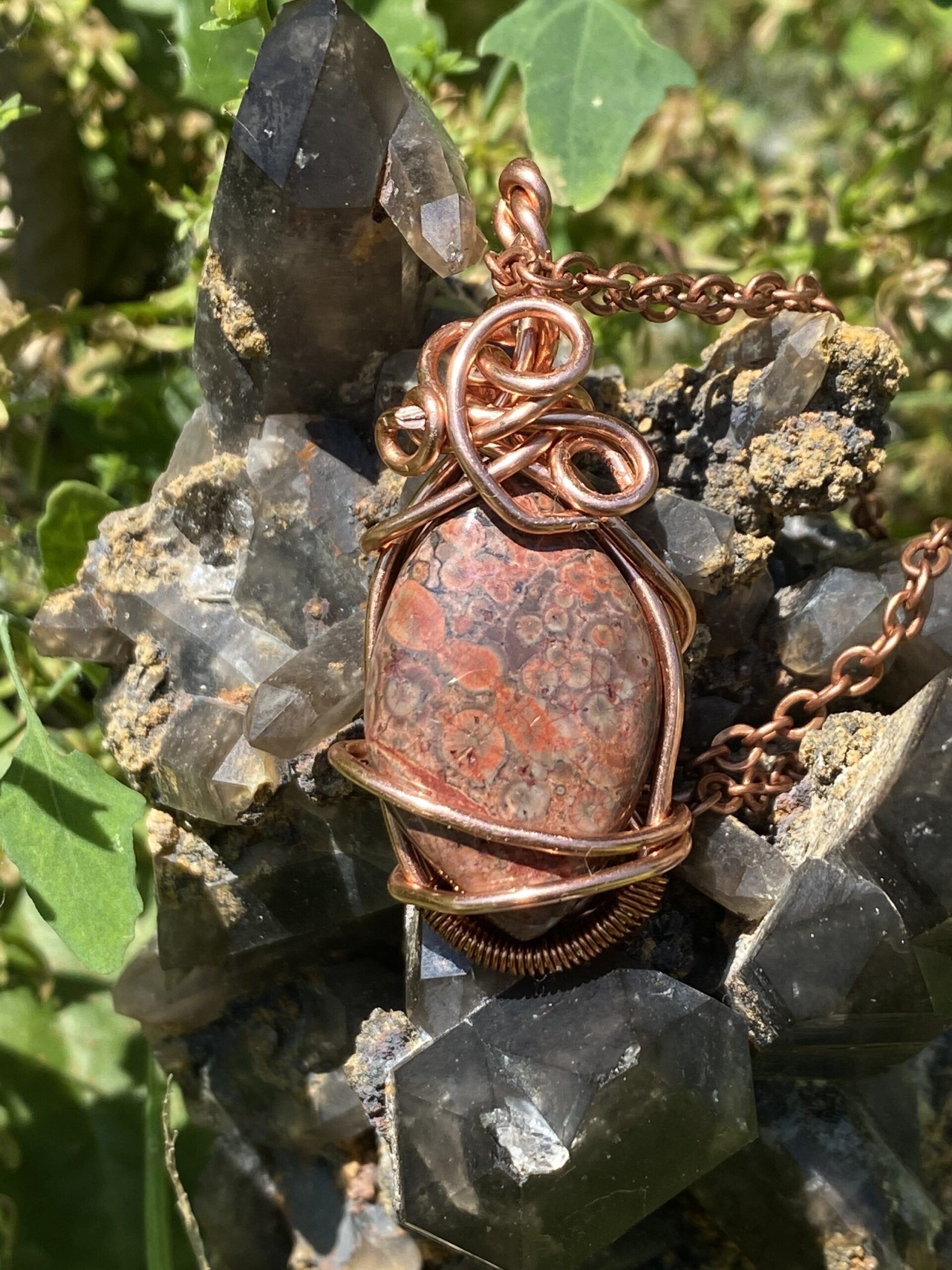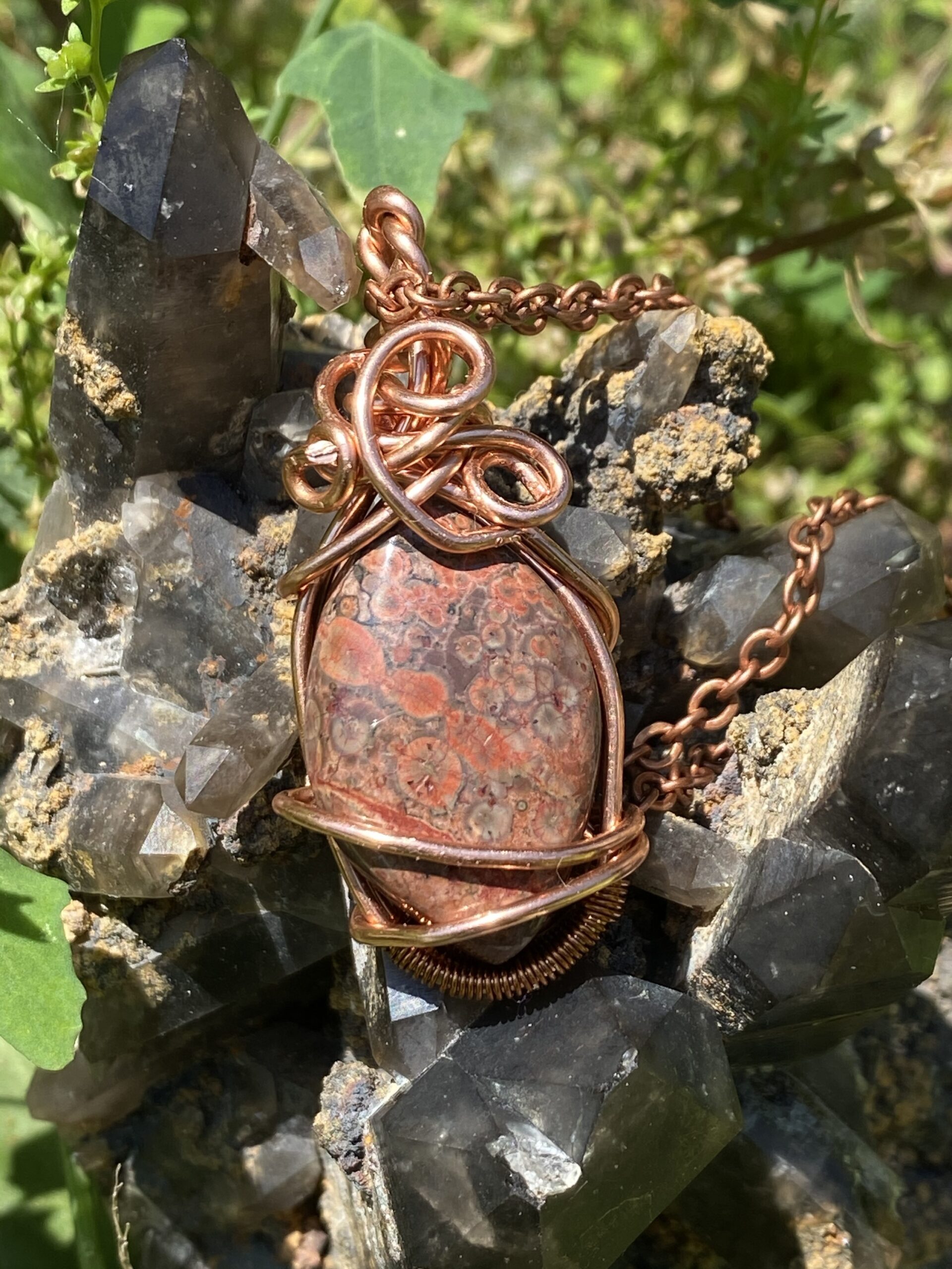 Poppy Jasper wrapped in antique colored copper and hung on a raw copper chain