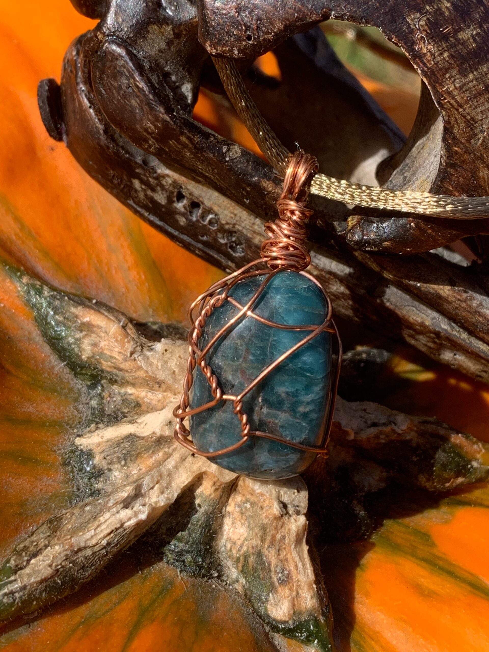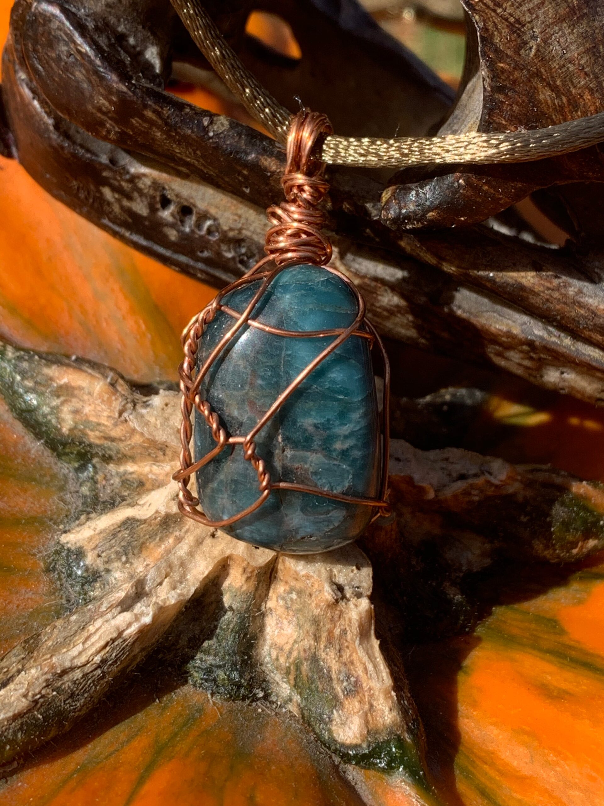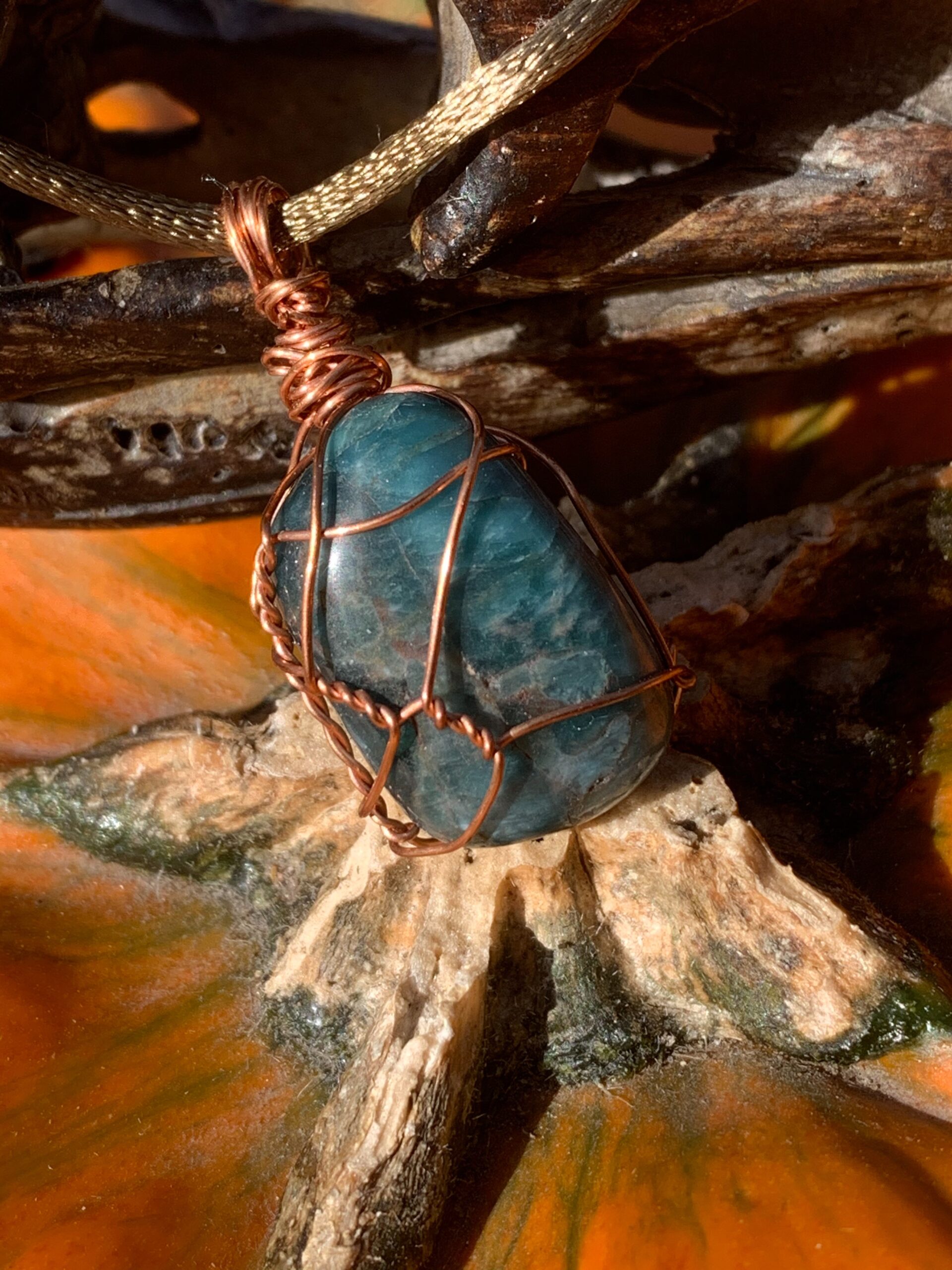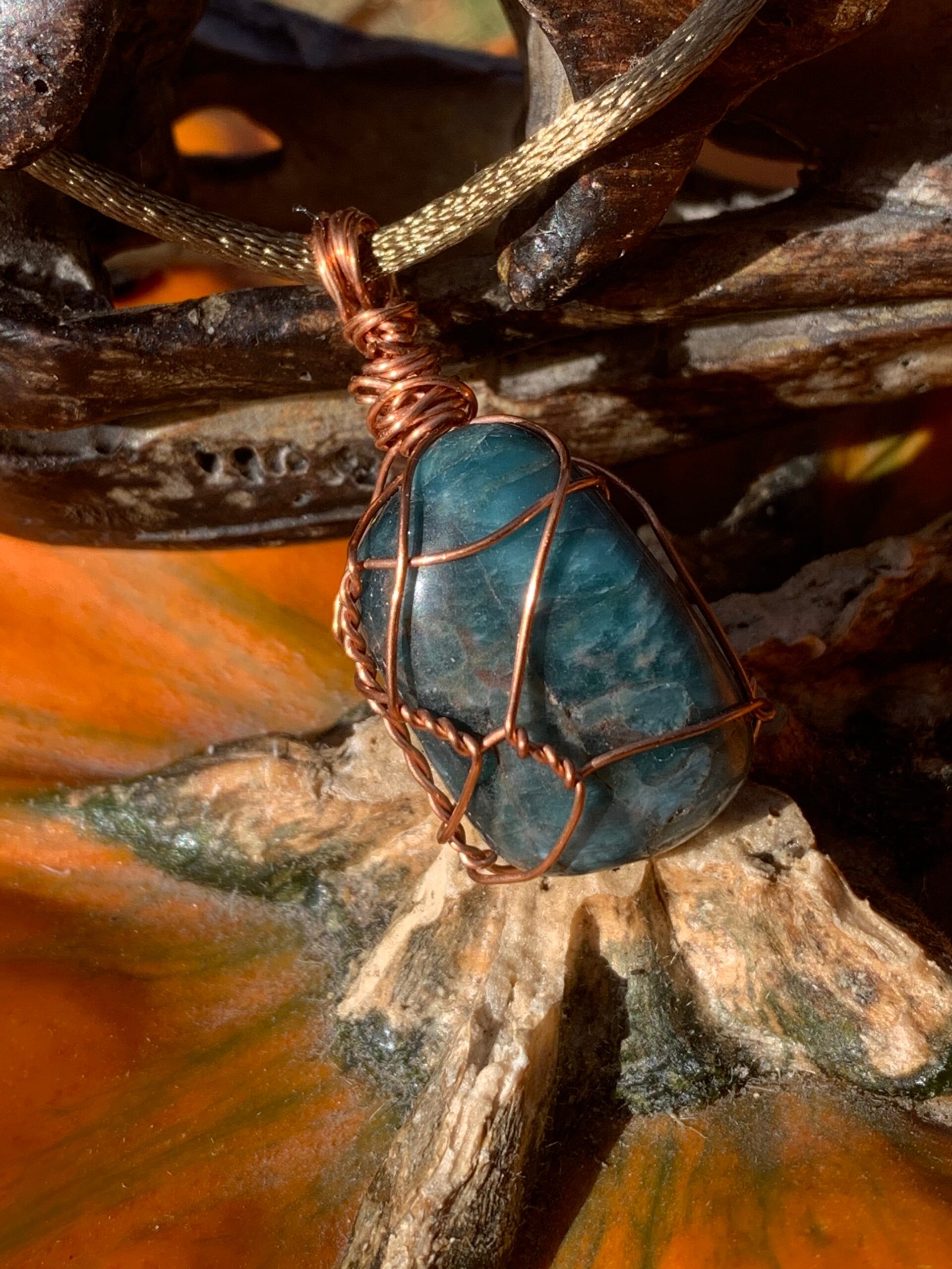 Apatite wrapped in raw copper, hung on an olive green silky cord