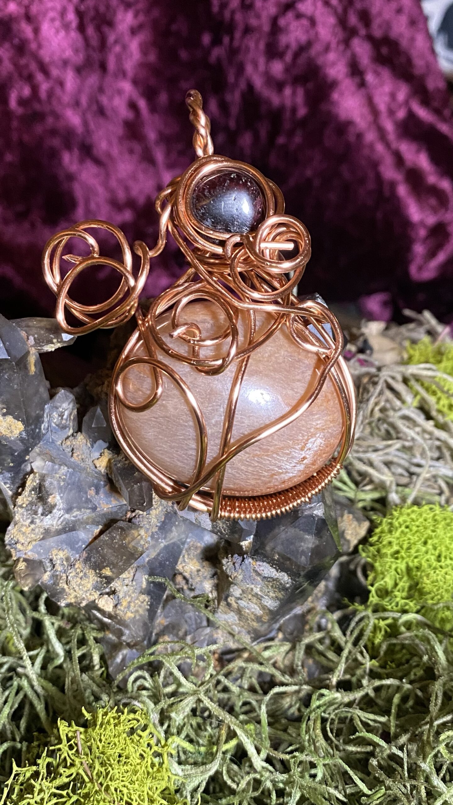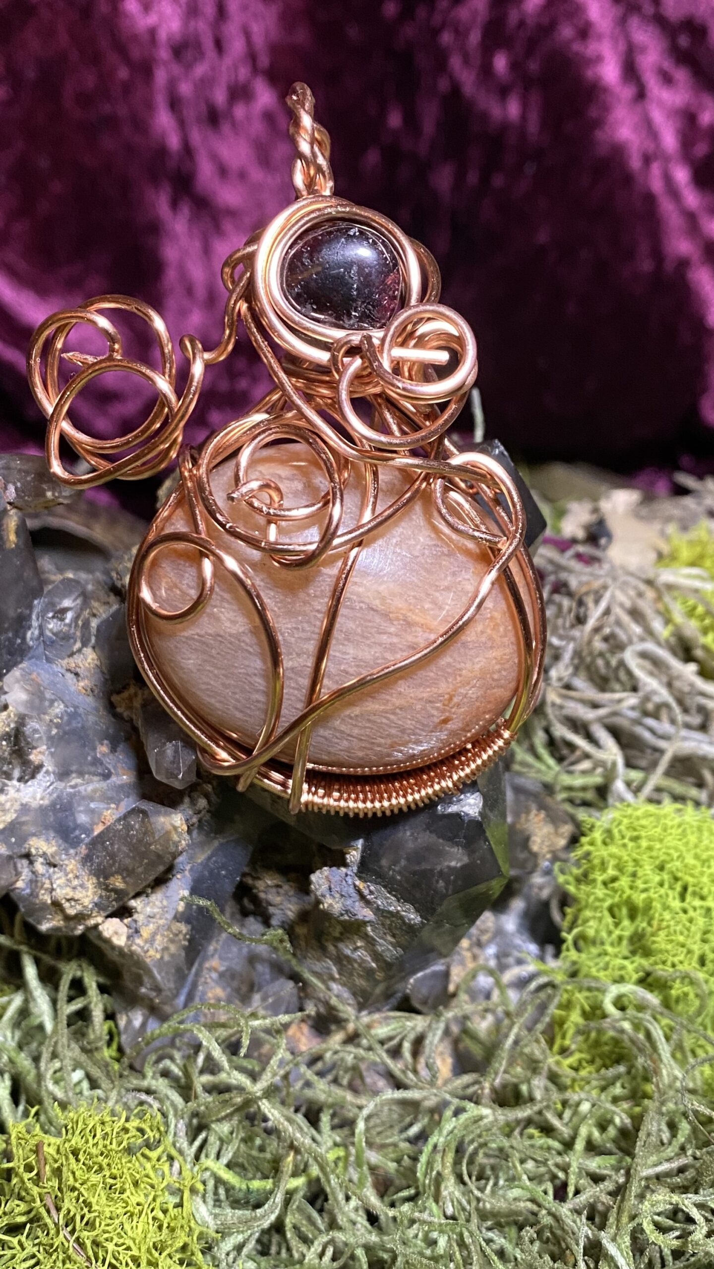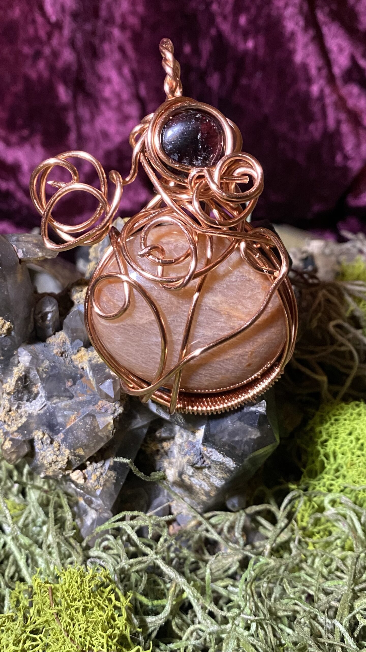 Fire agate and garnet wrapped in rose gold colored copper, comes hung on a rose gold colored metal chain