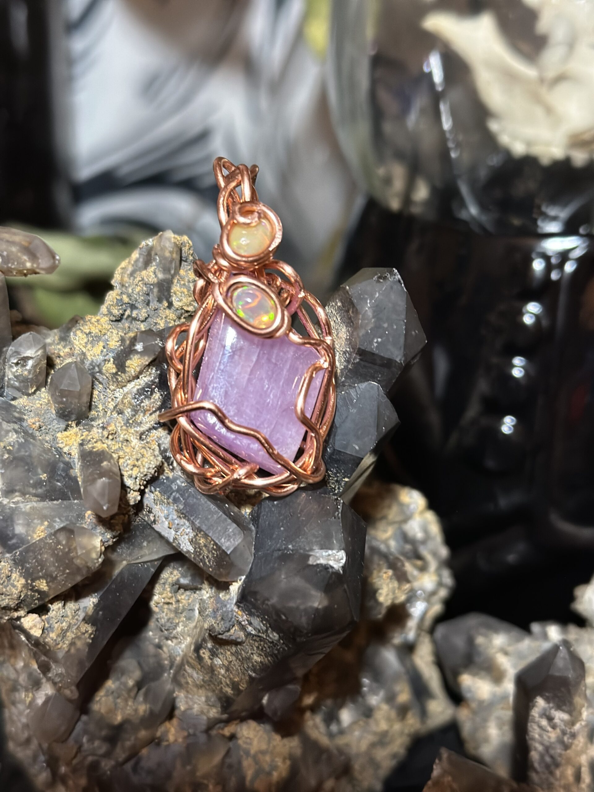 Kunzite and double opal wrapped in rose gold colored copper, hung on a delicate rose gold colored metal chain