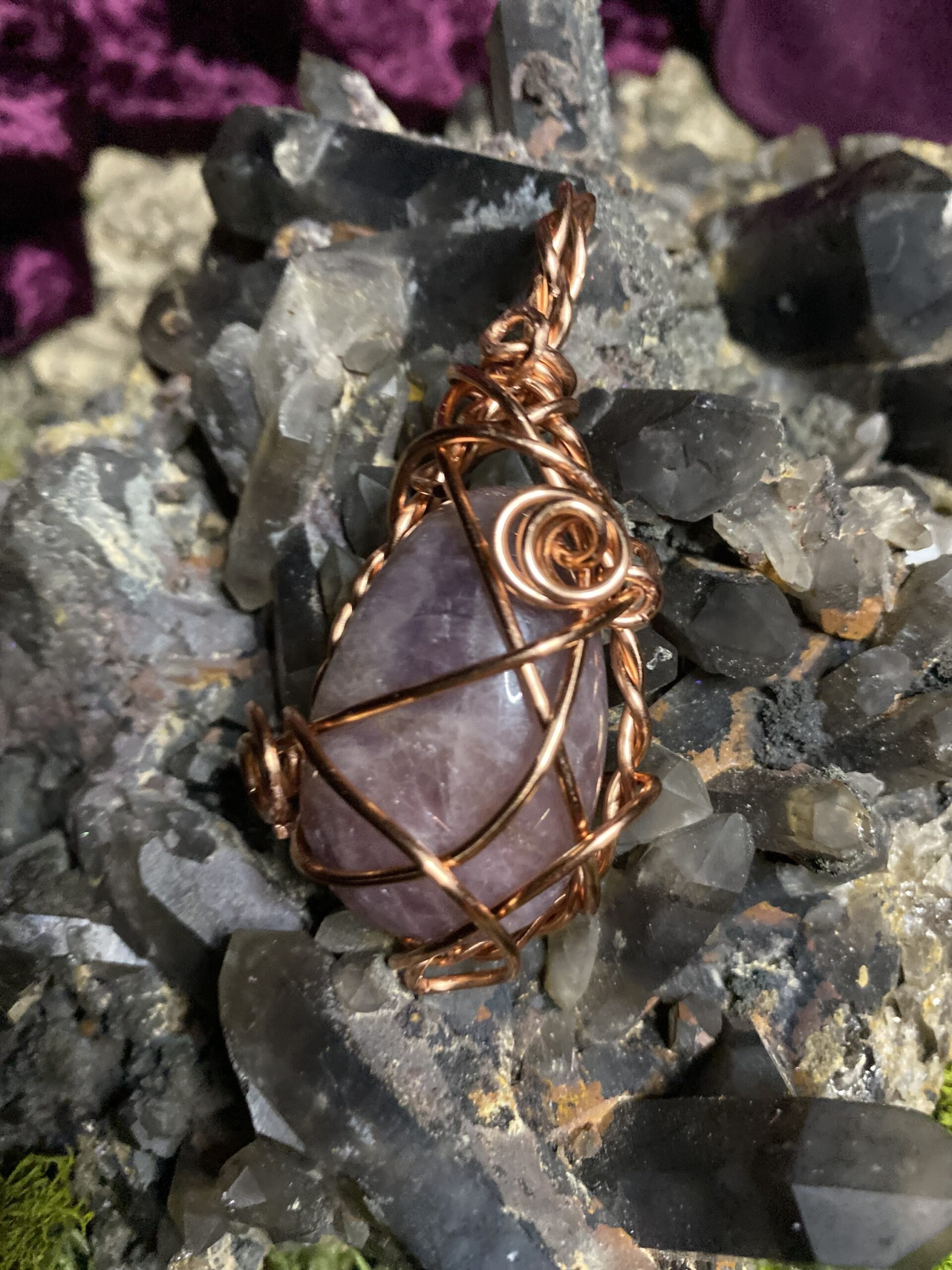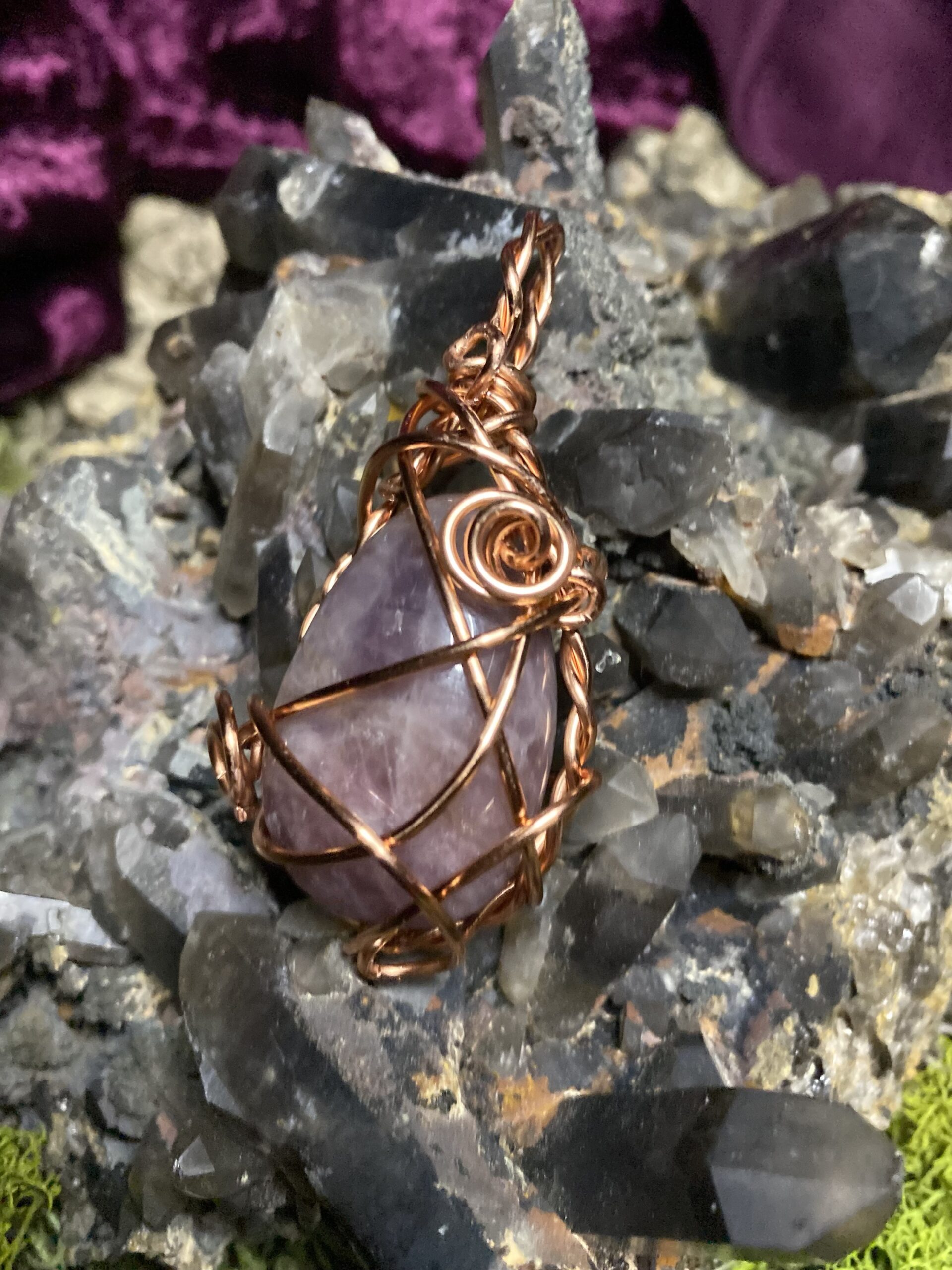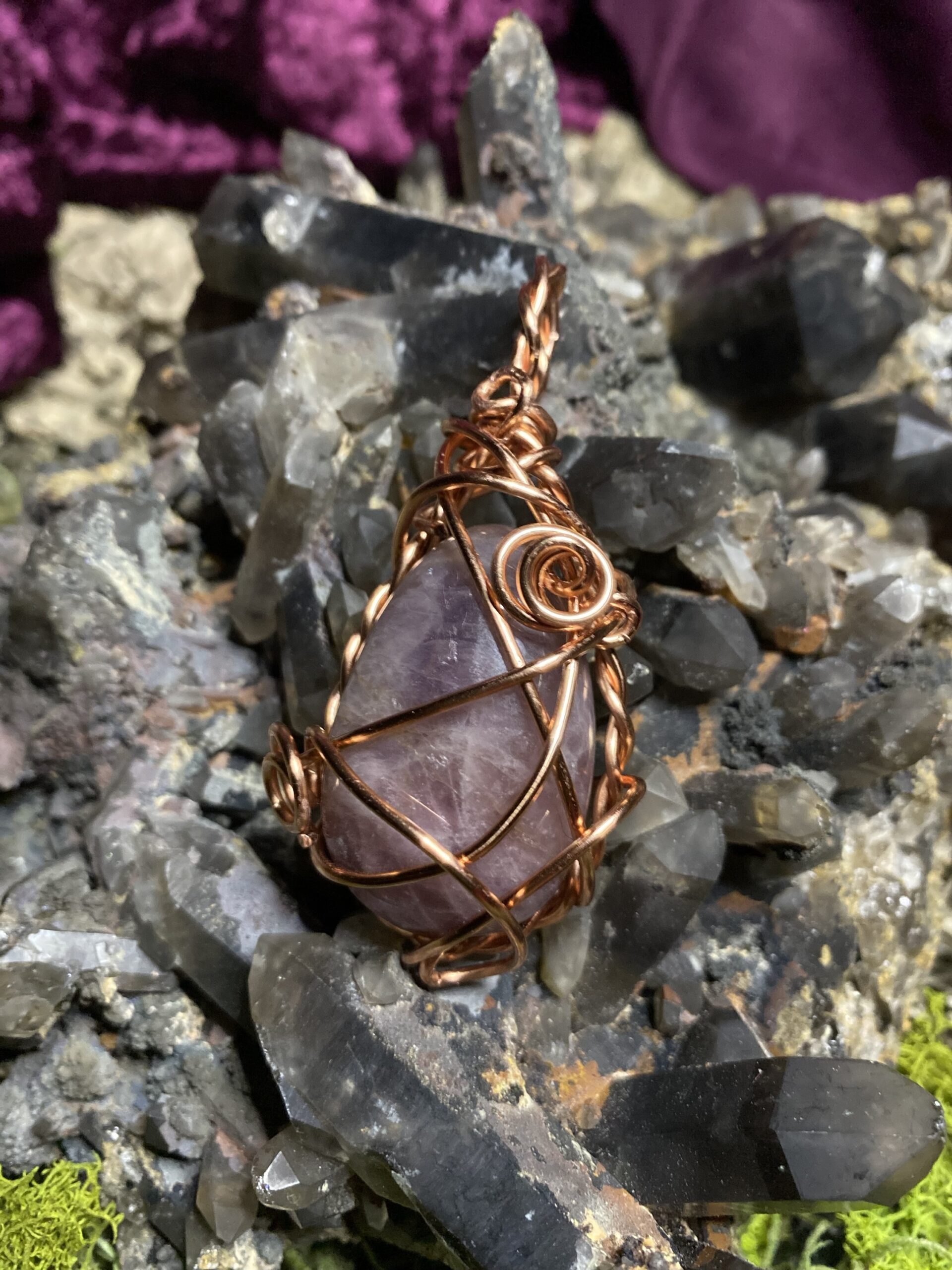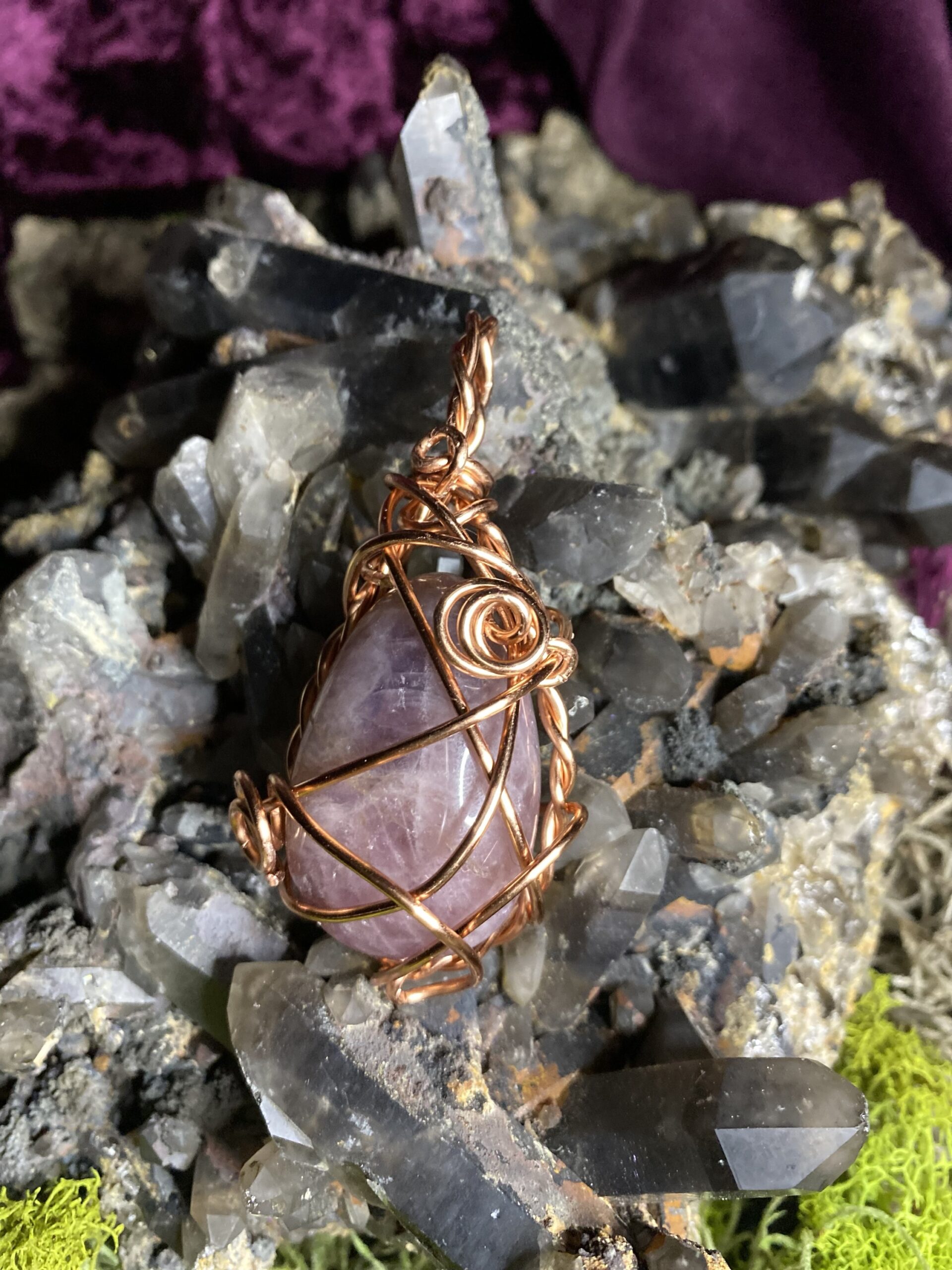 Pink amethyst wrapped in raw copper and hung on a delicate raw copper chain choker
