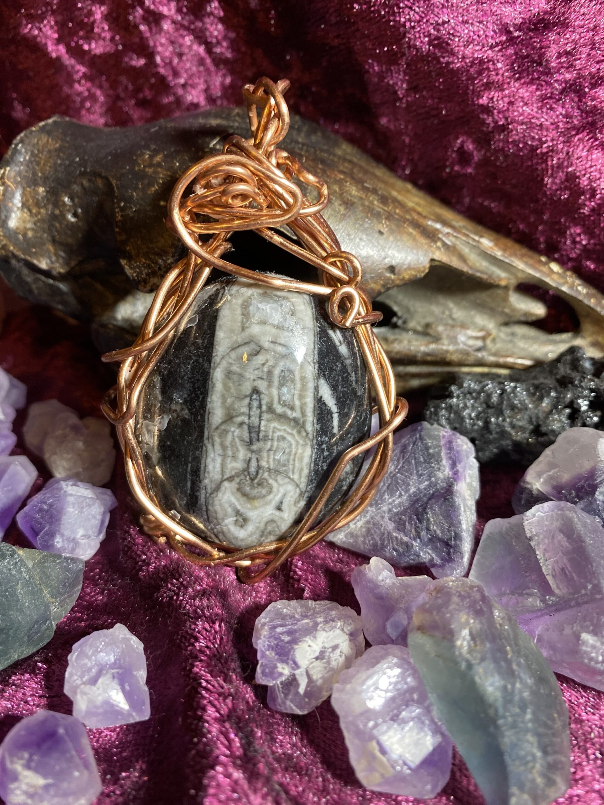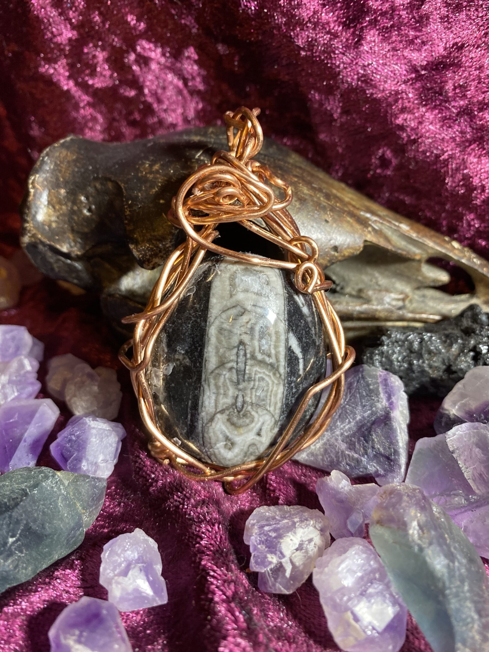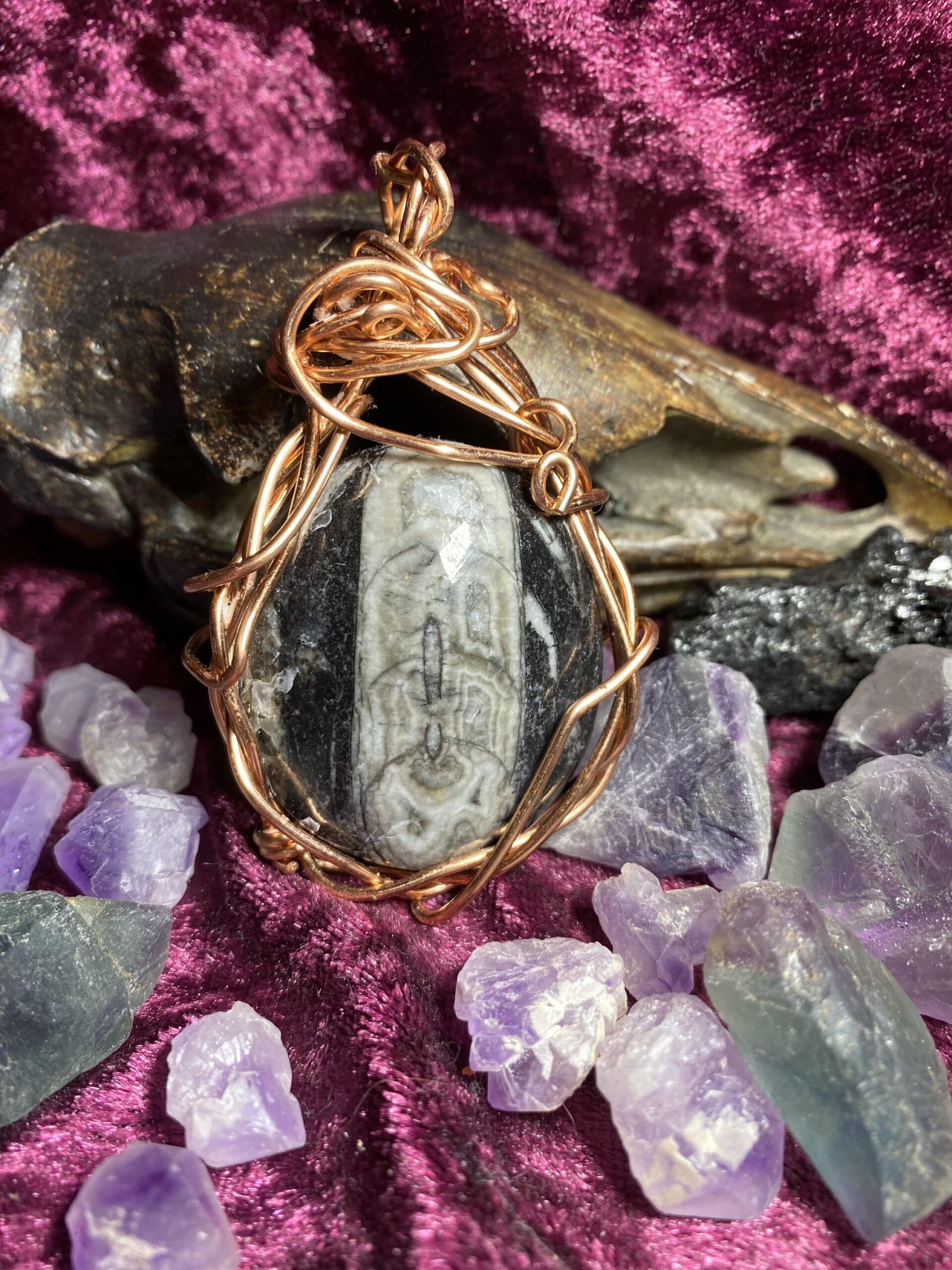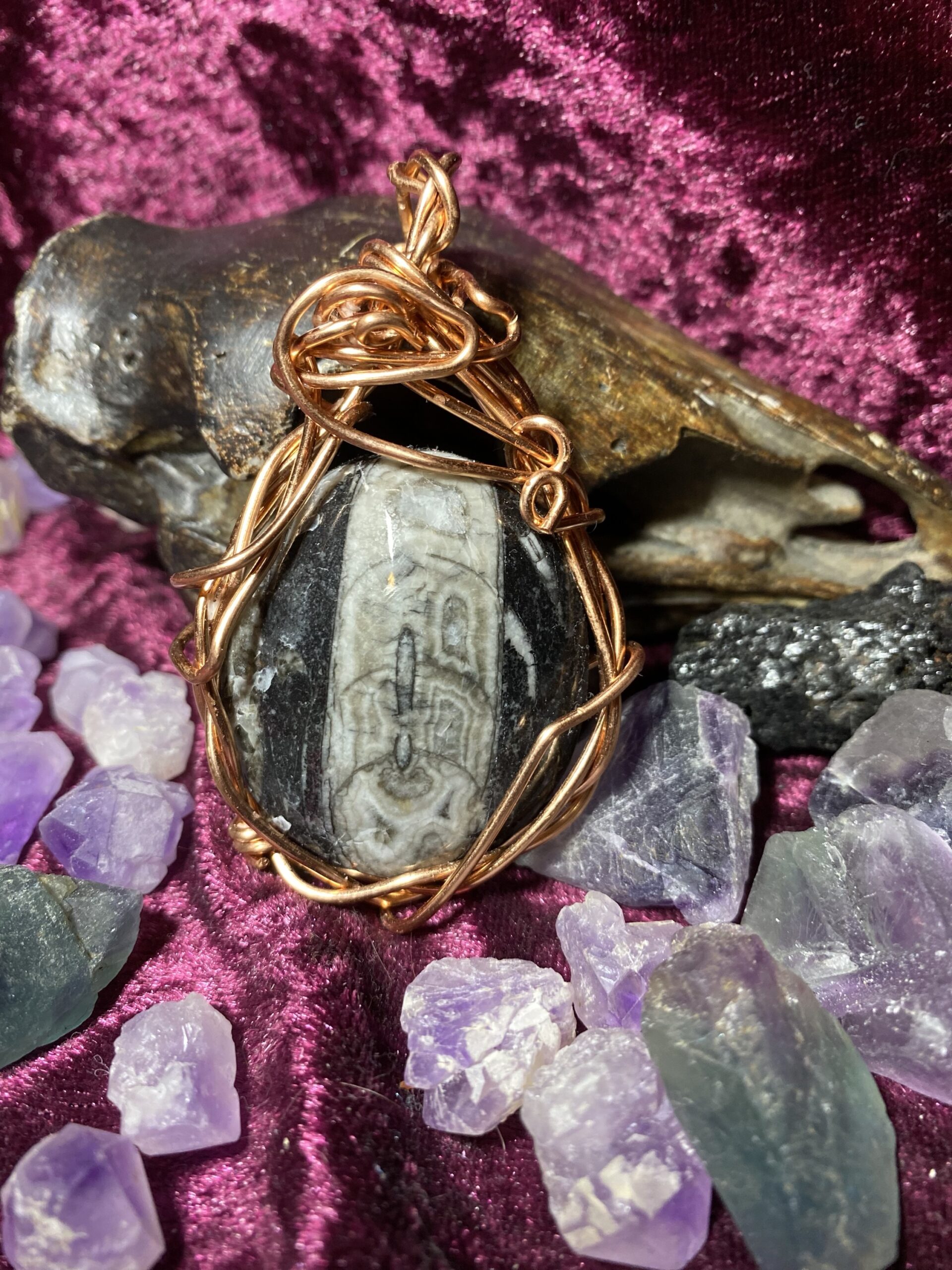 Othroceras fossil wrapped in copper and hung on a rose gold colored metal chain