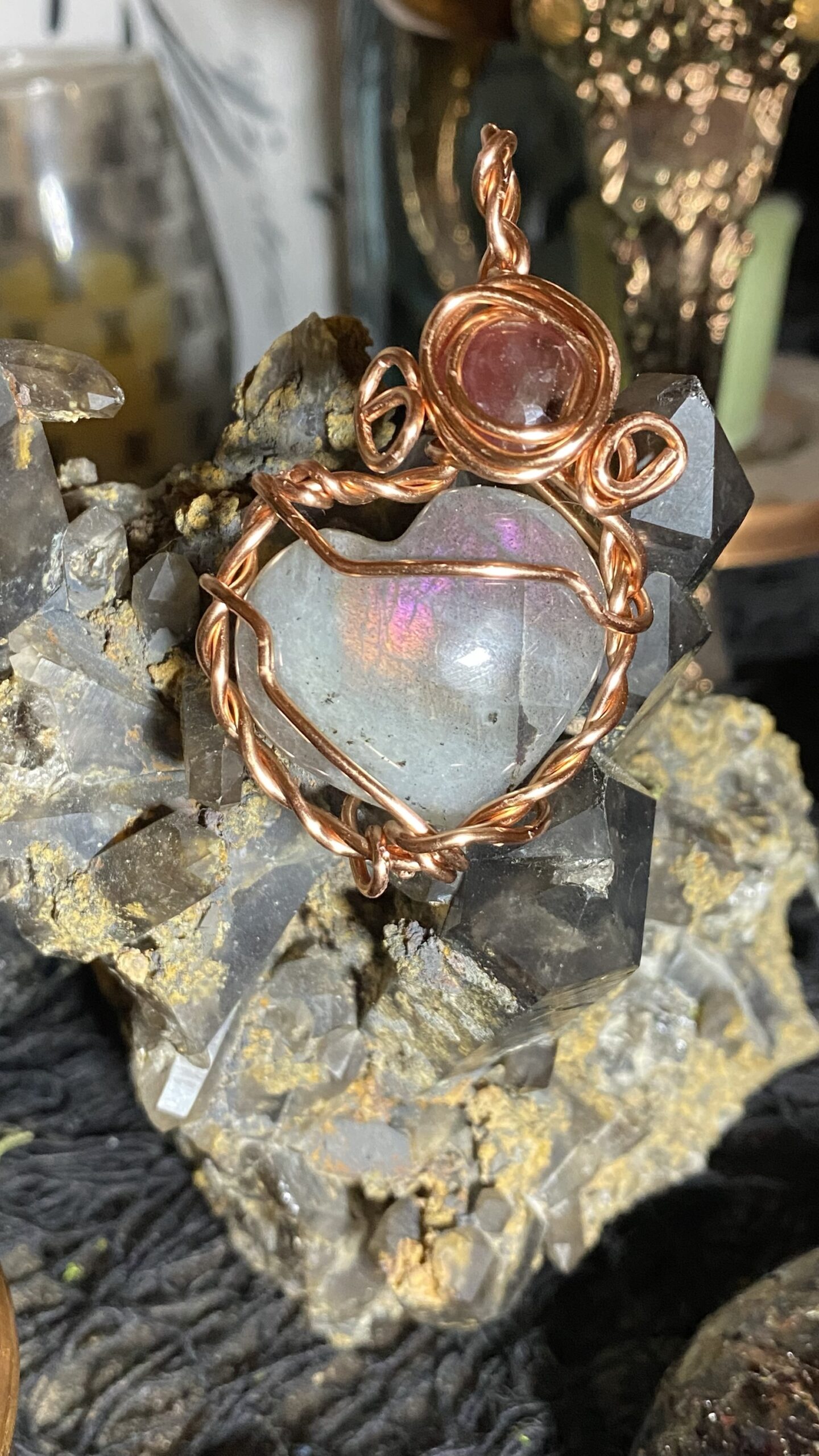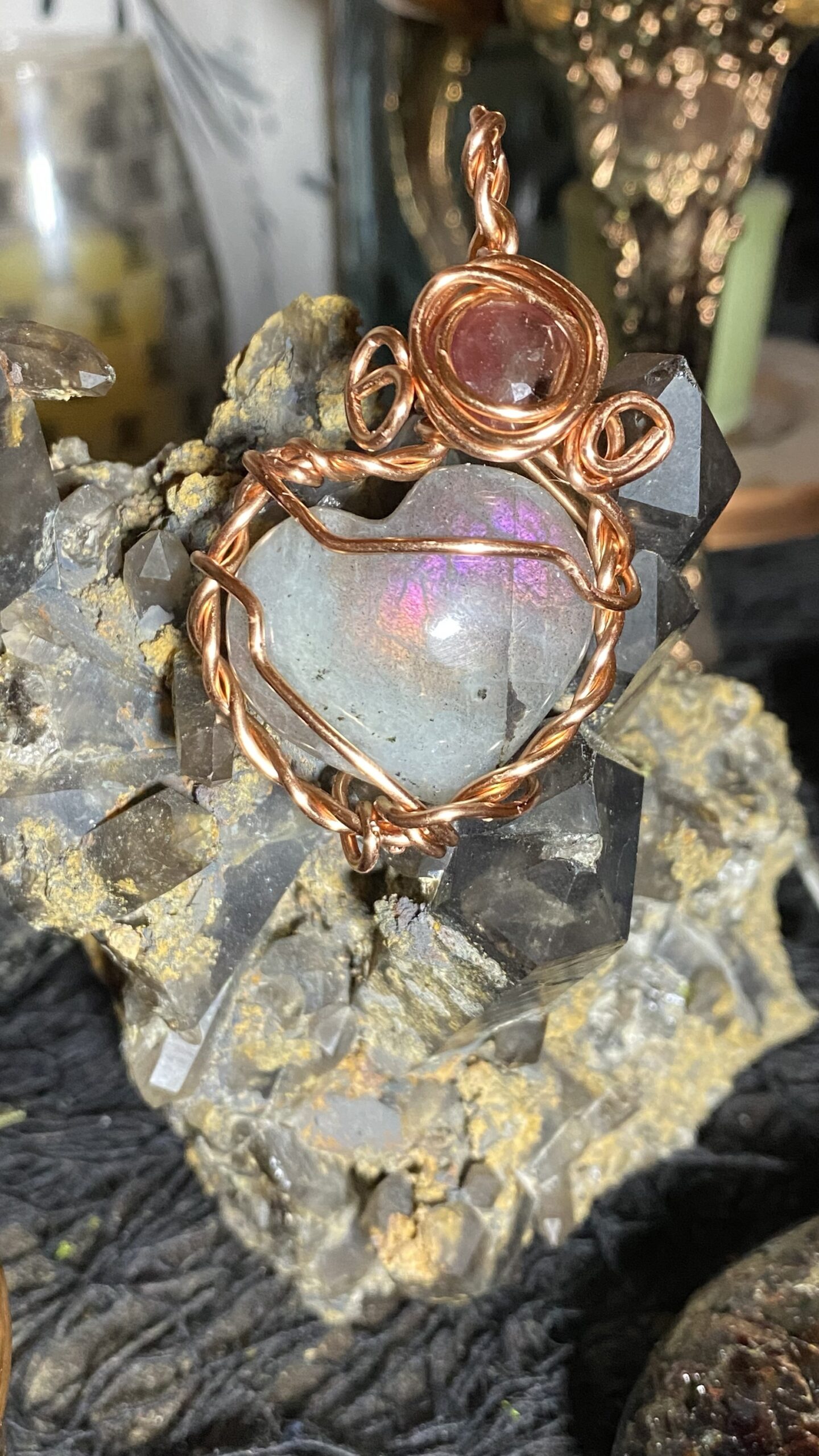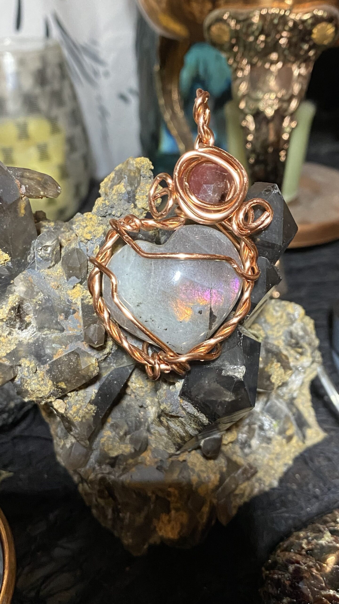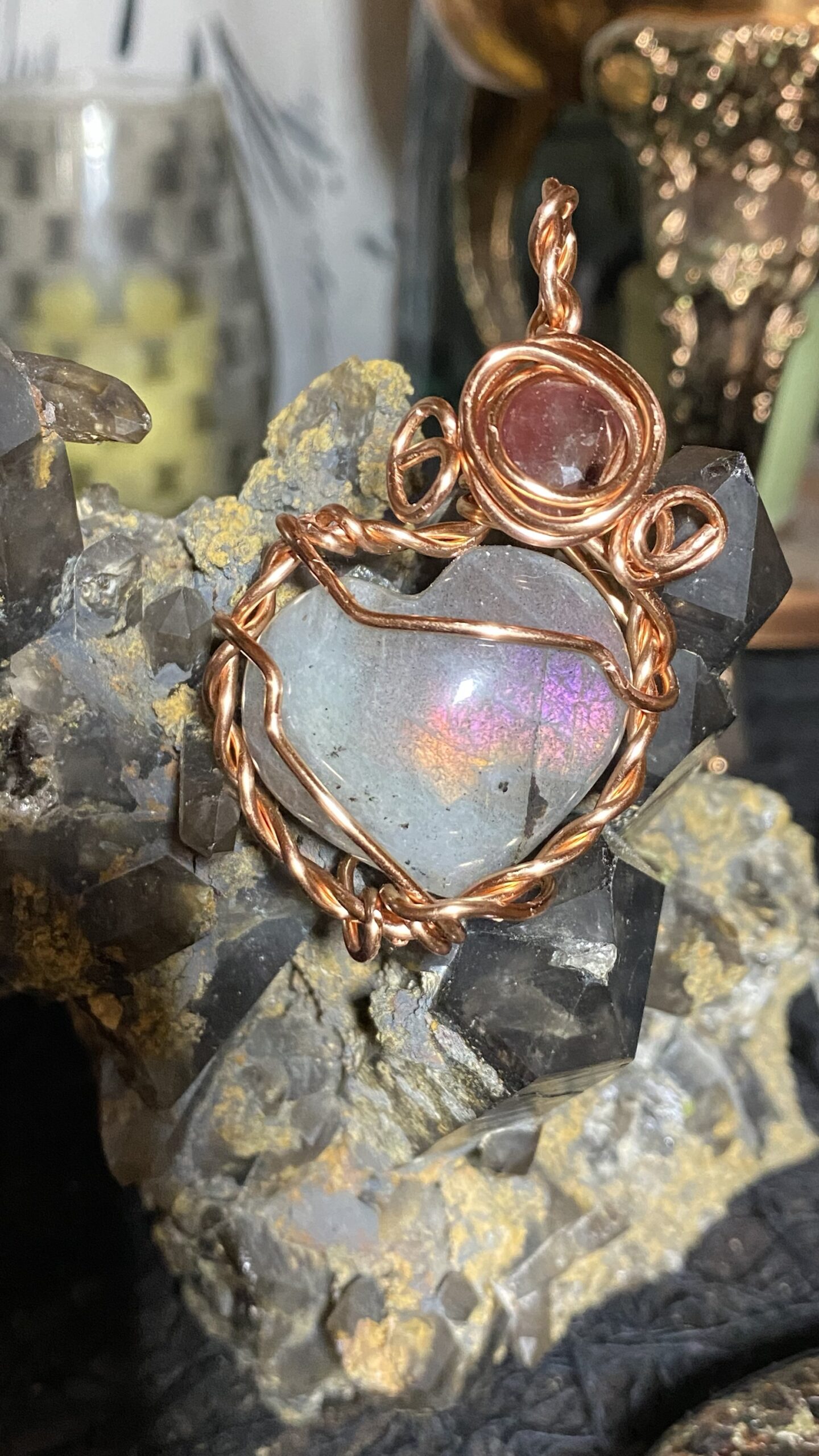 Pink and orange flash labradorite and pink sapphire wrapped in raw copper, hung on a raw copper chain
