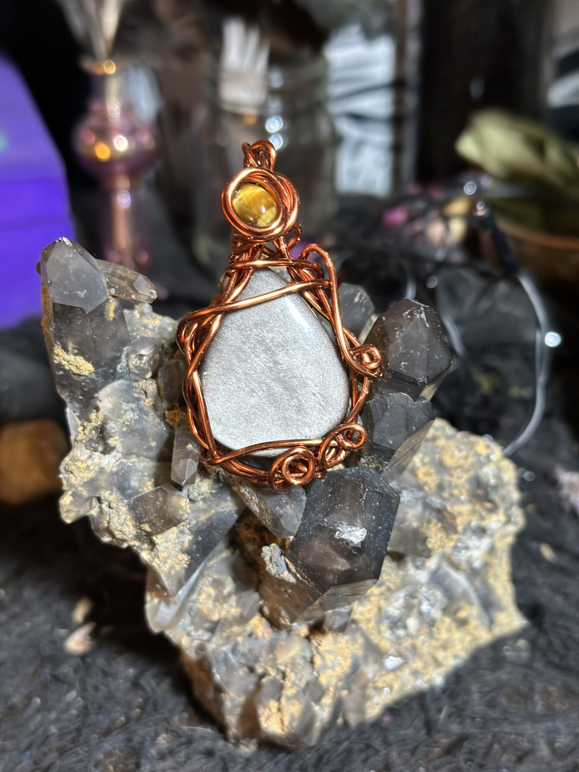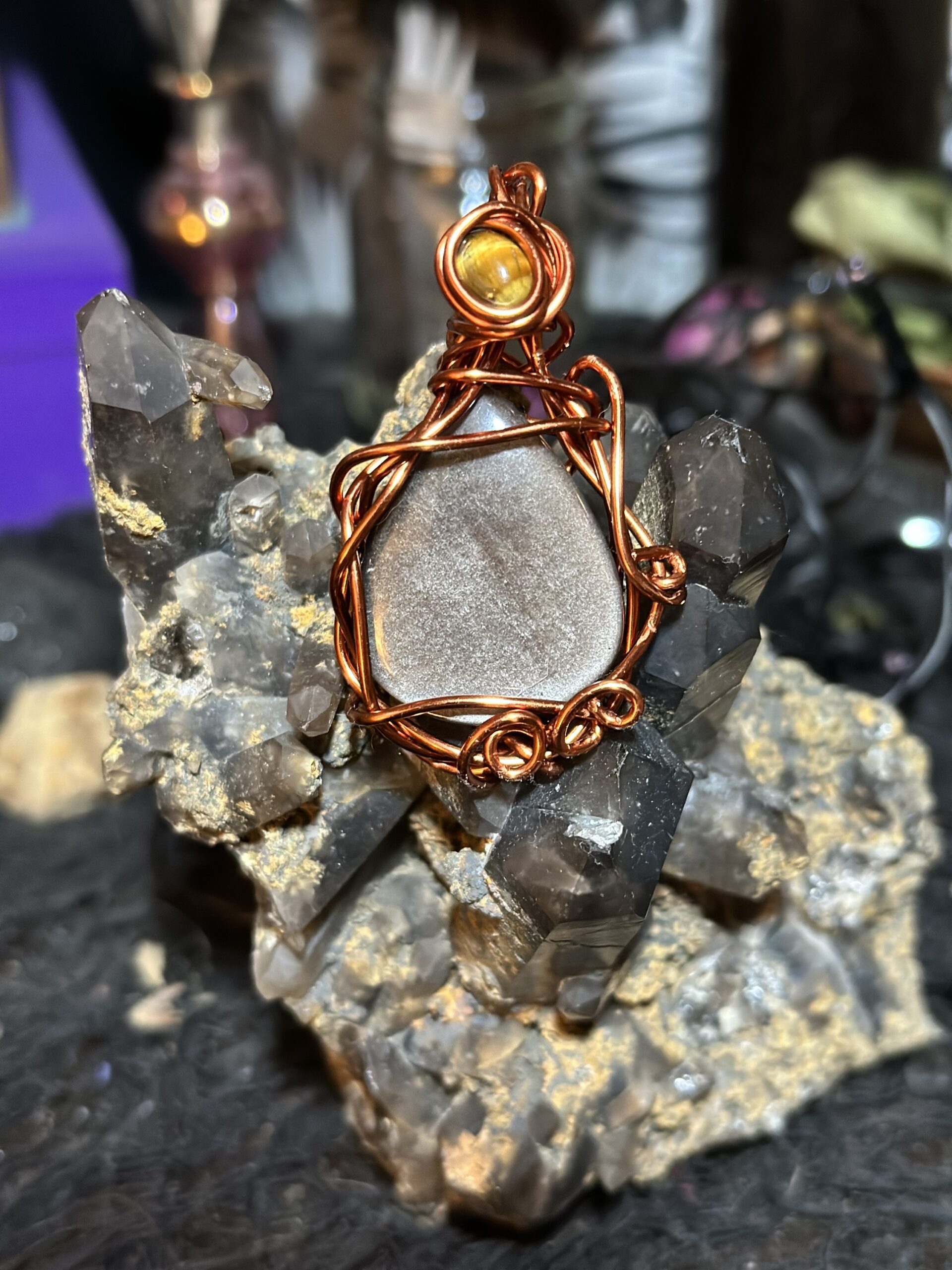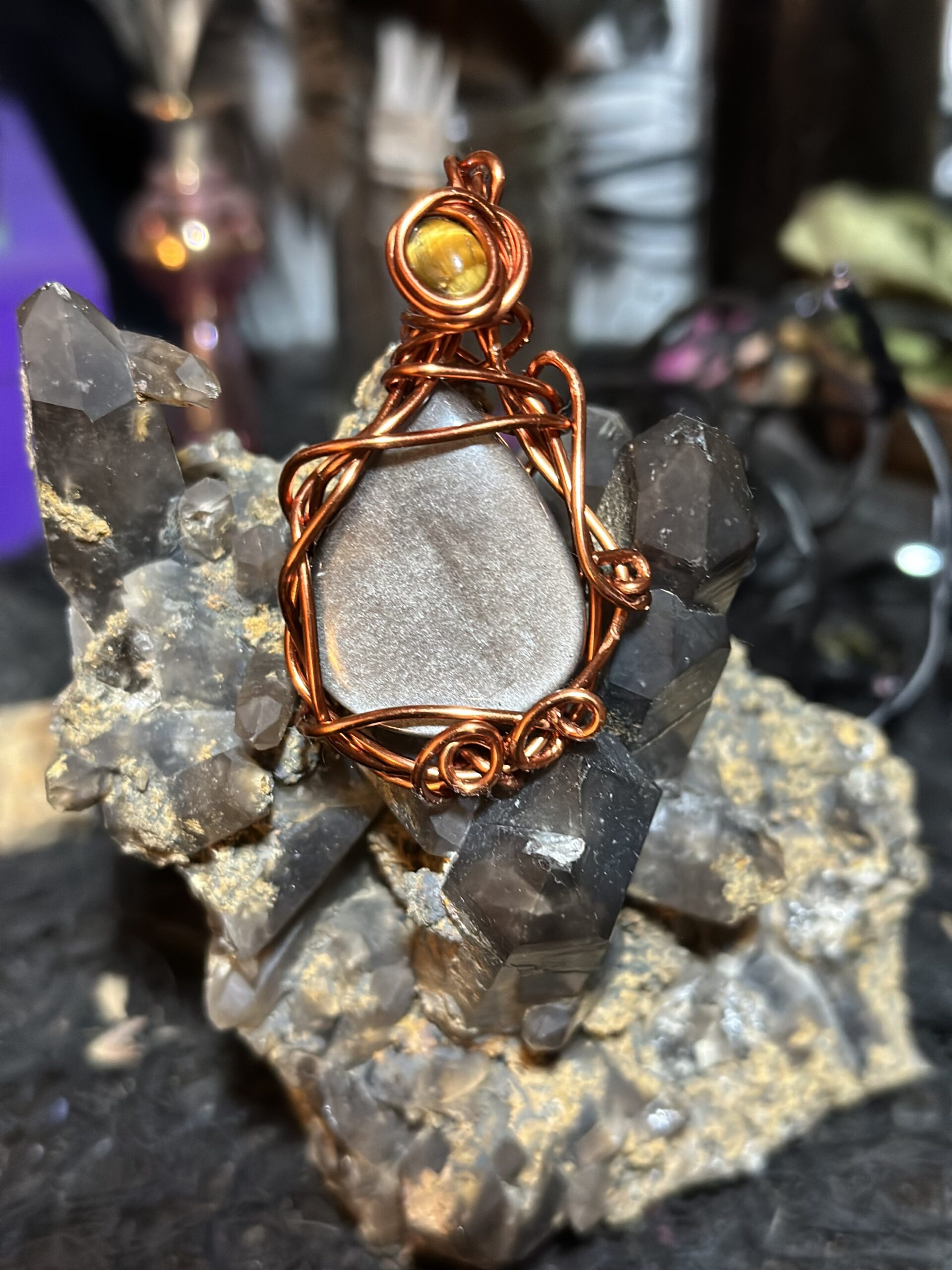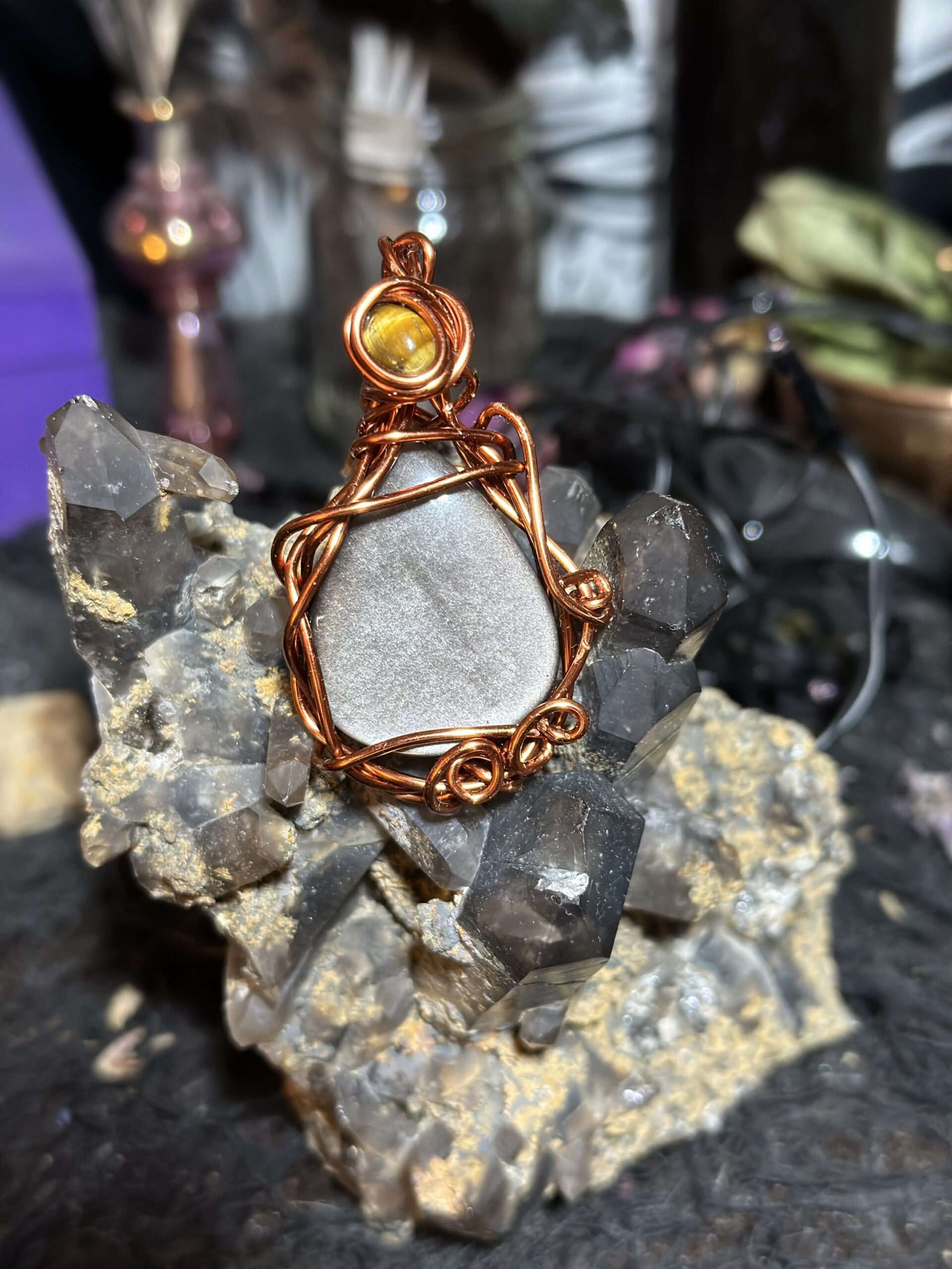 Silver sheen obsidian paired with tigers eye, wrapped in chocolate colored copper wire and hung on a copper chain