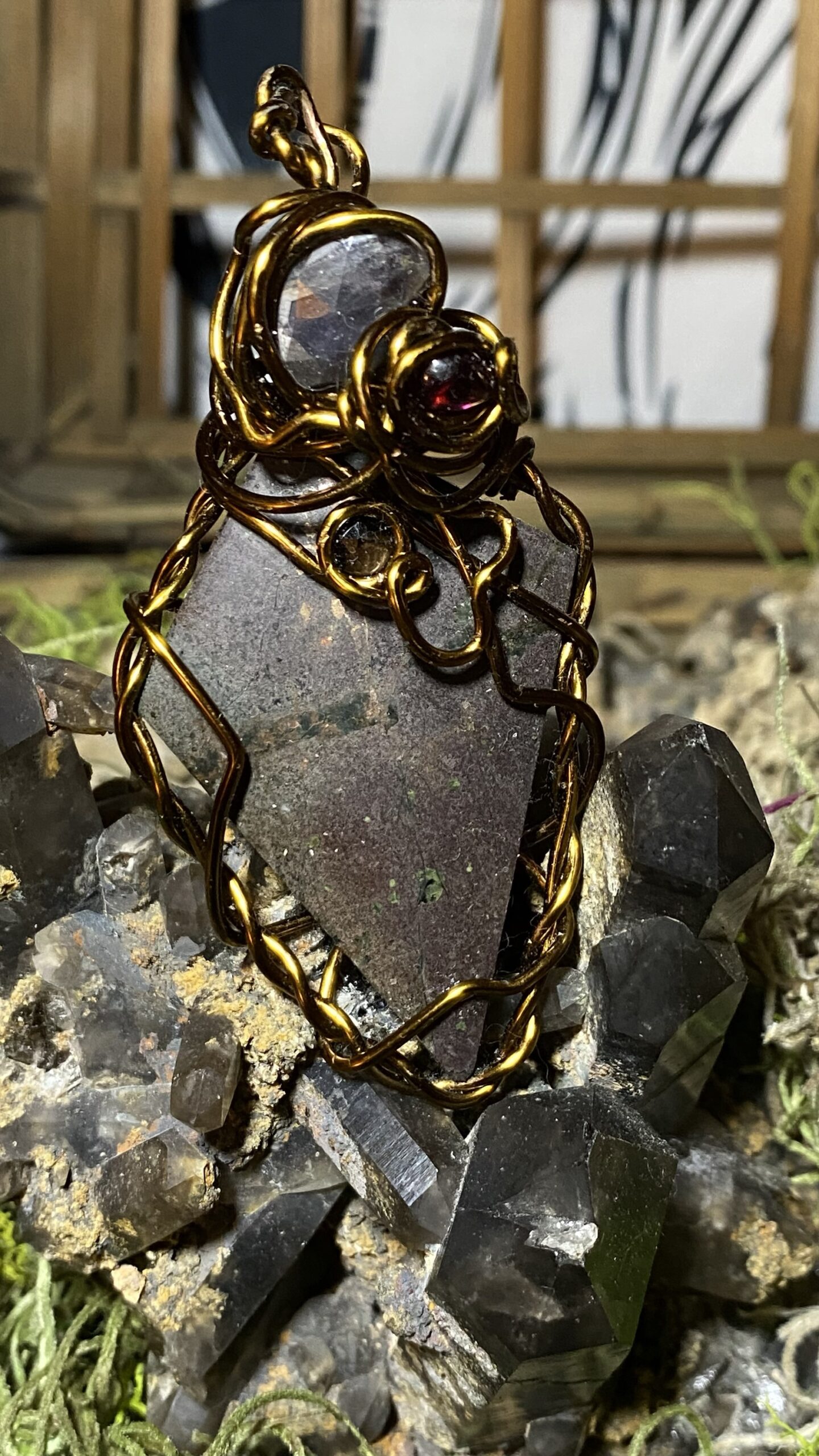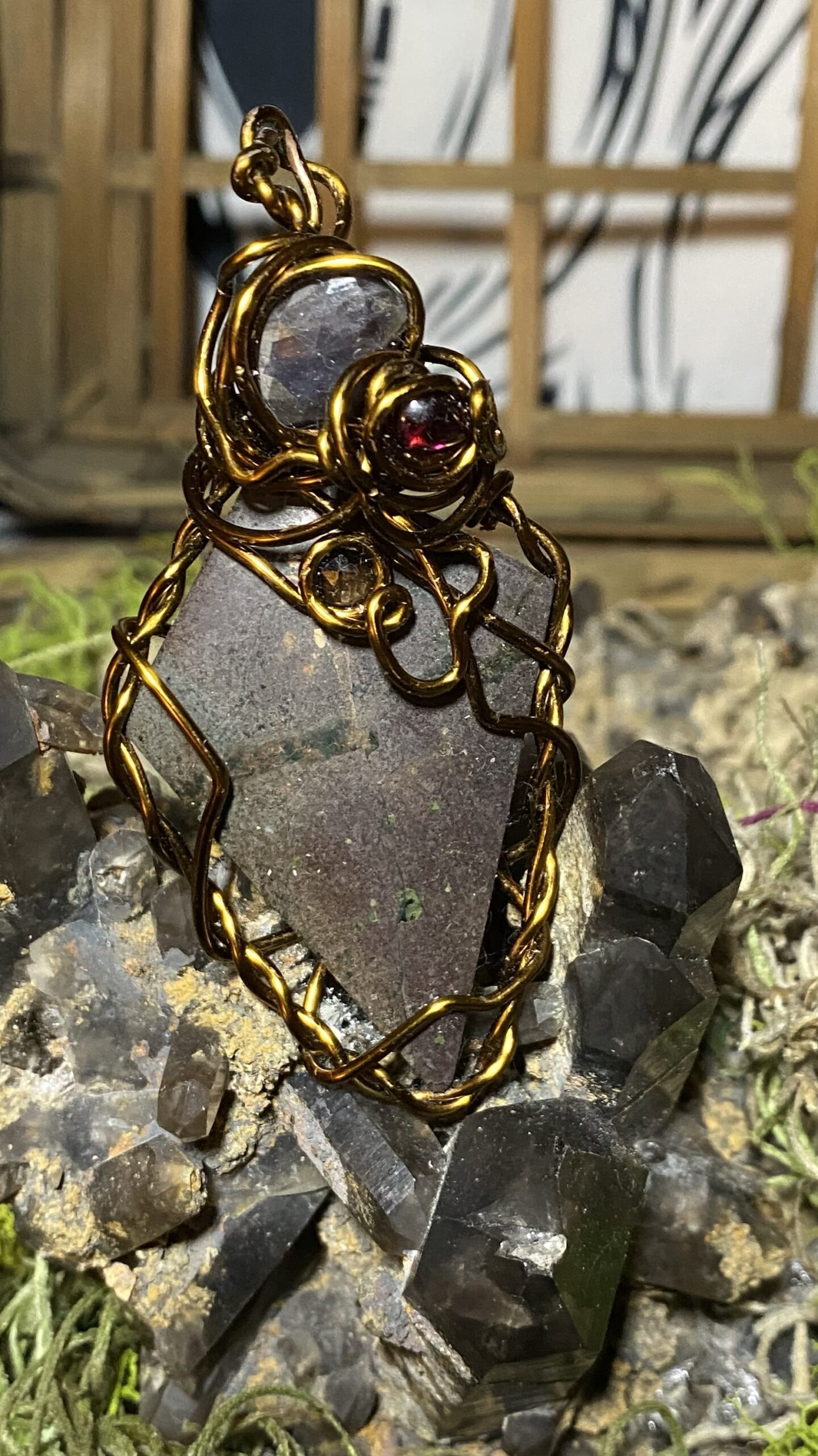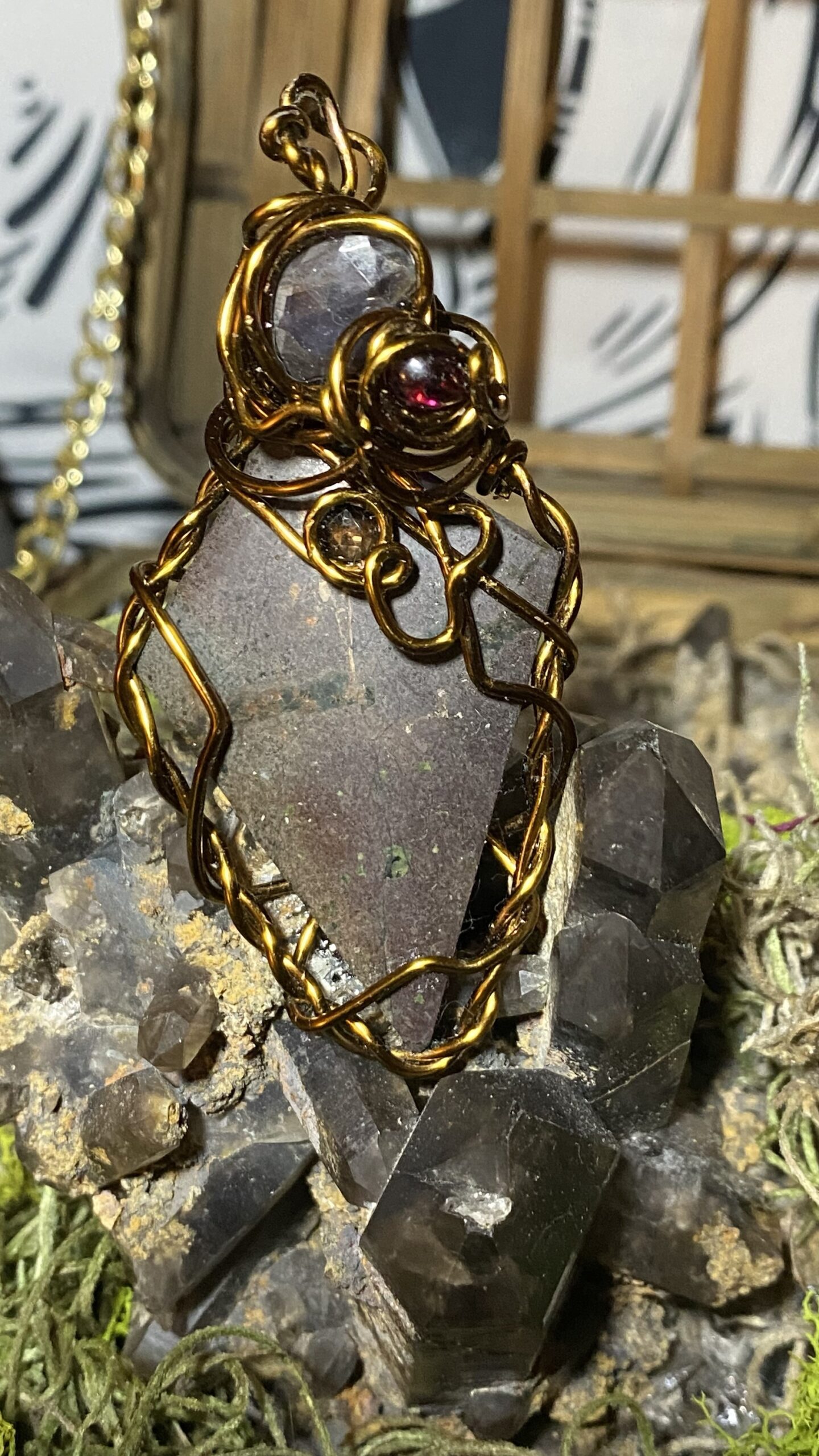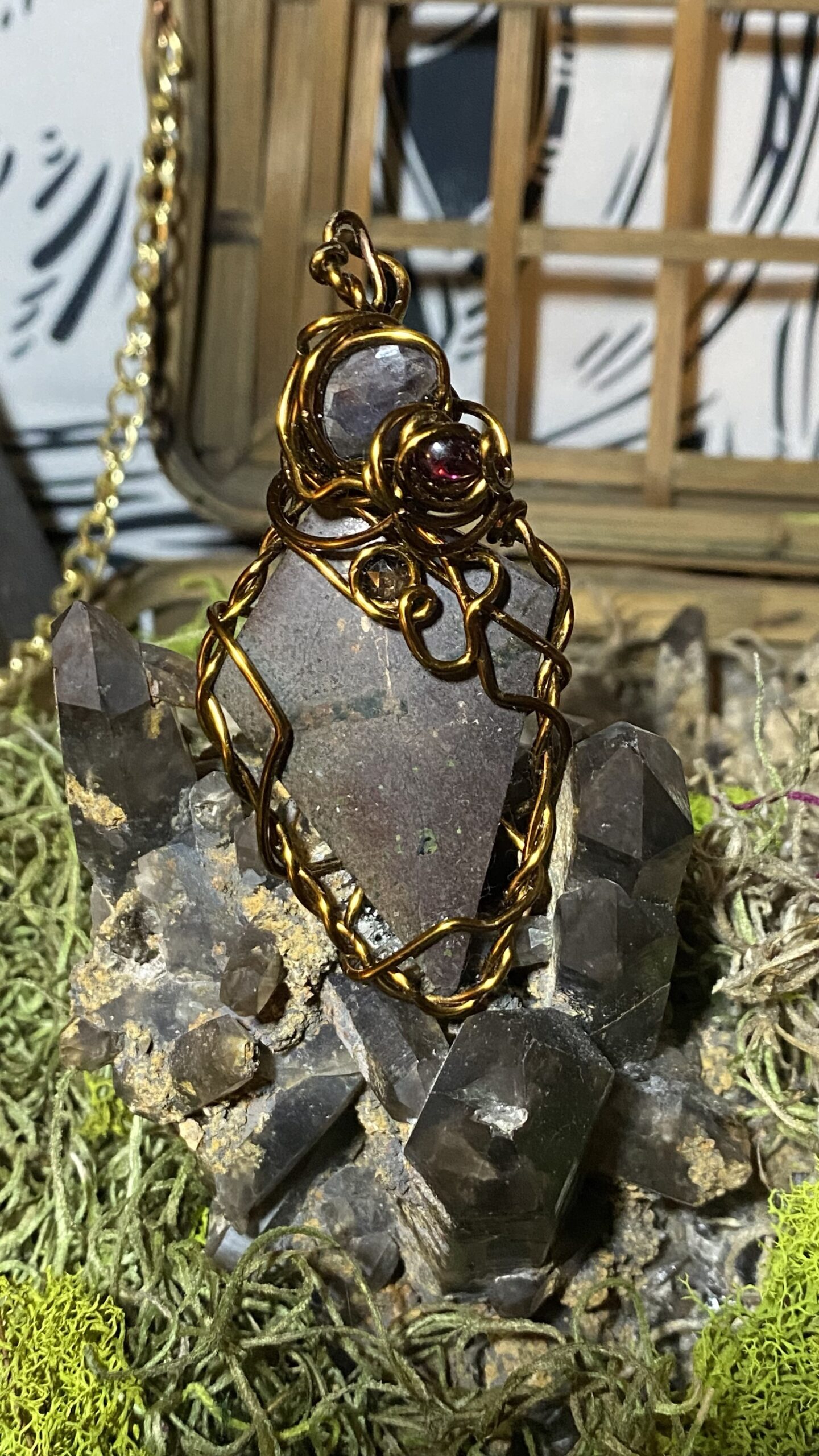 Copper with smoky quartz, garnet and sapphire wrapped in antique colored copper, comes hung on a raw copper chain