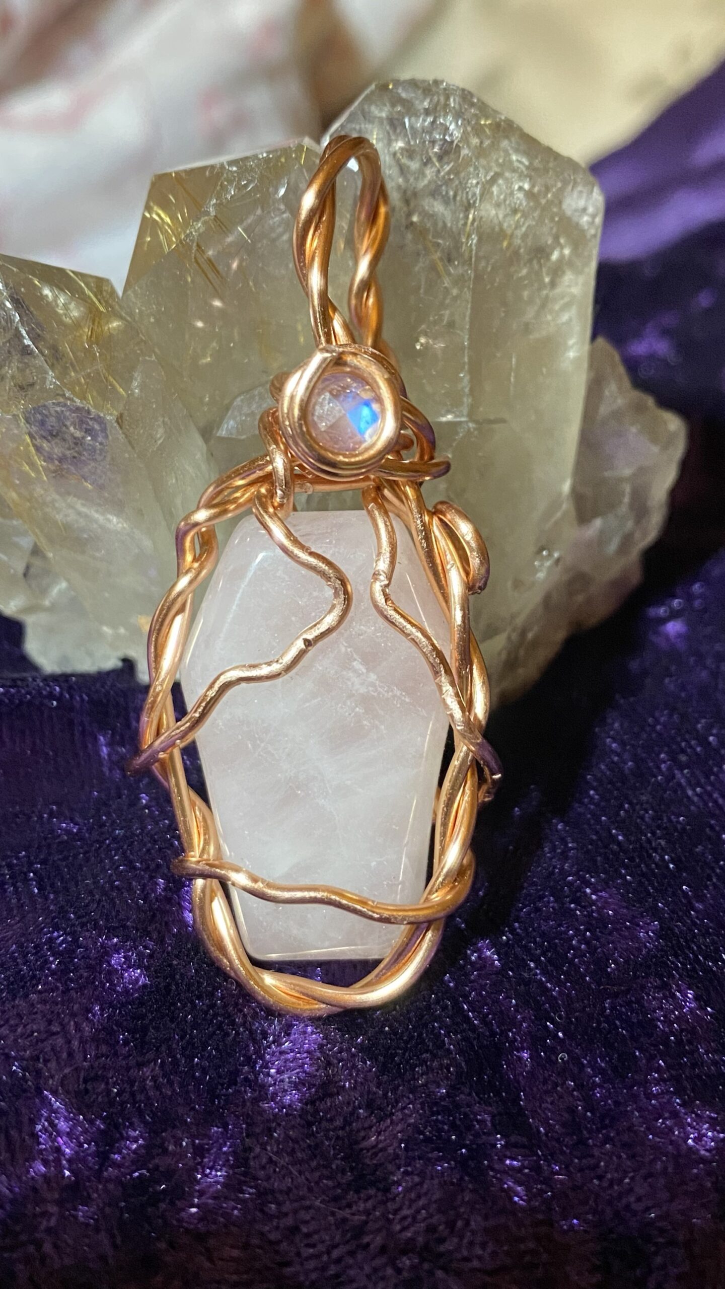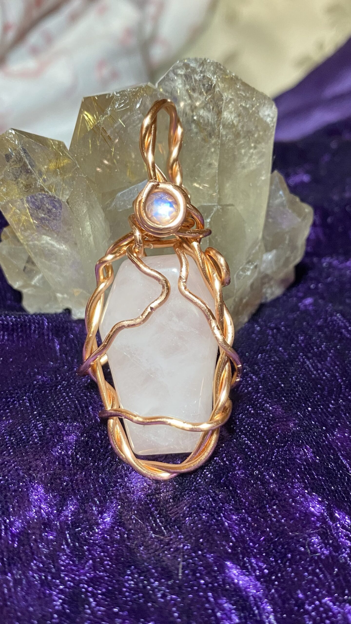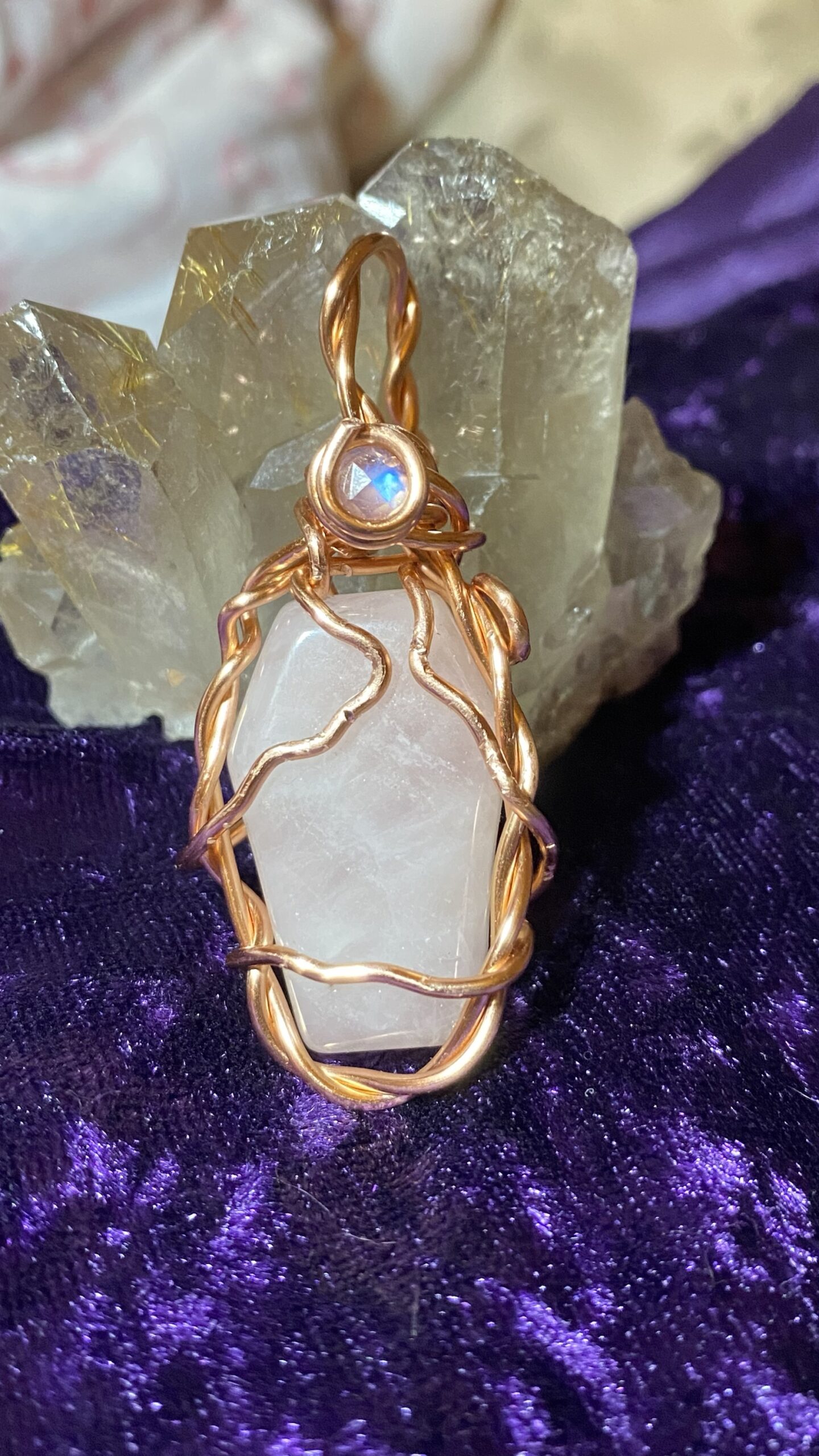 Rose quartz and moonstone wrapped in raw copper, comes hung on a raw copper chain