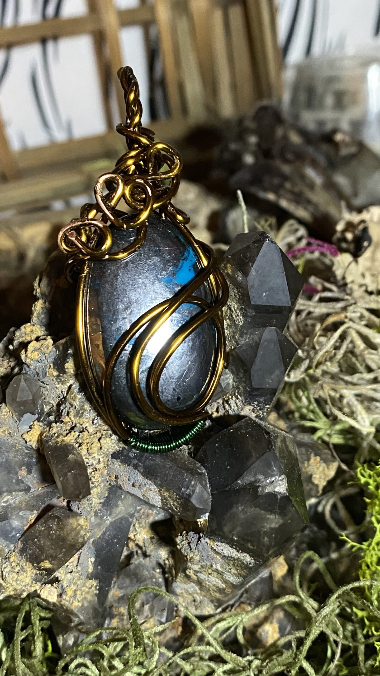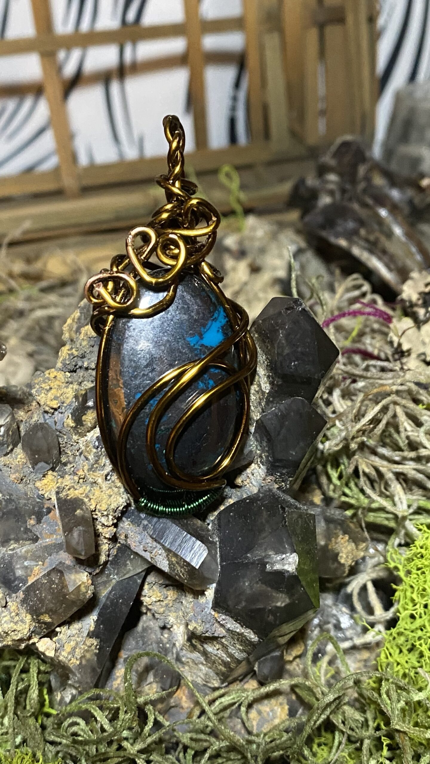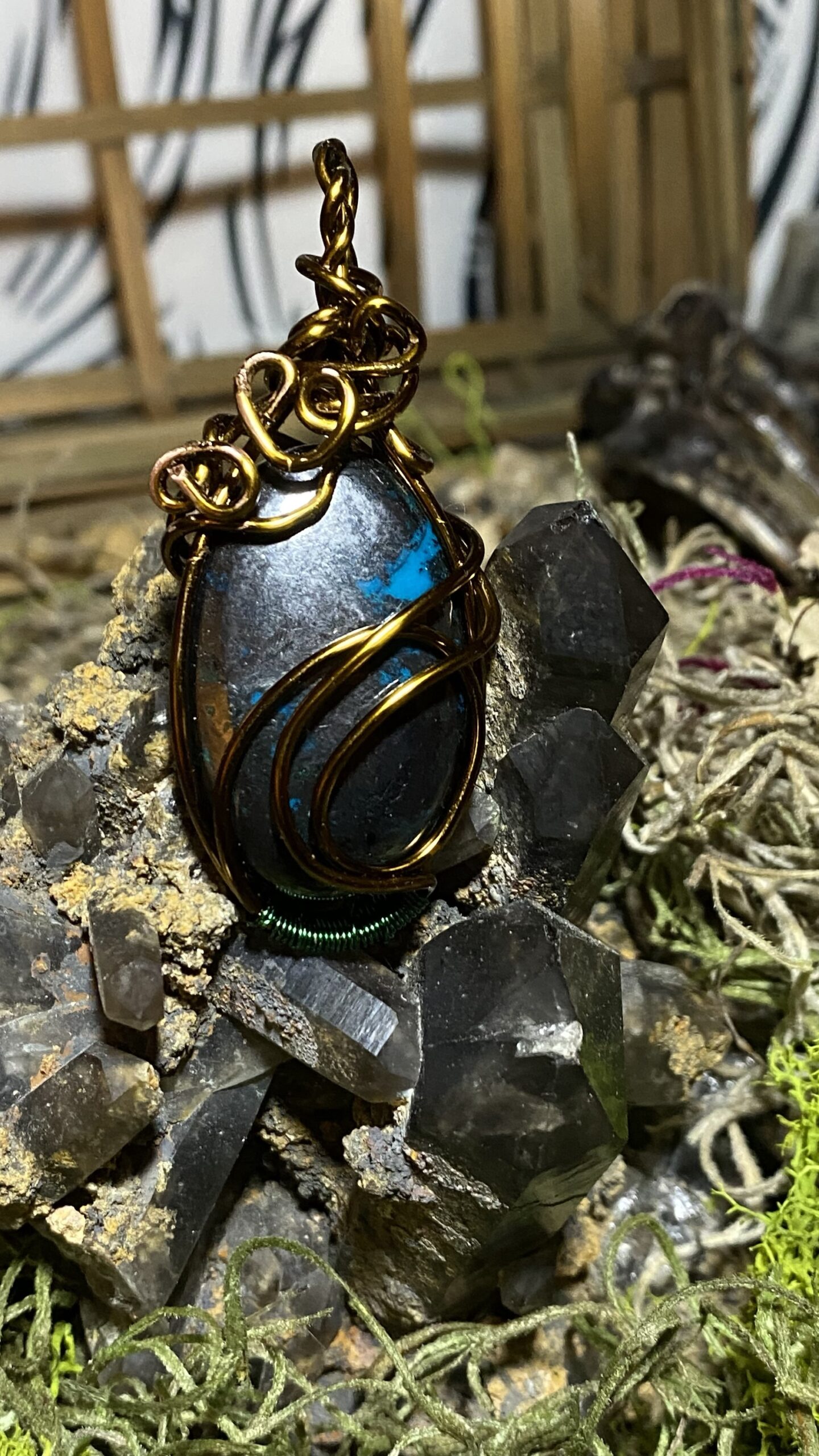 Shattuckite wrapped in antique colored copper and hung on a black metal chain