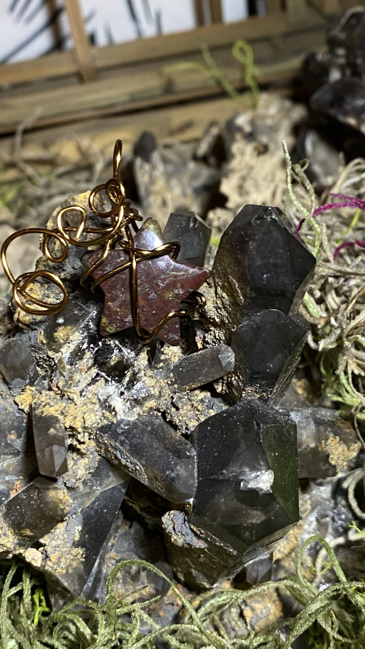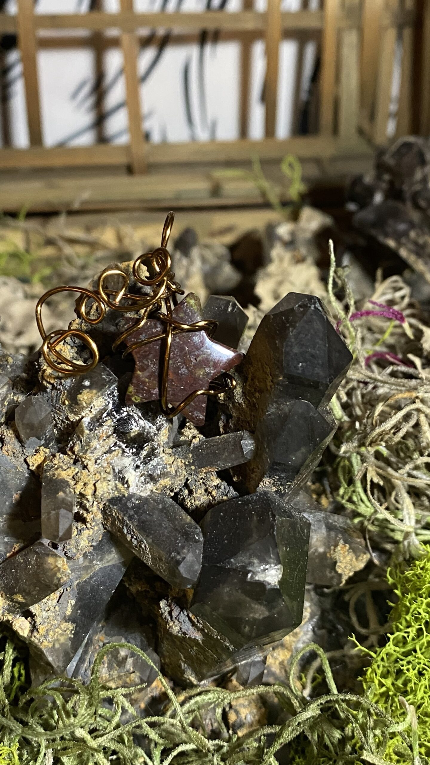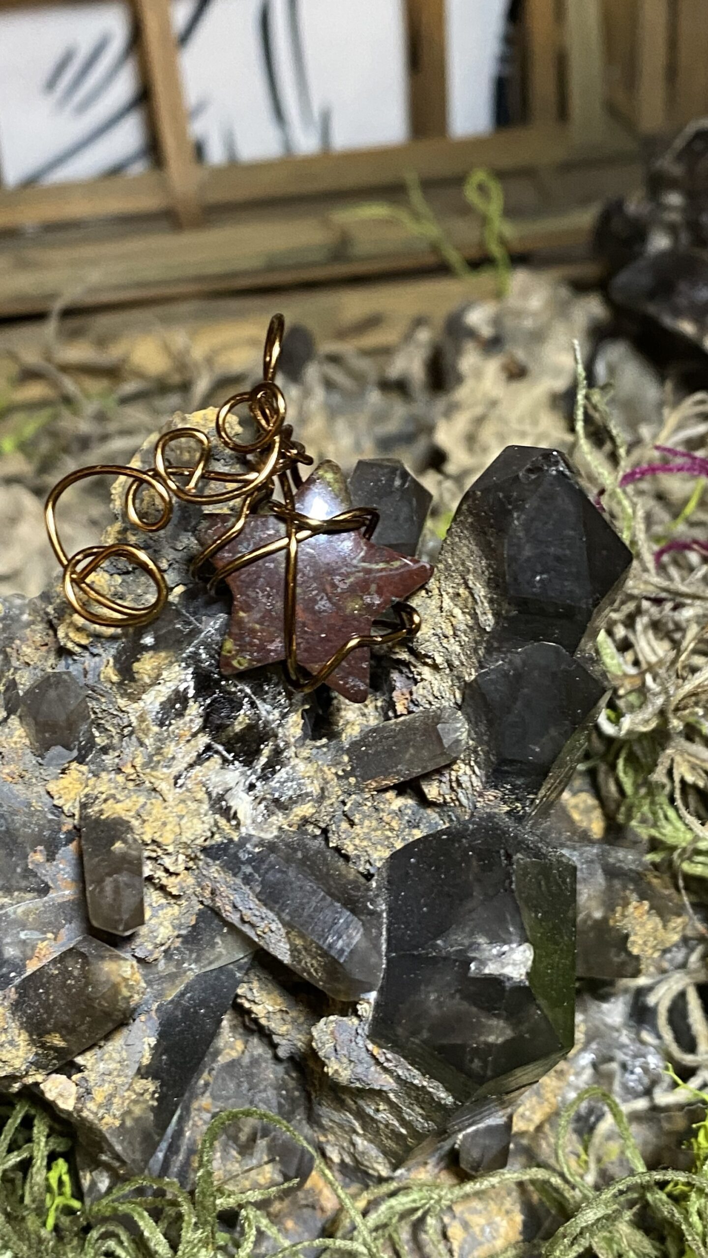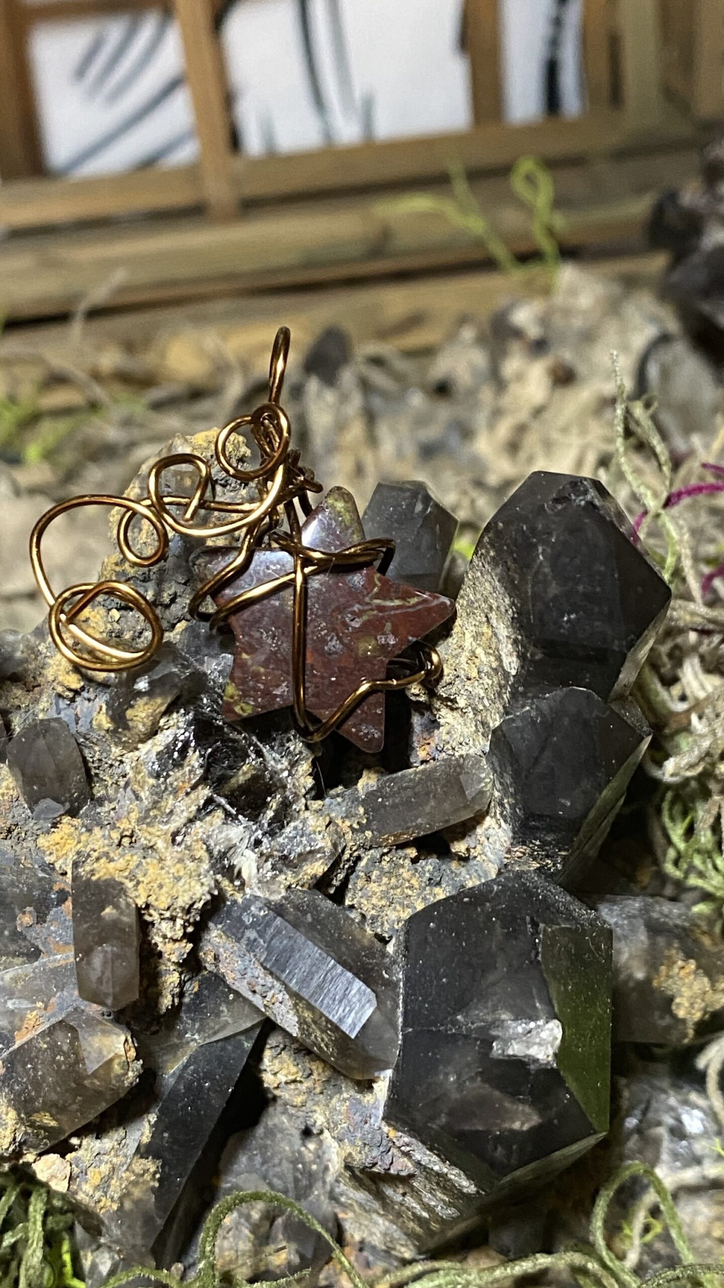Bloodstone star mini wrapped in antique colored copper and hung on a brown silky cord choker