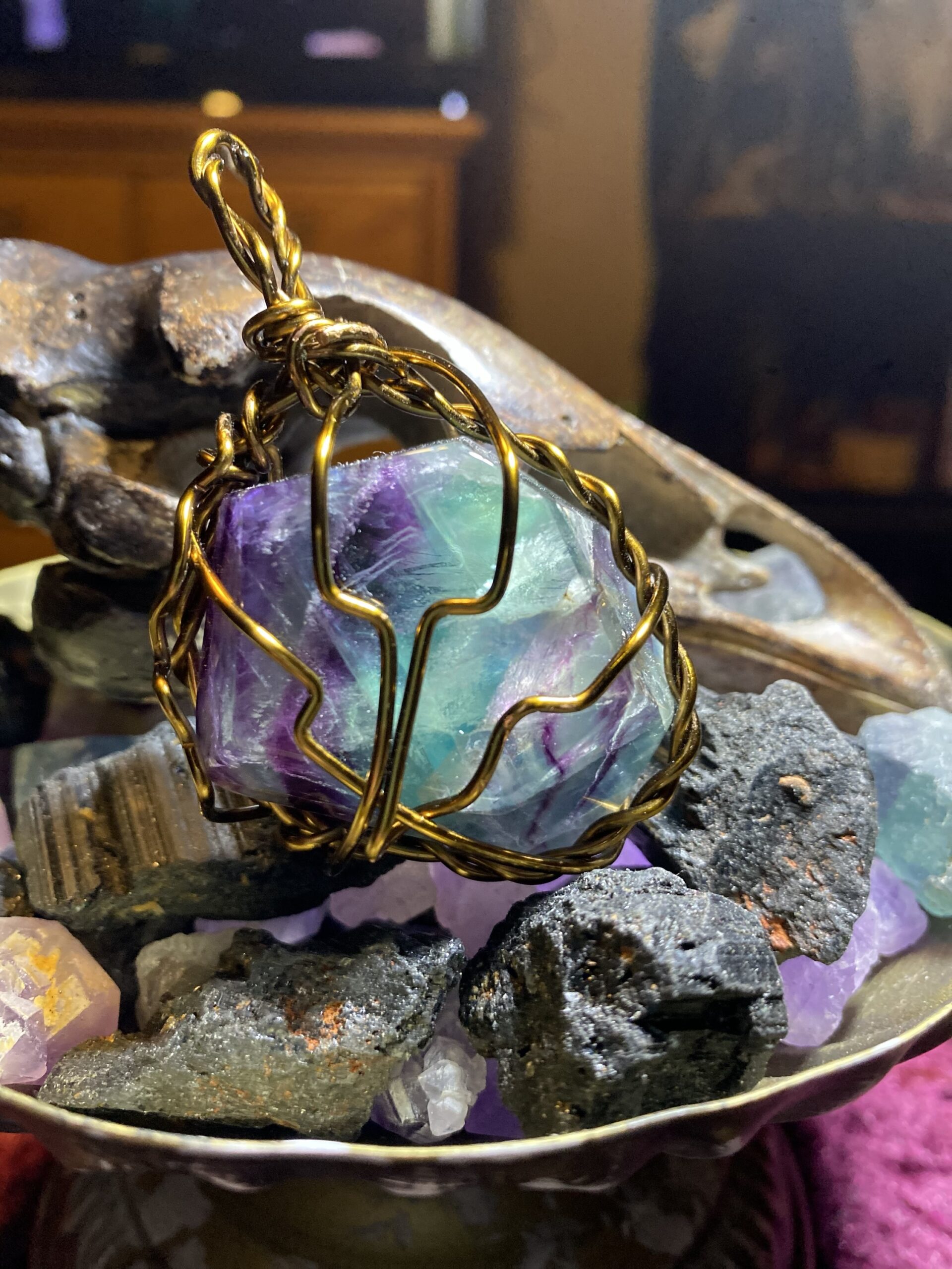 Gorgeous hunk of rainbow fluorite wrapped in antique colored copper, comes hung an antique colored metal chain