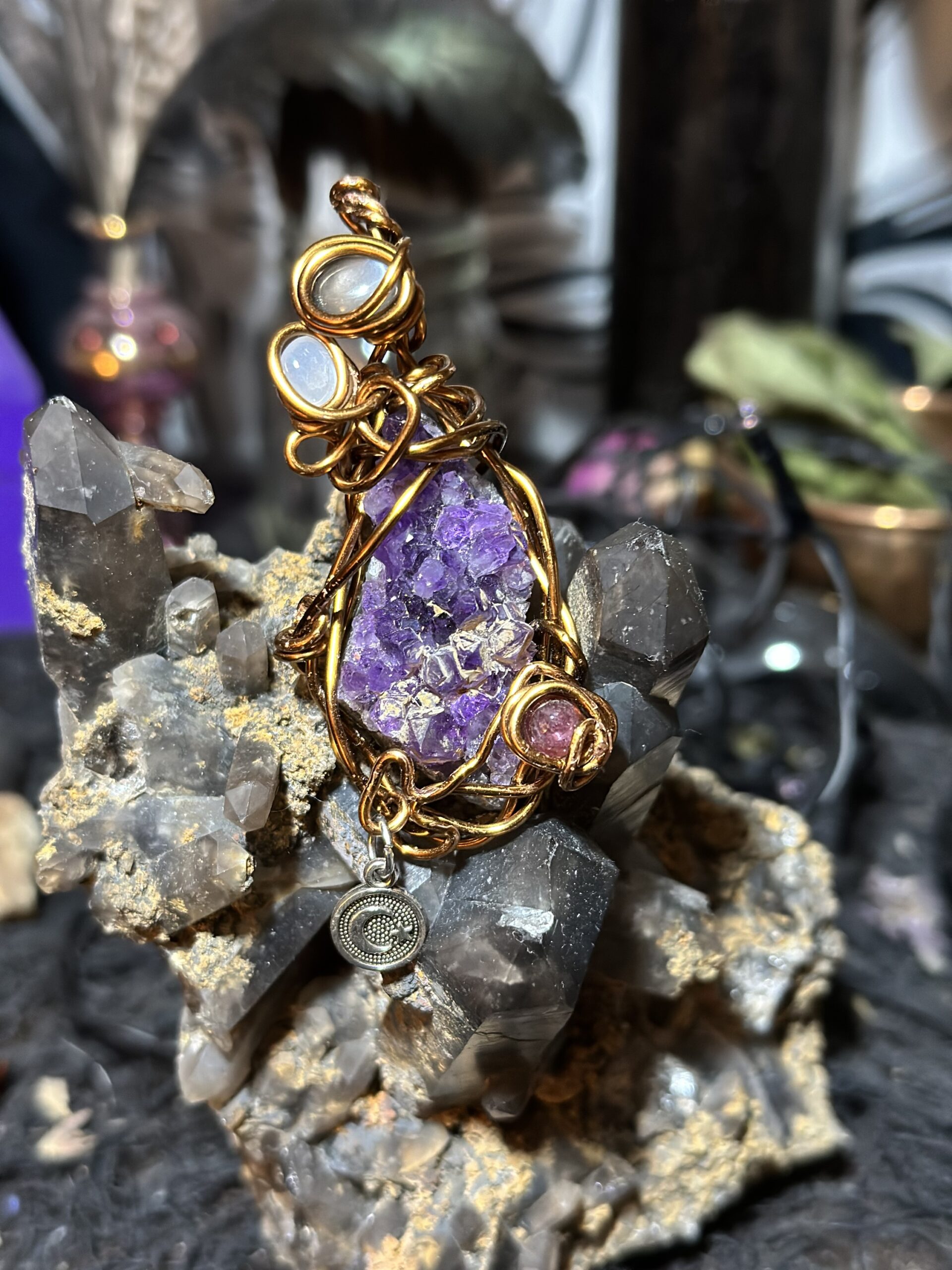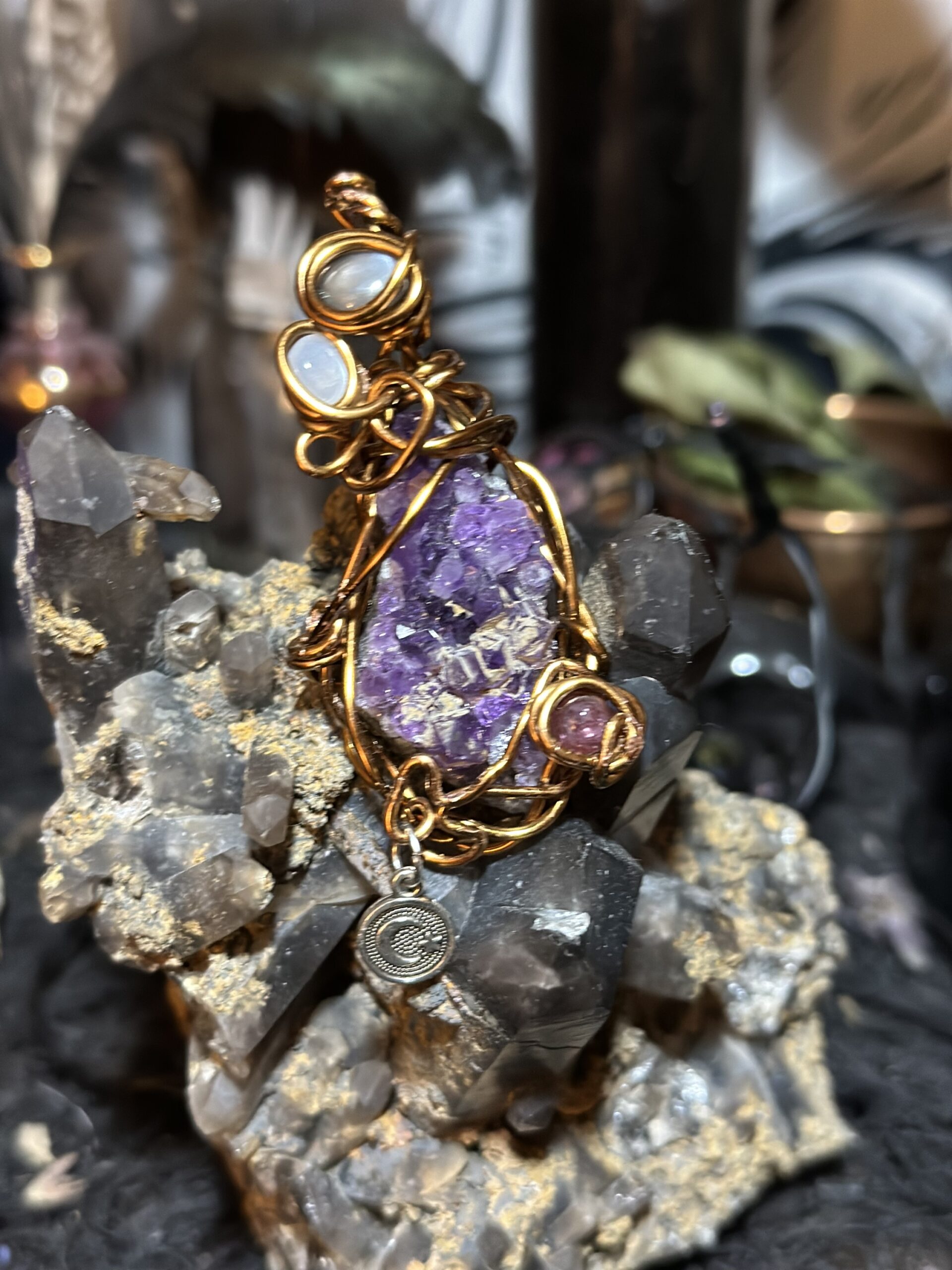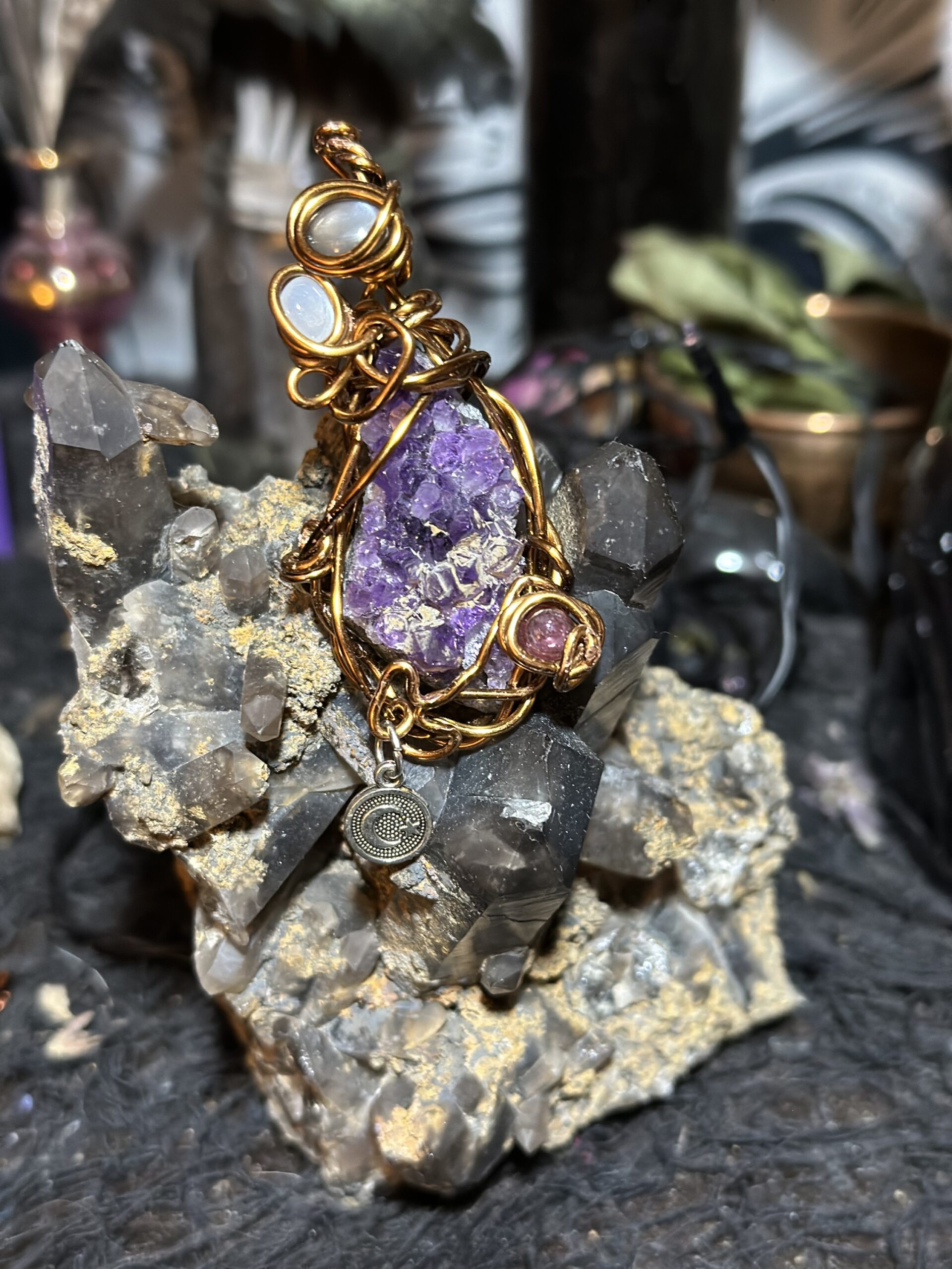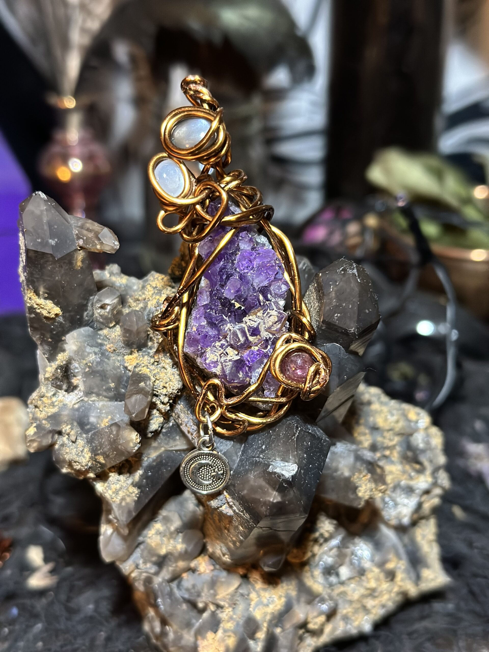 Amethyst geode paired with grey moonstone, moonstone and pink tourmaline with a silver toned crescent moon and star charm, wrapped in antique colored copper and hung on a copper chain