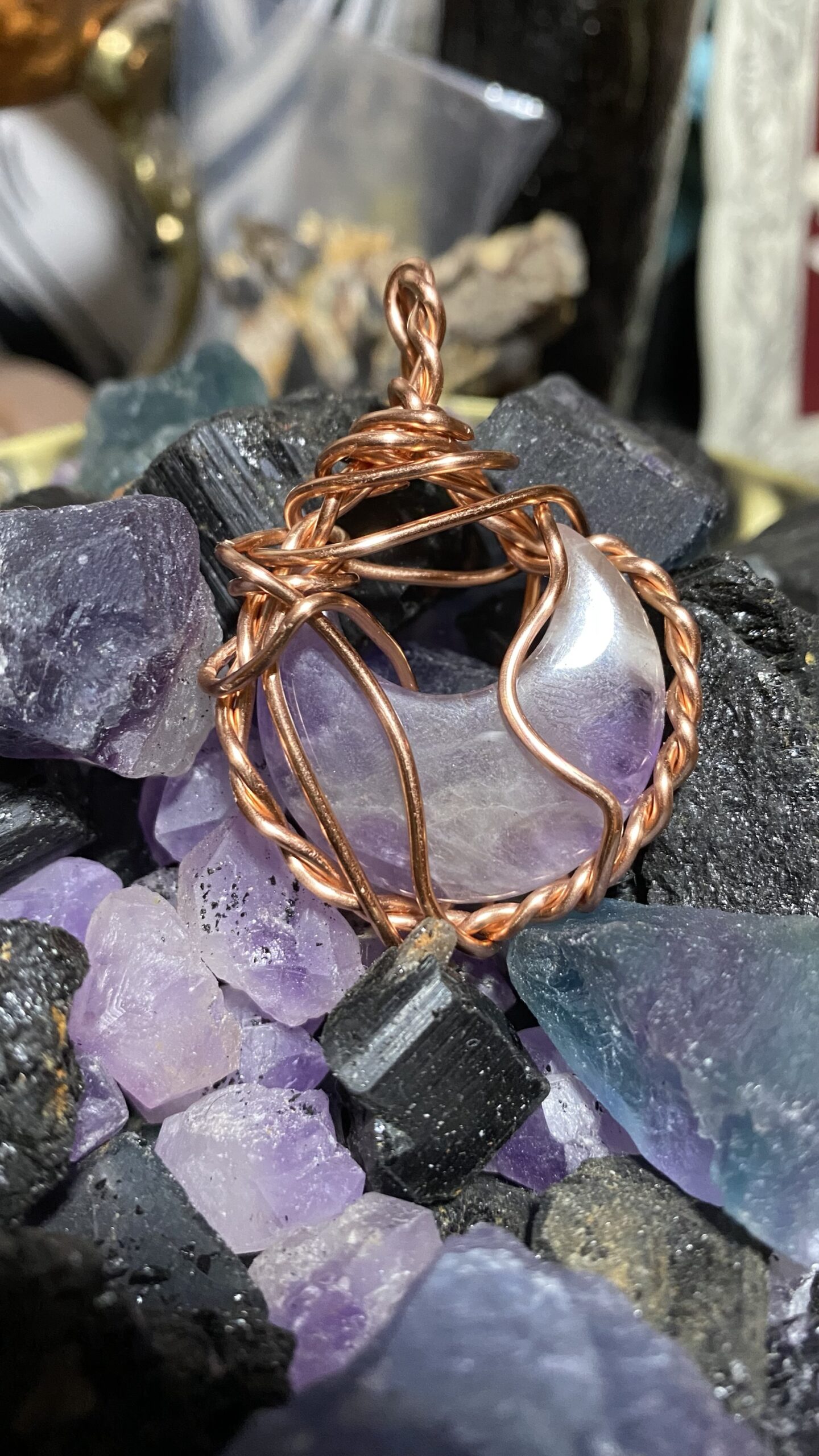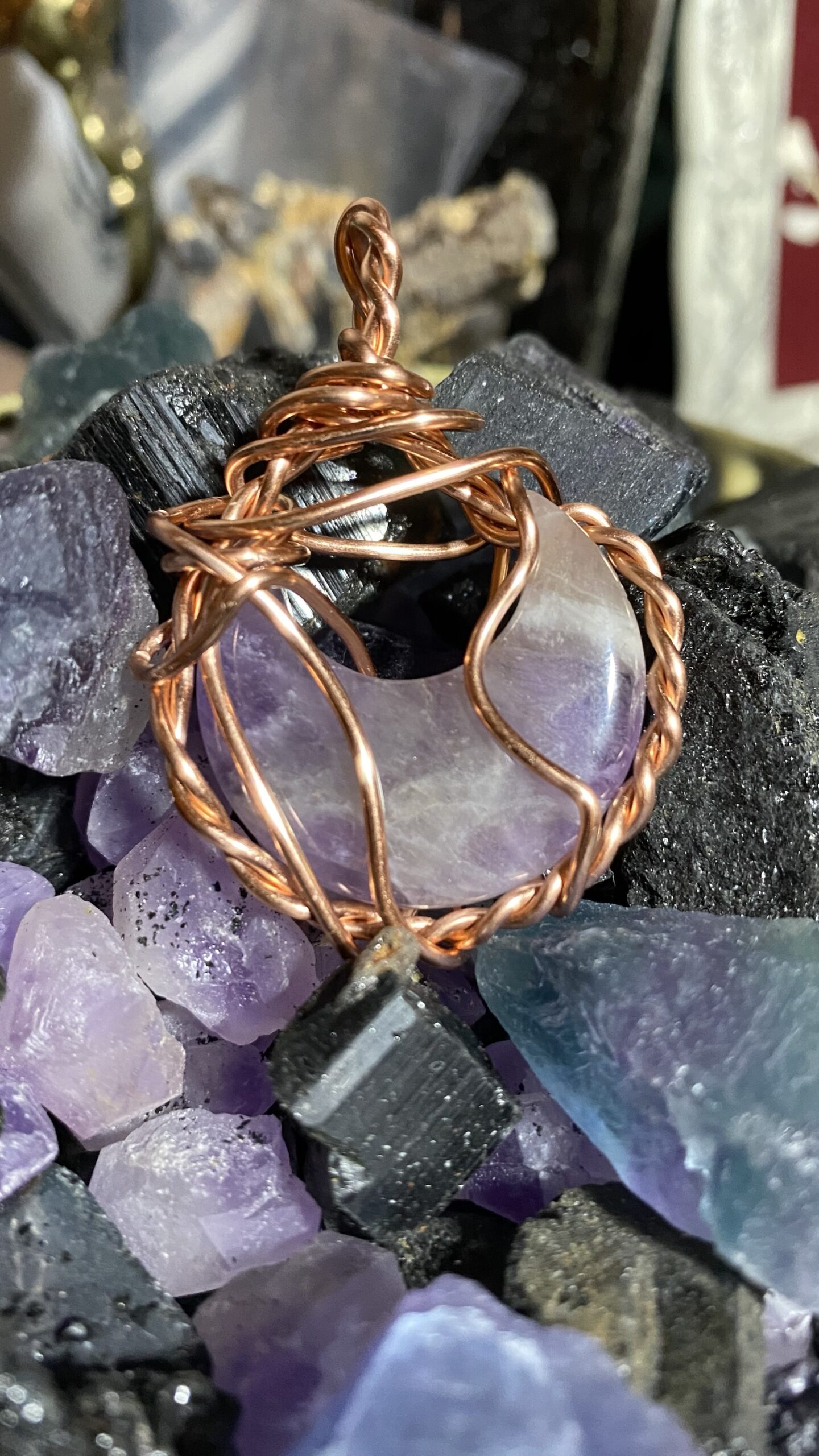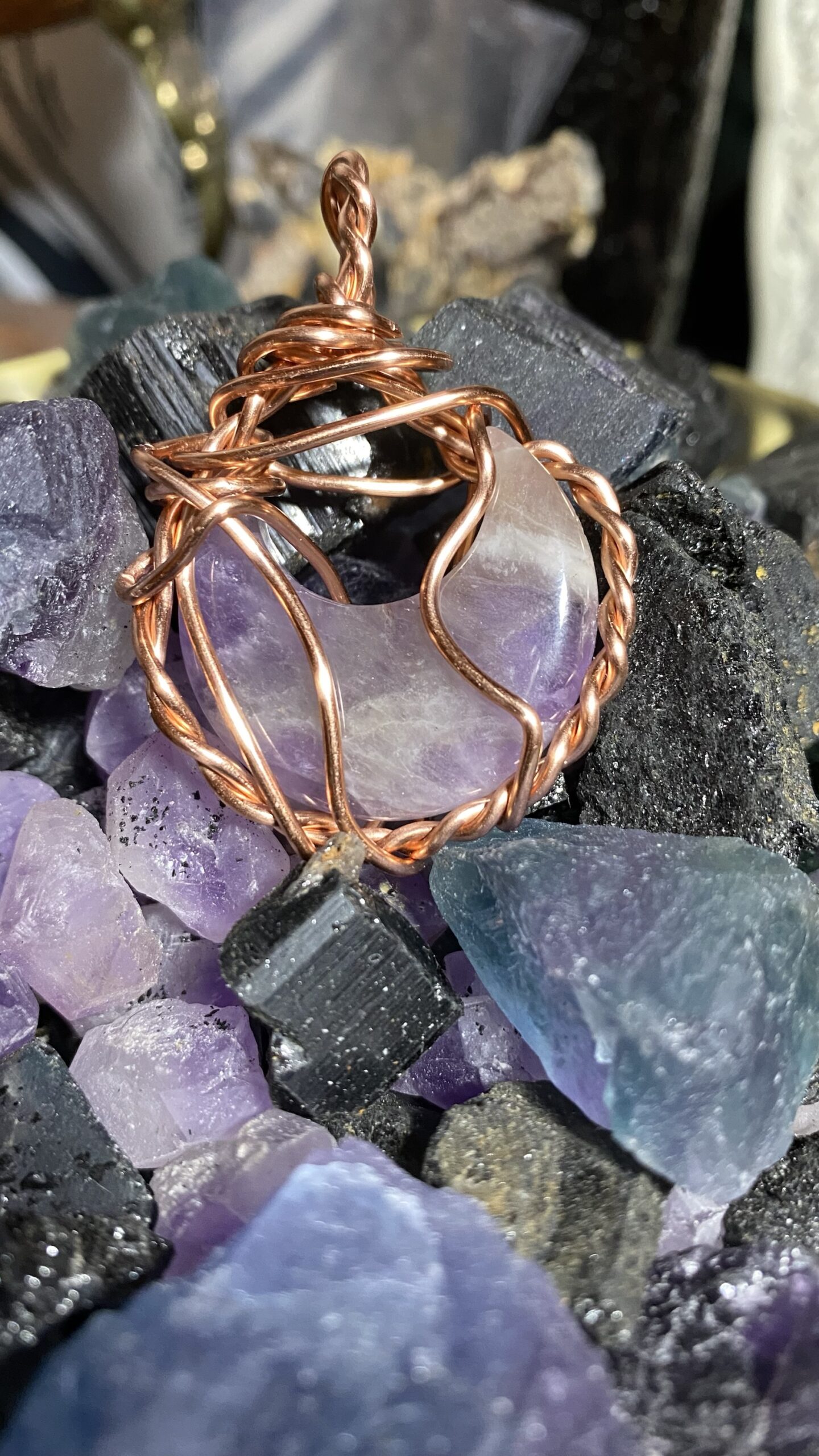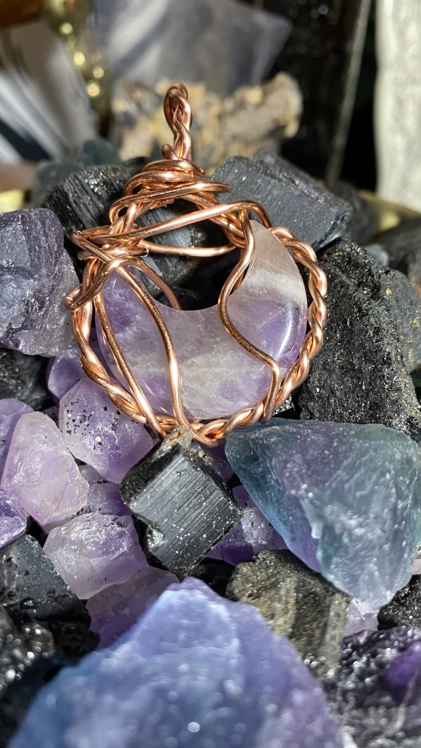 Amethyst moon wrapped in raw copper, hung on a raw copper chain