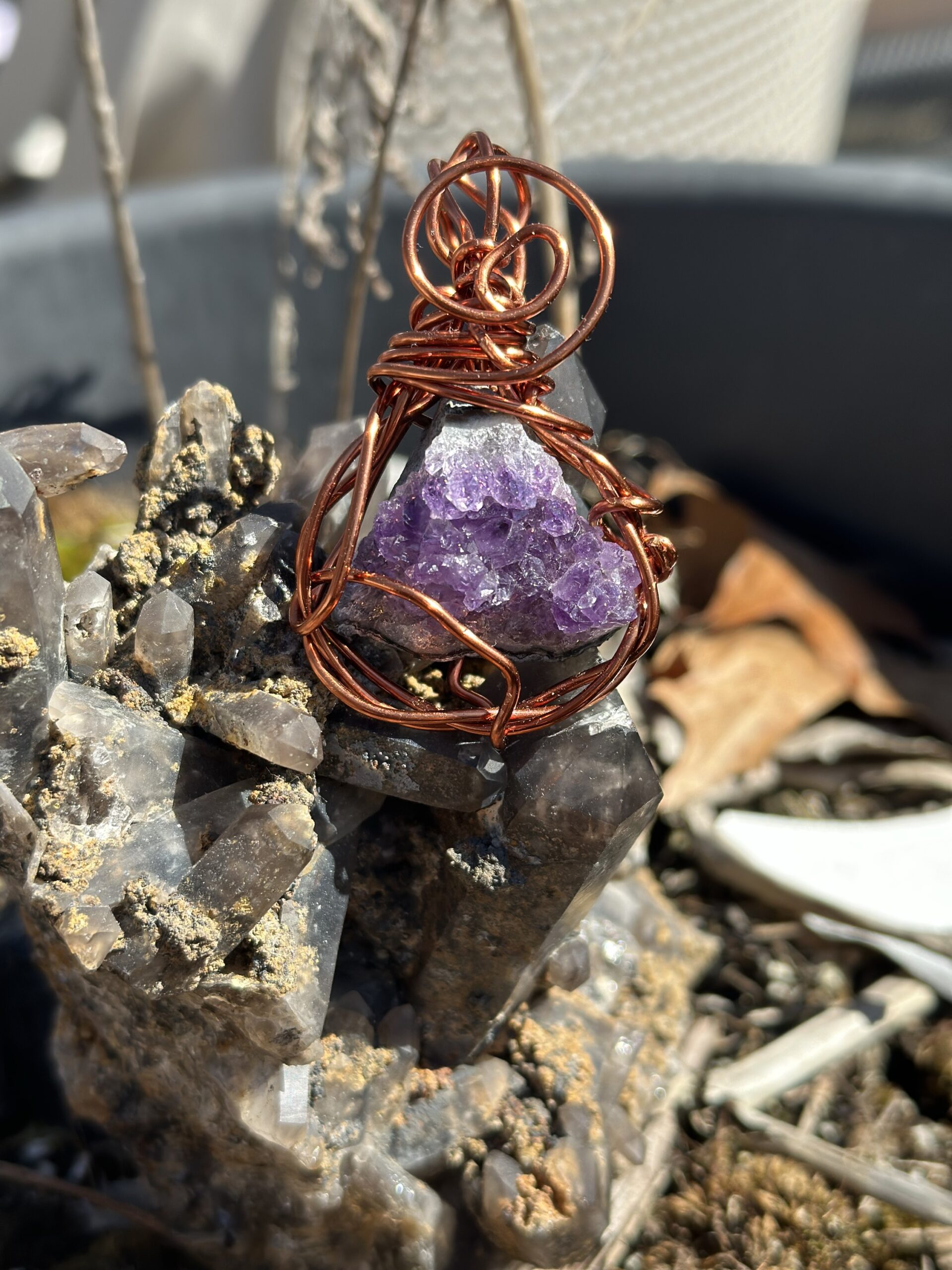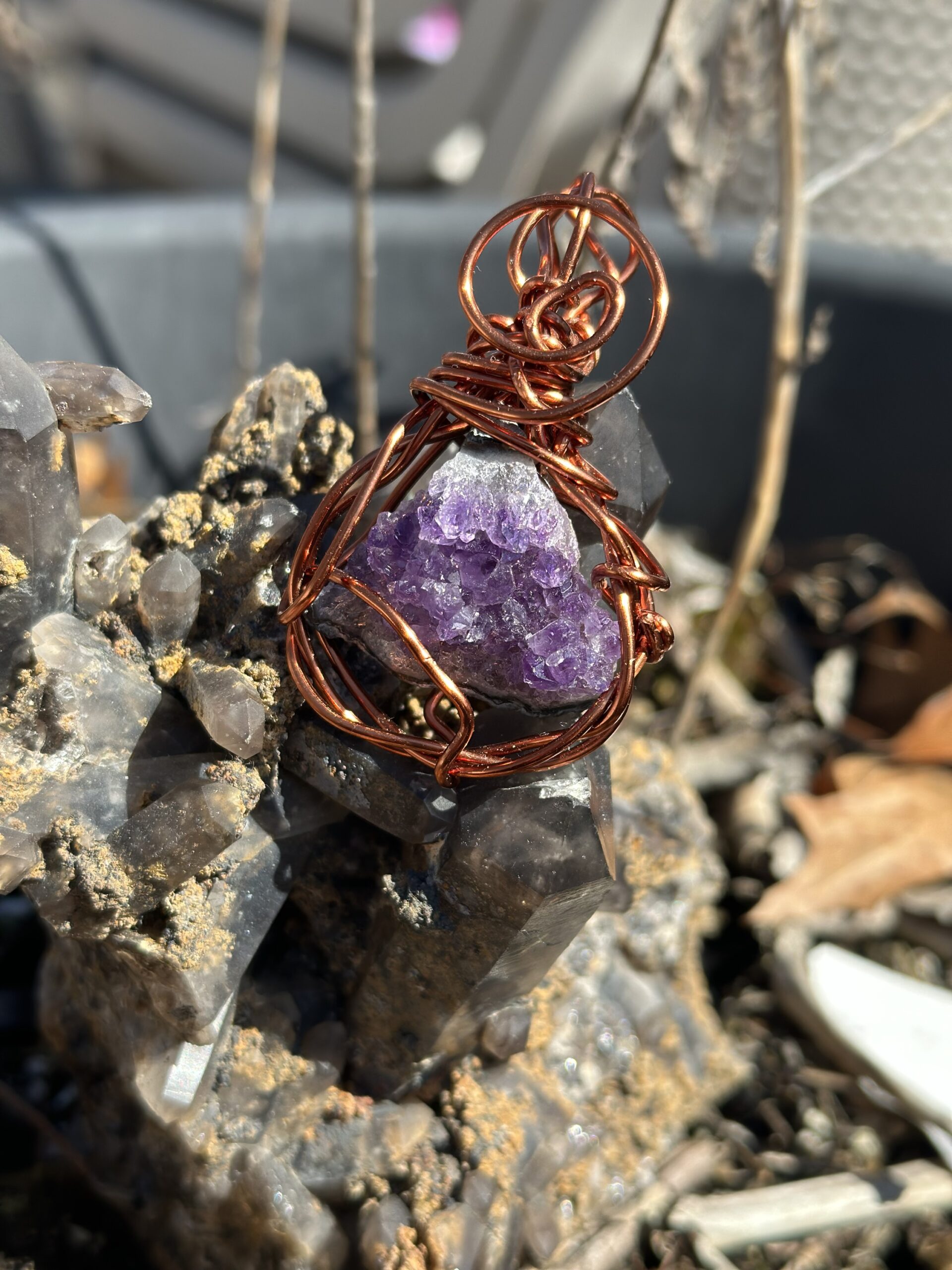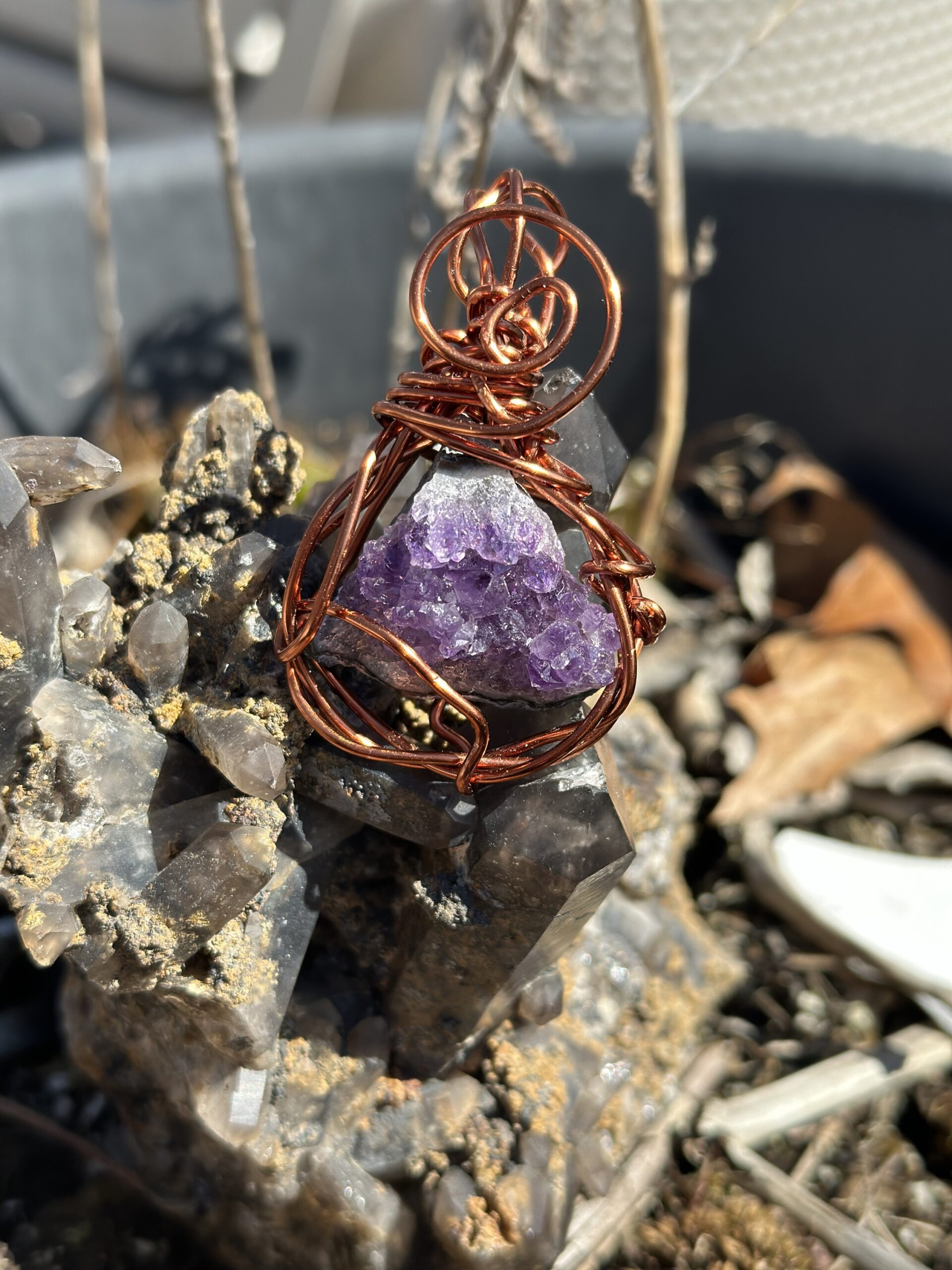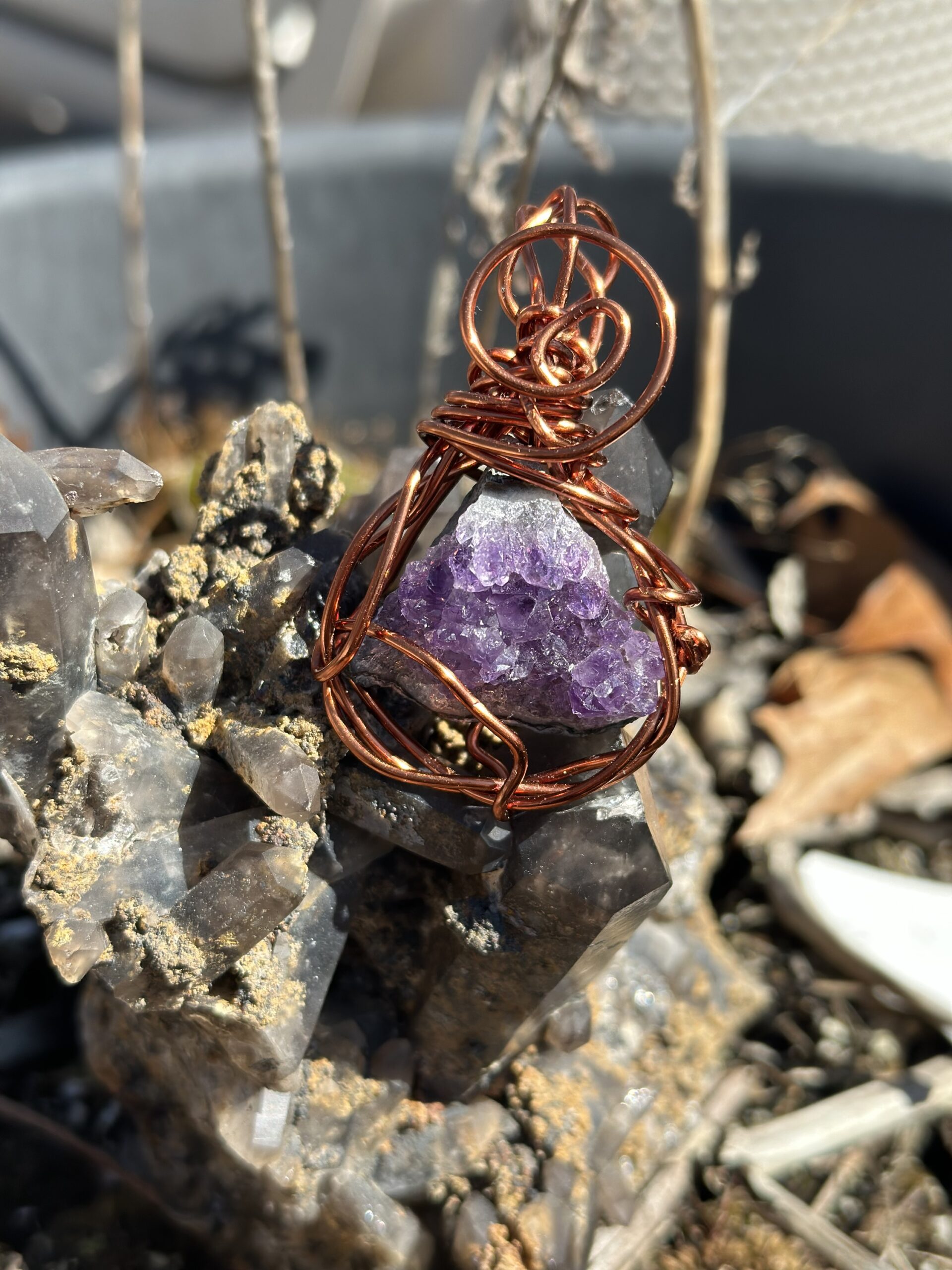 Gorgeous amethyst geode hunk wrapped in chocolate colored copper wire, hung a raw copper chain